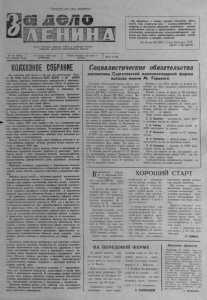 Пролетарии всех С1ран, соединяйтесь! Орган Северного райкома КПСС и районного Совета народных депутатов Новосибирской области № 10 ( 4 6 7 2 ) 1 24 января 1978 года Газета выходит три раза в Год издания 43-й ВТОРНИК неделю Мы обращаемся к нашему славному колхозному крестьянству, всем труженикам села — активно включайтесь в движение за достижение наивысшей урожайности сельскохозяйственных культур и продуктивности животноводства, увеличивайте производство всех сельскохозяйственных продуктов для более полного удовлетворения растущих потребностей населения и народного хозяйства! (Из Письма ЦК КПСС, Совета Министров СССР, { ВЦСПС и ЦК ВЛКСМ) КОЛХОЗНОЕ СОБРАНИЕ Все советские люди живут в эти дни под впечатлением Письма ЦК КПСС, Совета Министров СССР, ВЦСПС и ЦК ВЛКСМ партийным, советским, хозяйственным, профсоюзным и комсомольским организациям, трудящимся Советского Союза «О развертывании социалистического соревнования за выполнение и перевыполнение плана 1978 года и усилении борьбы за повышение эффективности производства и качества работы». Письмо определяет конкретные пути дальнейшего экономического и социального развития советского общества, направляет трудящихся страны на новый подъем общественного производства, повышение качества всей нашей работы. Коллективы колхозов района, подводя итоги социалистического соревнования второго года десятой пятилетки, сверяют ритм своего труда с задачами, определенными перед тружениками села в Письме Центрального Комитета нашей партии, намечают рубежи последующего развития полеводства и животноводства, повышения эффективности сельского хозяйства. Итоги работы 1977 года говорят о том, что у тружеников села есть все возможности не только успешно выполнить государственные планы, но и добиться большего. За последнее время в хозяйствах района значительно укрепилась материальная база, пополнился парк машин и механизмов, накоплен опыт получения высоких надоев в животноводстве. Важное значение в этом будут иметь колхозные отчетные и отчетно-выборные собрания, которые, согласно Уставу колхоза, начнутся в феврале 1978 года. Колхозные собрания станут важным этапом в дальнейшей мобилизации тружеников сельского хозяйства за увеличение производства молока и мяса, повышение качества сельскохозяйственной продукции, укрепление дисциплины и организованности, совершенствование демократических основ управления колхозным производством. Первичные партийные, профсоюзные и комсомольские организации, хозяйственные руководители и специалисты колхозов должны уделять самое серьезное внимание подготовке и проведению собраний. Собрание должно пройти в обстановке высокой организованности, принципиальной критики и самокритики, с привлечением широких масс рядовых колхозников, сельского актива, специалистов и руководителей к решению насущных вопросов социально- экономического развития хозяйства, в- атмосфере высокой активности, широкого обсуждения отчетов правлений и ревизионных комиссий, при строгом соблюдении Устава и колхозной демократииДо проведения отчетных и отчетно-выборных собраний необходимо организовать предварительное обсуждение итогов финансово- хозяйственной деятельности колхозов за 1977 год в бригадах, животноводческих фермах, во всех производственных подразделениях, где