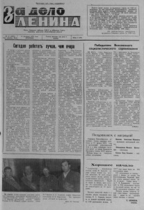 2 11 i1 1М 111111111111П I Щ 1111111! 1111! 1111111111111111111i ш 11111111 П 1111111м1 111 1П |I I I «ЗА ДЕЛО ЛЕНИНА» .ишш1ШМ111ШШ111ШМ111Н111Ш114 февраля 1978 года ♦ № 19 Активно включиться в общенародную борьбу и с п о л ь з о в а т ь в с е в о з м о ж н о с т и д л я БОЕВЫЕ ЗАДАЧИ ТРУЖЕНИКОВ РАЙОНА 9 февраля 197 8 года состоялось совещание « передовиков промышленного и сельскохозяйственного производства района. На совещании был заслушан доклад председателя Северного райисполкома Г. И. Ивашкевича «Об итогах юбилейного 1 9 7 7 года и задачах трудящихся района на 1 9 7 8 год». — В центре внимания советских людей,— .отметил Г. И. Ивашкевич,— находятся сейчас решения декабрьского ( 1 9 7 7 г.) Пленума ЦК. КПСС, восьмой сессии Верховного Совета СССР, речь на Пленуме Генерального секретаря ЦК КПСС,Председателя Президиума Верховного Совета СССРтов. Л. И. Брежнева, поставившего ряд важных вопросов дальнейшего развития экономики страны. Докладчик подробно остановился на основных показателях выполнения государственных планов промышленностью и сельским хозяйством страны, сделал глубокий анализ деятельности производственных коллективов района за истекшие два года пятилетки. Отмечено, что за два года пятилетки район под руководством партийной организации добился новых успехов в социалистическом соревновании. Коллективы промышленных предприятий выполнили планы юбилейного года по производству промышленной продукции на 1 1 2 процентов. Объем промышленного производства'за два года выросло сравнению с 1 9 7 5 годом на 1 4 ,7 процента. План реализации промышленной продукции перевыполнен на 7 ,9 процента, или реализовано сверхплановой продукции на 7 3 0 тысяч рублей. Рост реализуемой промышленной продукции за 1 9 7 6 — 1 9 7 7 годы составил 1 8 , 5 процента. В 1 9 7 7 году, в целом за два года пятилетки, выполнен план реализации бытовых услуг населению. Их объем увеличен на 2 0 , 7 процента и доведен в -расчете на душу населения до 15 рублей против 12 рублей 5 6 копеек в 1 9 7 5 году. Перевыполнен план производства продукции Северным лесхозом на 4 ,9 процента. План производительности труда выполнен на 111 процентов, за счет чего получено дополнительно валовой продукции на сумму 2 6 , 8 тысячи рублей. Темпы роста производительности труда превышают в этом коллективе рост заработной платы на 5 процентов. Отмечена положительная работа в юбилейном году коллектива Северного участка Куйбышевской ПМК-64, возглавляемого коммунистом Н. И. Завидовым. Коллектив участка выполнил объем строительно-монтажных работ на 4 8 4 , 6 тысячи рублей при плане 3 2 5 тысяч. Выполнен план строительно-монтажных работ передвижной межколхозной строительной организацией на 103 процента. Освоено в целом 3 7 4 0 , 3 тысячи рублей. За два прошедших года выполнен значительный объем работ по капитальному строительству. Вложения на новое строительство в 1 9 7 6 — 77 годах составили 7 0 8 1 , 1 тысячи рублей. За это время введены в эксплуатацию Бергульская восьмилетняя школа, здание детского сада в селе Гражданцево на 50 мест, интернат в селе Чебаки на 50 мест, 7 километров поселкового водопровода, большое число производственных ..помещений в колхозах. Введены в эксплуатацию 4 1 5 0 квадратных метров жилья. Выполнил свои обязательства коллектив райпо. Товарооборот в юбилейном году по сравнению с 1 9 7 0 годом увеличился на 3 4 3 1 , 9 тысячи рублей и составил более 10 миллионов рублей. Повысилась оплата