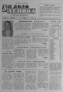 Пролетарии всех стран, соединяйтесь! Орган Северного райкома КПСС и районного Совета народных депутатов Новосибирской области № 23 ( 4685) 21 февраля 1978 года Газета выходит три раза в й ВТОРНИК неделю Цена 2 коп. НОВЫЕ РУБЕЖИ Киев. Ком плектование механизи рованных о т р яд о в и зв ен ьев по возделыванию кук у р у зы первыми в республике завершили, сегодня земледельцы передового на Днепропетровщине Ни колаевского района. К аж д ы й из трехсот механизаторов получил свидетельство об окончании школы передового опыта , которые были организованы на б а з е лучших хо зяйств. В минувшем году 550 хозяйств республики, примен яя прогрессивную технологию выращивания и уборки этой цен ной ку льту ры, получили по 50 и более центнеров зер н а с гектара. Земледельцы Украины нацелены на высокий р у б еж : произвести зерна кук урузы вдвое больше, чем во втором году пятилетки. З а в е р ш а е т с я В Чувашинской бригаде в основном завершен ремонт сельхозинвентаря к весенне-полевым работам. Уже поставлены на линейку готовности четыре сеялки, три лущильника, около 50 борон. Осталось отремонтировать в бригаде одну сеялку, один лущильник и 'часть сцепок. — С 15 марта будем производить капитальный и текущий ремонт четырех гусеничных и трех колесных тракторов. Уже поставил в мастерские С П Л А Н О М С Коллективу заготконторы Северного райпо на первый квартал текущего года доведено напряженное задание. По сравнению с прошлым годом план увеличен почти на сорок процентов. Как показывают итоги, задание это вполне реально. В январе объем заготовок и закупок сельхозпродуктов составил 2 2 5 3 6 рублей, или 104 процента к доведенному заданию. Уже к середине февраля освоена большая часть плана второго месяца. Х О Р О Ш И Е р е м о н т свой трактор Василий Шеруков,— рассказывает бригадир комплексной бригады Владимир Ильин. — Все механизаторы, занятые на ремонте сельхозинвентаря, добросовестно трудятся. Особенно хорошей оценки заслуживает работа, Родиона Ильина, Виктора Гордеева, 'Александра Григорьева. В. ПОЗДНЯКОВА . П Р А В И Л И С Ь Особенно успешно складываются дела по выполнению закупок мяса, кожевенного сыры, шерсти. Коллектив работает в новом году слаженно, организованно, цо нужно особо отметить заслуги заготовителей Ф. II. Федорова, А. В, Мокроусова, которые свое задание по закупу сельхозпродуктов перевыполнили в полтора— два раза. С. П И Н И Н С К И Й , селькор. О К А З А Т Е Л И На снимке: Александра Ермо- да е в н а Нескорова, телятница кол хоза «П ам я ть Ленина». По итогам социалистического соревнования 1977 года рна признана лучшей телятницей. По ее группе среднесуточный привес на одного теленка со ставил 800 граммов. Причем у ж е многие годы Александра Ермолае вн а добивается высоких привесов и не д опускает п а д еж а тел ят. На недавно прошедшем р ай онном -совещании передовиков А. Е . ‘ Нескоровой вручена серебрян а я медаль ВДНХ. В райкоме ВЛКСМ Началась учеба В райкоме ВЛК.СМ со стоялся первый в нынешнем году семинар ком сомольского а к т и в а р ай о на. Н а ' семинаре присутствов али секретари первичных, цеховых комсомольских организаций, груп- комсоргн. Основными тем ами се минара были: планирование комсомольской работы, ведение д о кументов комсомольской органи зацией , р а б о т а с несоюзной молодежью, ty4CT членов ВЛКСМ. На семинаре выступили: з а в е дующий организационным отделом р 