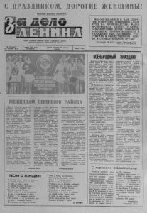 С ПРАЗДНИКОМ, ДОРОГИЕ ЖЕНЩИНЫ! Пролетарии всех стран, соединяйтесь! Орган Северного рай ком а КПСС и районного Совета народных деп утатов Новосибирской области № 29 (4691) 7 м а р та 1978 года Год издания 43-й ВТОРНИК Г азета выходит три р а з а в неделю Цена 2 коп. МЫ ОБРАЩАЕМСЯ К ВАМ, Д О РО ГИЕ СОВЕТСКИЕ Ж Е Н Щ И Н Ы , - В А Ш Т Р У Д НА ПРОИЗВОДСТВЕ , В АШ А МАТЕРИНСКАЯ З А Б О Т А О СЕМЬЕ, О ВОСПИТАНИИ ДЕТЕЙ СНИСКАЛИ ВСЕОБЩУЮ ПРИЗНАТЕЛЬНОСТЬ И УВАЖЕНИЕ! ЕЩЕ АКТИВНЕЕ У Ч А СТВУЙТЕ В ОБЩЕСТВЕННОЙ Ж И З НИ И СОЗИДАТЕЛЬНОМ Т Р У Д Е ! [И з П и с ь м а Ц К К П С С , С о в е т а М и ни стр о в С С С Р , В Ц С П С и ЦК ВЛКСМ] ш ш Щ ЖЕНЩИНАМ СЕВЕРНОГО РАЙОНА ВСЕНАРОДНЫЙ ПРАЗДНИК Дорогие товарищи женщины! Районный комитет КПСС и исполком районного Совета народных д еп у тато в горячо и сердечно поздр а вл яю т вас с М еждународным женским днем 8 М ар та — днем единств а и солидарности женщин всей земли в борьбе з а свои п р а в а , демократию и со ц и ализм, з а прочный мир! Прогрессивная общественность мира в 68 р а з отмечает этот день, который с та л всенародным празд ником в нашей жизн и, в жизни тр у д ящ и х ся социалистических стран. Д ен ь 8 М а р т а мы в стречаем в обстановке нового политического и тр удового п о дъ ема, вызванного принятием новой Конституции СССР , п р азднов анием 6 0 -л ети я Вели! кой Октябрьской социалистической революции, решениями восьмой сессии Верховного Сов ета СССР, успехами в борьбе з а выполнение исторических решений XXV съ е зд а КПСС, з аданий десятой п яти летки. Победа О ктябрьской революции о зн ам ено в ал а и сто рический поворот в судьбах н ародов нашей страны , о т крыв перед ними дорогу к новой жизн и. У нас впервые в истории на деле обеспечено действительное и полное р а в ноправие женщины в о ' в с е х сферах государ ств енной, общественной и трудовой д е я т е л ь ности. Р я д о м с мужчинами они боролись за власть Советов, з ащ ищ али з а в о е в ан и я пролетарской революции в годы граж данс кой и Великой Отечественной войн, з а в о е в ы вали передовые р убежи э к о номического и н аучно - техни ческого прогресса. Ныне вм есте со всем советским народом женщины вдохновенно т р у . д я т с я на всех уч астк ах ком мунистического со зидания . Миллионы труж ени ц активно участвуют во Всесоюзном со циалистическом соревновании, выступают инициато рами и ор г ан и з ато р ам и новых починов, смелыми новаторами , умелыми н аставникам и молодежи. Весомый в к л а д в строи тел ьство новой жизни внос ят женщины социалистических стран. Высокое положение и роль жешцины в социалисти ческом общес тве с т а л о примечательным примером д л я т р у жениц всего земного шара. Этот пример вдохновляет их на борьбу з а свои п р ав а , За повышение жизн енного уровня , з а счас тье своих детей. Ж е н ! щины Советского Союза и братских стран неустанно к р епя т узы интернациональной солидарности со своими п одру гами в капиталистических и разви вающ и хся с тр ана х , со всеми, кто отс т а и в а е т дело мира и социального прогресса. Д о р о ги е товарищи женщины! В э то т светлый праздничный день районный ком итет КПСС, исполком рай он ного Совета народных д еп у тато в ж е лаю т вам з д о р о вь я , дальнейших творческих успехов в вып олн е . ни исторических решений XXV с ъ е з д а КПСС! Р а д о с т и и счастья в ам и вашим семьям! Мы уверены, что и впредь весь свой т а л а н т , все свои силы, зн ан ия и опыт, щедрость серде