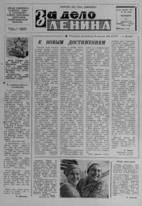 ОРГАН СЕВЕРНОГО РАЙКОМА КПСС И РАЙОННОГО СОВЕТА НАРОДНЫХ ДЕПУТАТОВ НОВОСИБИРСКОЙ ОБЛАСТИ В ы х о д и т п о в т о р н и к а м , ч е т в е р г а м и с у б б о т а м . [ Г о д и з д а н и я 4 4 -й № 105 (4765) Ч Е Т В Е Р Г 31 А В Г У С Т А 1978 года ' © Л * - Ц ^ Ц е н а 2 к о п . Й - г- :- - - ................. • Реше ния июлЬс ко г о Пл е н у м а ЦК К П С С — в ЖизнЬ К НОВЫМ Д О С ТИ Ж ЕН И ЯМ ЗВЕЗДА ТРУДОВОЙ СЛАВЫ З АЖ Ж Е Н А В ЧЕСТЬ КО М БА Й НЕ РА КОЛХОЗА « П У Т Ь К К О М М У Н И З М У » И. Т. НРЕСТЬЯНОВА, НАМОЛОТИВШЕГО 1 3 0 0 Ц Е Н Т Н Е РОВ ХЛ Е БА . М ЕХА Н И З А Т О Р Ы ! РА В Н ЯЙТЕСЬ НА ПЕРЕДОВИНА УБОРОЧНОЙ С ТРАДЫ ! В с оревнующихся хозяйс т вах В тяж е лы х погодных условия х ведут сельскохозяйственные работы механизаторы нашего района. Затяжные дожди мешают убирать урожай, нарушают т р у довой ритм полеводов. . К а ж д ы й п о гож и й час дорог механизаторам колхоза « 7 - й съезд Советов». Перед звеном В. А. Корж ова стоит задача: убрать за 20 рабочих дней 4 8 0 гектаров силосных к у л ь т у р . И пять комбайнеров делают все возможное: ими уже убрано 1 0 8 гектаров подсолнечника и заложено в траншеи 1 0 0 0 тонн сочн о г о корма. Подвозят зеленую массу тр актористы А. Миньков, П. Лоскутов, В. Можейко, шофер авиабазы П. Алейников . В погож и е часы выходят на поля зерновые комбайны. Л у ч шие результаты у М. Дергачева и И. Мйнькова, которые намолотили по 4 0 0 центнеров ржи к а ж д ы й . Колхоз начал взмет зяби. В соревнующемся с этим хозяйством колхозе «Борьба за мир» та кж е идет уборка урож ая и подготовка земли к весеннему севу 1 9 7 9 года. Полеводы этого хозяйства во многом перегнали своих соперников. Здесь успешнее идет уборка зерновых. Лучшие показатели по намолоту р ж и у комбайнеров В. П. Б у зю р ги н а— 7 1 6 центнеров, М. К . Т и ш к и н а — 6 0 4 , Е. Б. Веселова — 5 8 4 центнера. На заготовке силоса хорошо тр удятся комбайнеры Алексей Пешков и Юрий Шаповалов. В один и з неп о го ж и х дней, благодаря и х самоотверженному т р у ду, было заложено 2 0 2 тонны зеленой массы. Всего же заготовлено 1 5 6 2 тонны этого кор ма. Обошли своих соседей механизаторы и на вспашке зяби: ее вспахано 7 0 гектаров. М. Савастеева. Советская страна вступила во вторую половину десятой пятилетки. Рабочие, колхозни к и , интеллигенция вдохновенно трудятся над выполнением социально - экономической программы, выдвинутой на Х Х \ съезде КПСС. Решения партии научно обоснованы и направлены на то, чтобы п о стоянно росло материальное и духовное могущество нашей Родины, ее обороноспособное гь, а ж изнь советских людей была бы еще лучше. Это направление п ол и ти ки партии вновь убедительно доказал и подтвердил состоявшийся 3 — 4 июля 1 9 7 8 года Пленум ЦК КПСС. На Пленуме был заслушан и обсужден доклад Генерального секретаря ЦК КПСС Л. И. Брежнева «О дальнейшем развитии сельского хозяйства СССР» н принято соответствующее постановление. За время, минувшее после мартовского ( 1 9 6 5 г . ) Пленума ЦК КПСС, который положил начало резкому подъему сельского хозяйства нашей страны, в сельскохозяйственном производстве произошли большие изменения в э кономическом и социальном отношении. Значительно у к р е п и лась материально - техническая база сельского хозяйства, в стране сформирован растущий индустриальный ком плекс, который нацелен на обеспечение неуклонного подъема сельского хозяйства. Намного выросла те хническая оснащенность, энергетическая мощность колхозов и совхозов, усиленно про