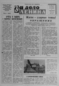 ОРГАН СЕВЕРНОГО РАЙКОМА КПСС И РАЙОННОГО СОВЕТА НАРОДНЫХ ДЕПУТАТОВ НОВОСИБИРСКОЙ ОБЛАСТИ Выходит по в т о р н и к а м , ч е т в е р га м и субб о та м . ПРОЛЕТАРИИ ВСЕХ СТРАН, СОЕДИНЯЙТЕСЬ! X I V / I V Год и з д а н и я 44-й № Ю7 (4767) ВТОРНИК 5 СЕНТЯБРЯ 1978 года Цена 2 к о п . ОТЧЫЕТИ ВЫБОРЫ в первичных парторганизациях Ц е н т р а л ь н ы й К о м и т е т К П С С р а с с м о т р е л в о п р о с о п р о в е д е н и и о ч е р е д н ы х о т ч е т н о - в ы б о р н ы х п а р т и й н ы х с о б р а н и й , р а й о н н ы х , г о р о д с к и х , о к р у ж и н ы х , о б л а с т н ы х и к р а е в ы х п а р т и й н ы х к о н ф е р е н ц и й . О т ч е т ы и в ы б о р ы — в а ж н о е п о л и т и ч е с к о е с о б ы т и е в ж и з н и п а р т и и и с т р а н ы . О н и п р и з в а н ы г л у б о к о и в с е с т о р о н н е р а с с м о т р е т ь д е я т е л ь н о с т ь п а р т и й н ы х о р г а н и з а ц и й по п р е т в о р е н и ю в ж и з н ь р е ш е н и й X X V с ъ е з д а п а р т и и и п о с л е д у ю щ и х П л е н у м о в Ц К , у к а з а н и й Г е н е р а л ь н о г о с е к р е т а р я Ц К К П С С , П р е д с е д а т е л я П р е з и д и у м а В е р х о в н о г о С о в е т а С С С Р Л . И. Б р е ж н е в а по в о п р о с а м к о м м у н и с т и ч е с к о г о с т р о и т е л ь с т в а , п р о а н а л и з и р о в а т ь п о с т а н о в к у о р г а н и з а т о р с к о й и п о л и т и ч е с к о й р а б о т ы в м а с с а х , у р о в е н ь п а р т и й н о г о р у к о в о д с т в а р а з в и т и е м э к о н о м и к и и к у л ь т у р ы , в о с п и т а н и я л ю д е й , п р и н ц и п и а л ь н о о ц е н и т ь р а б о т у в ы б о р н ы х п а р т и й н ы х о р г а н о з , о п р е д е л и т ь з а д а ч и на б у д у щ е е . Ц е н т р а л ь н ы й К о м и т е т К П С С п о д ч е р к н у л , что о т ч е т н о - в ы б о р н у ю к а м п а н и ю н е о б х о д и м о п р о в е с т и п о д з н а к о м у с п е ш н о й р е а л и з а ц и и в ы д в и н у т ы х п а р т и е й х о з я й с т в е н н о - п о л и т и ч е с к и х з а д а ч , в ы п о л н е ния и п е р е в ы п о л н е н и я п л а нов и с о ц и а л и с т и ч е с к и х о б я з а т е л ь с т в , п р и н я т ы х в п р о м ы ш л е н н о с т и , т р а н с п о р т е , с т р о и т е л ь с т в е , с е л ь с к о м х о з я й с т в е и д р у г и х о т р а с л я х на 1978 г о д и п я т и л е т к у в ц е л о м . О т ч е т ы и в ы б о р ы д о л ж н ы ^ о к а з ы в а т ь с е р ь е з н о е в о з д е й - ' Ч К в и е на д а л ь н е й ш е е п о в ы ш е ние д е й с т в е н н о с т и с о ц и а л и с т и ч е с к о г о с о р е в н о в а н и я в к а ж д о м т р у д о в о м к о л л е к т и в е , а к т и в н о с п о с о б с т в о в а т ь б о л е е п о л н о м у и с п о л ь з о в а н и ю и м е ю щ и х с я р е з е р в о в , в н е д р е н и ю в п р о и з в о д с т в о д о с т и ж е н и й н а у к и и т е х н и к и , п е р е д о в о г о о п ы т а , у к р е п л е н и ю т р у д о в о й и г о с у д а р с т в е н н о й д и с ц и п л и ны , о р г а н и з о в а н н о с т и и п о р я д к а на к а ж д о м р а б о ч е м м е с т е , в к а ж д о м з в е н е п р о и з в о д с т в а . На о т ч е т н о - в ы б о р н ы х с о б р а н и я х н е о б х о д и м о р а с с м о т р е т ь в о п р о с ы в с е й о р г а н и з а ц и о н н о - п а р т и й н о й р а б о т ы . Г л у б о к о п р о а н а л и з и р о в а т ь д е я т е л ь н о с т ь по у л у ч ш е н и ю к а ч е с т в е н н о г о с о с т а в а и у к р е п л е н и ю п а р т и й н ы х р я д о в . С л е д у е т р а с с м о т р е т ь в о п р о с и п о д б о р а , р а с с т а н о в к и и в о с п и т а н и я к а д р о в , о в л а д е н и я л е н и н с к и м с т и л е м р а б о т ы , с о в е р ш е н с т в о в а н и я к о н т р о л я и п р о в е р к и и с п о л н е н и я д и р е к т и в п а р т и и и п р а в и т е л ь с т в а , с в о и х с о б с т в е н н ы х р е ш е н и й , п о в ы ш е н и я о т в е т с т в е н н о с т и к а д р о в з а п о р у ч е н н о е д е л о , в о п р о с ы о б е с п е ч е ни я