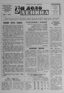 ОРГАН СЕВЕРНОГО РАЙКОМА КПСС И РАЙОННОГО СОВЕТА НАРОДНЫХ ДЕПУТАТОВ НОВОСИБИРСКОЙ ОБЛАСТИ В ы х о д и т п о в т о р н и к а м , ч е т в е р г а м и с у б б о т а м . П Р О Л Е Т А Р И И ВСЕХ С Т Р А Н , С О Е Д И Н Я Й Т Е С Ь ! Г о д и з д а н и я 4 4 -й № 111 (4771) Ч Е Т В Е Р Г 1 4 С Е Н Т Я Б Р Я 1978 года Ц е н а 2 к о п . Северному р ай он у вручено переходящее Красное зн ам я обкома КПСС, облисполкома и облсовпрофа по итогам социалистического соревнования районов Барабинской зоны на у б о р к е у р о ж а я 1978 года БОЛЬШЕ ХЛЕБА РОДИНЕ Полным ходом идет ж а т в а хлебов на полях района . Ш и рокое применение передовой т е х н о л о ги и , новые формы мо- ' рального и материального с ти м у л и р о в а н и я труда позволили даже в кр а й н е н е б л а г о п р и я т н ы х у с л о в и я х н ы неш н е й осени многим хо зя йс тв ам вести у б о р к у в ы с о к и м и темпами. На 1 2 сентября в к о л х о з а х района было намолочено 1 6 0 ты с я ч центнеров зерна, хлеба убр а ны на 1 2 т ы с я ч а х г е к т а ров, что составляе т 5 0 п роцентов всей уборочной площади. С к а ж д ы м днем растет в клад района в хлебные закрома Родины. В ночь с 1 2 на 1 3 сентября т р у ж е н и к и колхоза «Па м ять Лени н а » о тп ра в и л и на хлебоприемный п у н к т п о с леднюю п л а н ов ую а в т о м а ш и н у зерна. Го сударс твенный план по продаже хлеба х о зя йс тв ом вы п о л н е н . 1 3 се нтября рапортова ли о в ы п о л н е н и и го сударс твенно го плана по продаже хлеба т р у ж е н и к и кол хо за им. М- Горь кого . С к а ж д ы м днем все большее число х о зя й с тв в к лю ч ае т с я в хлебосдачу. На 1 2 сентября го с у д а р с т в у продано 4 2 5 8 6 центнеров зерна из плана 9 0 т ы с я ч . К а ж д ы й н овый день уборочной страды п р и н о с и т сообщения о н ов ы х т р у д о в ы х у с п е х а х с е л ь с к и х т р у ж е н и к о в . У с пешно начали п р о д а ж у го с у д а р с т в у хлеба ко л х о з ы им. X X I I съезда КПСС и им. К . Маркса - Х лебный п о т о к с к о л х о з н о й н и в ы не должен ослабевать. Вып о л н ен и е плана по продаже го с у д а р с т в у зерна — п о ч е т н ы й долг к а ж д о г о т р у ж е н и к а села. Вся о р га н и за т о р с ка я и м а с с о в о - п о л и т и ч е с к а я работа п а р т и й н ы х о р га н и за ц и й долж н а бы ть подчинена сегодня у с п е ш н о м у завершению у бор к и , а з н ач и т у с п е ш н о м у в ы п о л н е н и ю го с у д а р с т в е н н ы х п л а нов и с о ц и а л и с т и ч е с к и х обязательств тре тьего года п я т и л е т к и . Однако вы зы ва е т серье зную тр е в о г у п о л ож ение , с л о ж и в шееся в о тд ел ьны х к о л х о з а х . К р а й н е медленно идет в ы п о л нение го с у д а р с т в е н н ы х планов в х о з я й с т в а х «Заве ты И л ь и ча» , «Борьба за м и р » , « 7 - й съезд Советов». На 1 3 сентября 2чи не сдали го с у д а р с т в у ни центнера зерна- 9 0 центнеров зерна из плана 1 7 1 0 сдал к о л х о з «Новая ж и з н ь » . Н иж е своих в о з мож нос тей ведет сд а чу хлеба к о л х о з « П у т ь к к о м м у н и з м у » , где план вы п о л н е н нем н о гим более 10 процентов . У с п е ш н а я сдача го с у д а р с т в у хлеба зав и си т сегодня от четной работы всех звеньев уборочного кон в ей е р а , бесперебойной работы а в т о тр ан с п о р та , зер н о то ко в , хле боприемного п у н к т а . Перевозки и обработка зерна д о л ж н ы быть обеспечены к р у г л о с у т о ч н о . Сегодня на к о л х о з н ы х п о л я х района около 2 0 0 г р у з о в ы х автомобилей, 5 0 т р а к т о р н ы х п р и ц е п о в . К а ж д а я гр у зо в а я единица д олжна бы ть использована в ы с о коп ро и зв од и те л ь н о . П а р т и й н ы е о р г а н и з а ц и и 