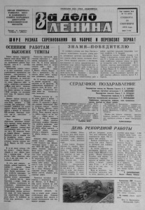 ОРГАН СЕВЕРНОГО РАЙКОМА КПСС И РАЙОННОГО СОВЕТА НАРОДНЫХ ДЕПУТАТОВ НОВОСИБИРСКОЙ ОБЛАСТИ В ы х о д и т п о в т о р н и к а м , ч е т в е р г а м и с у б б о т а м . П Р О Л Е Т А Р И И ВСЕХ С ТР А Н , С О Е Д И Н Я Й Т Е С Ь ! Г о д и з д а н и я 4 4 -й № 112 {4772) С У Б Б О Т А 16 С Е Н Т Я Б Р Я 1 9 7 8 г о д а Ц е н а 2 к о п . ШИРЕ РАЗМАХ СОРЕВНОВАНИЯ НА УБОРКЕ И ПЕРЕВОЗКЕ ЗЕРНА! ОСЕННИМ РАБОТАМ ВЫСОКИЕ ТЕМПЫ Району вручено переходящее Красное знамя обкома КПСС, облисполкома и облсовпрофа по и т о гам соревнования районов Бара- б и н с к ой зоны на 5 сентября тенущ е го годаП ри с ужд е н и е знамени н а л а га ет на всех т р у ж е н и к о в с е л ь с к о х о зя й с тв ен н о го производства еще большую о тв ет с твеннос ть за судьбу у р о ж а я . Объективно оцени в а я о б с тан о в ку на п о л я х к о л хозов, следует отметить, однако, что темпы убо р очных работ во м н о г и х хо зя й с тв а х с нас туплением п о г - # ш х дней р ас т у т медленно. На 1 3 сентября в целом по р а й о ну убрано з ерновых на площади 1 2 2 5 0 г е к т а р о в , что составляе т всего лишь 5 4 процента п л ощ а ди посевов. Дневное задание колхозам на период д е кад ни к а по обмолоту зерна было доведено в 1 3 0 0 г е к т а р о в . Для имеющ ихся 1 5 0 зерновых комбайнов оно вполне реально. Однако еже д н евн а я в ы работка в среднем не превышает 6 0 0 г е к т а р о в . Некоторые х о з я й ства еще не п р и с т у п а л и н в с п а ш к е зяби. Опыт передовых колхозов убедительно доказывае т в о з м о ж ность в ы с о к и х темпов убо р очных рабоъ Х о з я й с тв о « П а м я т ь Лен и н ^ , ' например, успеш н о ведет с в е рх п л а н ов ую сдачу хлеба, более чем с 6 0 процентов п л ощ а ди провело обмолот з ерновых . В ы п о л н и л план по продаже хле ба го с у д а р с т в у к о л х о з имени М. Горького - З а к а н ч и в аю т у б о р к у с и л о с ны х к у л ь т у р к о л х о з ы имени К . М ар кса , им. X X I I съезда КПССВ то ж е время к о л х о з ы « Н о вая ж и з н ь » * «Заветы И л ь и ч а » , «Борьба за мир» убрали зерновые с площади менее 4 0 п р о центов . Т ем пы у бо р оч ных работ у н и х в два раза н и ж е , чем у передовых х о зя й с тв . За п я т ь дней ударного дек а д н и к а дневная вы раб от ка на ко мбайн в ко лхозе «Новая ж и з н ь » составила менее 3 г е к таров. Ана л и з о р га н и за ц и и т р у да в хо зя й с тв е п о к а зы в а е т , что здесь несерьезно о тно си л и сь к решению м н о г и х о р г а н и з а ц и о н н ы х вопросов еще во время п о д го т о в к и к страде. Слабо решены вопросы т е х н и ч е с к о г о обс л у ж и в а н и я , непроизводительно и с п о л ь з у е т с я имеющаяся т е х н и к а , не внедрены к а к положено п р о гр ес с и в ны е приемы о р г а н и з а ц и и труд а , нет ч етко пр о д ум а н ного о п ер ативно го плана прове дения у б о р к и . На ко м б а й н а х работают люди временные, малоо п ы тны е . Ре з ул ьта ты тщательной , к а ч е ственной п о д го то в ки к уборке у р о ж а я с к а з ы в аю т с я сейчас во всем- Т а к , по итог ам весеннего сева призовые места за лучшее качество работ были п р и с у ж д е н ы колхозам имени К . М ар кса , « П а м я т ь Л е н и н а » и « П у т ь к к о м м у н и з м у » . Эти же ко л х о з ы сейчас имеют н а и в ы с ш у ю у р о ж а й н о с т ь з ерновых . На 13 сентября основной план по продаже го суд ар с тву зерна выполнен на 5 8 процентов . На хлебоприемное п редприятие отправлено более 4 6 ты с я ч ц е н т неров зерна. Большинство к о л хозов имеют все во змож ности план в ы п о л н и т ь . Силосные к у л ь т у р ы на это же время убр а ны в районе с площади 5 1 0 0 ге ктар ов , 