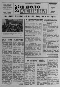 ОРГАН СЕВЕРНОГО РАЙКОМА КПСС И РАЙОННОГО СОВЕТА Н АРОДНЫ Х ДЕПУТАТОВ НОВОСИБИРСКОЙ ОБЛАСТИ Выходит по вторникам, четвергам а субботам. Год издания 44-й № 15 (4831) СУББОТА 3 Ф Е В Р А Л Я 1 9 7 9 года Цена 2 коп. ВЫСОКИМИ ТЕНИДНН — К НОВЫМ ТРУДОВЫМ ПОБЕДАМ! П л а к а т х у д о ж н и к а Н. Ч а р у х и н а «Вперед, пятилетка , в р е мя, вперед!» И здательство «Плакат». Ф отохроника ТАСС ело чести П р е т в о р я я в ж и з н ь и с т о р и ч е с к и е р еш е н и я XXV съ е зд а КПСС, рабочие , сл уж ащ и е , и нж е н е р н о - т е х н и че с ки е работники С е в е р н о го хлеб оприемного пр ед пр и яти я основны е п лановы е п о к а з а т е л и в 1978 году выполнили. Досрочно и с х орош им ка че с т в ом была под гото влен а т е х н и ч е с к а я б а з а к п риему у р о ж а я 1978 года, о б е с п е ч ен а н а д е ж н а я сохранность зер н а и д ругих ма териальны х ценностей. Вступая в ч етв ертый год д е сятой пятилетки, к о л л е к т и в п р е д прия тия п р и н я л на 1979 год н о вые повыш енны е с о ц и ал и сти чес к и е обязате льс тва , в ко то ры х ' пр ед у см о тр ено о беспечить в ы полнение государс твенного п л а на з а к у п о к зе рна. Досрочно и с хорошим ка че с т в ом подготовить м а тер и ал ьн о - те х н и че с к ую базу к п р ием у зер н а у р о ж а я 1979 г о да, обратить особбе внимание на улу чш ен ие условий т р у д а и бы- \ та рабочих и с л уж ащ и х , п о вы сить к у л ь т у р у про изво д ств а на предприятии. По п л а н у р азв и тия т е х н и ч е с к о й б азы н а 1979 год д о начала х л еб о з аго то в о к в т о р ц е склада № 1 б у д е т п роизв еден д ем о н т аж приемной точки с п оследующей у стано в к о й нории НЦ-100, а в т о м о б и л я -р а з г р у з ч и к а ГУАР-15/У. Д ля обеспечения п о ж а р н о - с т о р ож е в о й о х р аны на п р е д п р и ятии, д о первого а в г у с т а 1979 года, н ам е чен о к а п и т а л ь н о о т р е м он ти рова ть 300 погонных м е т ров ограды, у стано ви ть д о п о л нительно н е м е н е е 20 т о ч е к о х ранного о св ещ ен ия терри тори и . В ц е л я х повышения знаний р аб о тн ик о в пр ед пр и яти я в п е р вом полугодии 1979 года б у ду т н ап р а в л ены на к у р с ы п о вы ш е н и я с отрывом от про изво д ств а лаборан т и м е х ан из а то р . Д о н ачала х л еб о з аго то в о к н ам е чен о подготовить непоср)едственно н а предприятии , п у т ем бригадного обучения, н е м е н е е 20 рабочих следующих специальностей : ч е т ы р е х з е р н о с уш и лы ц и к о в и столько ж е кочегаров, т р а н спорти ровщиков, мотори стов и сепа раторщиков , а т а к ж е р а ботников д ругих специальностей. К олле кти в взял о б я з а т е л ь с т во— план ком пл ек сн о го грузооборота выполнить на 102 процента , пеколлектива ревы полн и ть плановые з ад ан и я п о р о с т у п роизводительности т р у д а н а 0,4 процента , о б е сп е чить п ри этом о п е р е ж а ю щ и е тем пы роста производительности т р у д а п о отношению к росту с р е дн ей з ара ботн ой платы. В 1979 году будут улучшены у с л о в и я т р у д а с точки зрения тех н и ки безопасности и п р о мышленной санитарии. Решено н е допус тить ни одного случая п р оизводств енного тр авматизм а, д о б и т ь с я полного выполнения п л а н а ^ ном ен к л ату р ны х м е р о п рия тий по о хран е т р у д а и т е х н и к е безо пасности, улучшить р а ц и о н ал и з ато р с к ую и и з о б р е т а т е л ь с к ую р аб о т у на п р е д п р и я тии. Большое внимание в о б я з а т е л ь с т в а х отводится воспитанию м о л о д е ж и на лучш их традициях к о л л е к т и в а п у т е м ш еф ств а и н аста вн и че с т в а ка др о вы х п р о и з водственни