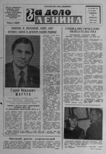 ОРГАН СЕВЕРНОГО РАЙКОМА КПСС И РАЙОННОГО СОВЕТА НАРОДНЫХ ДЕПУТАТОВ НОВОСИБИРСКОЙ ОБЛАСТИ Выходит по вторникам, четвергам и субботам. ПРОЛЕТАРИИ ВСЕХ СТРАН , СОЕДИНЯЙТЕСЬ! № 18 (4834) СУББОТА 1 0 ФЕВ РАЛ Я 1 9 7 9 года Ц ена 2 коп. И З Б Е Р Е М В В Е Р Х О В Н Ы Й СОВЕТ СССР Л У Ч Ш И Х С Ы Н О В И Д О Ч Е Р Е Й Н А Ш Е Й РОДИНЫ! Гурий Иванович М А Р Ч У К вице-президент Академии наук СССР, председатель президиума Сибирского отделения Академии наук СССР, Герой Социалистического Труда К АНД И Д АТ В Д Е П У Т А Т Ы С О В Е Т А Н А Ц И О Н А Л Ь Н О С Т Е Й В Е Р Х О В Н О Г О С О В Е Т А С С С Р ПО Н О В О С И Б И Р С К О М У И З Б И Р А Т Е Л Ь Н О М У О К Р У Г У № 21 С ОЦИА Л ИС ТИЧЕСК И Е ОБ Я З А Т ЕЛЬСТВА коллектива Северной ПМК треста „Мелиоводстрой“ на 1979 год Гурий Иванович М арчук родился в 1925 году в семье уч ите ля п о сел ка П е т р о во - Херсонец О ренбургакой о б ласти. После окончания с р е д ней школы п оступил в Л е нинградский государственный университет. В еликая О т е ч е ств енная война п р е р в а л а у ч е бу. С 1943 по 1945 год Г. И. М а р ч у к н аходилс я в р яд а х Сов етской Армии. После в о й ны в ернулся в ун иверситет, окончив его, п р о д о л ж а л у ч е б у в а с п и р ан ту р е . В 1952 году защитил кандидатскую , а ч е р е з четыре года — д о к торскую диссертацию . В т е чение деся ти лет в ел н а у ч ную работу в гг. М оск ве и Обнинске. В 1961 году Гу- Р(ию Иван овичу М а р ч у к у за н ау ч ны е д о с т и ж е н и я была п р и с у ж д е н а Л ен и нс к ая п р е мия. С 1962 года Г. И. М арчук ж и в е т и р а б о та е т в Н овоси бирске, возглавляет Вычислит ельный центр СО АН СССР. В этом ж е году он и зб и р а е т с я членом -корре спон- дентом, а в 1968 году — д е й ствительным членом А к а д е мии н а у к СССР. Г. И. М ар ч у к — крупный ученый в области атомной энергии, геофизики и вычислительной математики, ав тор более 150 научных работ, п о лучивших ши рокое признание в стране и з а р уб еж ом . Г. И. М а р ч у к яв л я е тся т а лантливым организатором н а уки. С 1969 года он — з а м е ститель п ред сед ате ля СО АН СССР, в 1975 году избран вице-президентом АН СССР и п р ед сед ате л ем Сибирского отделения. Его д еяте льн ость х а р а к т е р и з у е т глубокий п а р тийный государств енный п о д ход к решению научных и техниче ских проблем, и м ею щих большое н а р о д н о - х о з я й ст венное значение . Под его руководством и п ри н еп о с редственном участи и в п о с ледние годы проведена б о л ь шая р аб о та по ф о р м и р о в а нию перспек тивных н а п р а в лений научного поиска, к р у п ных программ комплек сн ого использования природных р е сурсов, у ск оренного развития произв одител ьных сил С и б и ри. О рганизаторские сп особно сти Г. И. М а р ч у к а я р к о п р о явились в его д е яте л ьн о сти по уск орен ию широкого в н е д р ен ия до с т и ж ен и й н а у к и в производство. Только на предприятиях г. Н о во си б ир ска н а разл ичных ста диях внедрения сейчас находятся более 150 р а зр а бо т о к ученых СО АН СССР. Г. И. М ар ч у к у д ел яе т большое внимание в о сп итанию н аучных ка дров, я в л я е т ся професс ором Н овоси бир ского государственного у н и верситета . Под его р у к о в о д ством подготовлено 44 д о к то р а и кандида та наук. Коммунист с 1947 года, Г. И. М ар ч у к активно у ч аств у ет в общественно - полити ческой жи зн и . Он часто быв ае т в тр удовых коллективах, в ы ступае т к а к парти йный п р о пагандист и п опуляриза тор отечественной н ауки . Гурий Иван ович М арчук — член Новосибирс