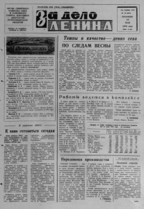 ОРГАН СЕВЕРНОГО РАЙКОМА КПСС И РАЙОННОГО СОВЕТА НАРОДНЫХ ДЕПУТАТОВ НОВОСИБИРСКОЙ ОБЛАСТИ Выходит по вто рникам, четвергам и субботам ПРОЛЕТАРИИ ВСЕХ СТРАН, СОЕДИНЯЙТЕСЬ! U X B I 7 / I V а I я I Год и здани я 44-й № 59 (4875) ВТОРНИК 2 2 МАЯ 1 9 7 9 года Ц ена 2 кон. Рассмотрев итоги социалистического соревнования доярок, скотников дойных гуртов и т еля тниц по производству и про даже государству продуктов животноводства за 4 месяца 1 9 7 9 года- бюро райкома партии, исполком районного Совета народных депутатов и президиум райкома профсоюза работ ников сельского хозяйства постановляют: В социалистическом соревновании среди доярок, скотни ков дойных гуртов и телятниц первенство присудить: Черновой 3.' К . — доярке колхоза имени М. Горького, на доившей от каждой коровы по 1 1 8 7 килограммов молока; Седаковой Е. С. — доярке этого же колхоза, получившей по 1 1 5 4 килограмма молока на корову; Яегачевой С. П . — доярке колхоза имени М. Горького, по лучивш ей по 1 1 4 1 килограмму молока на корову; Щербаковой А. Л . — доярке колхоза «П амять Ленина», надоившей от каждой фур аж ной коровы по 1 0 8 7 килограм мов молока: Бузюргнно й Е. С. — доярке колхоза «7 -й съезд Советов», получивш ей по 1 0 5 7 килограммов молока на корову. Ч ерникову В. Н;, Легачеву А. М ., Лег а ч еву В. Ф. — скотни кам колхоза имени М. Горького- обеспечившим надои моло ка от Закреплённых за ними коров по 1 0 1 9 килограммов; В а с и л Ы * } И. Т . , Нропотову А. А. — скотникам дойного гур та колхоза «7 -й съезд Советов», обеспечившим надои молока по 8 2 3 килограмма на корову; Несноровой А. Е. — телятнице колхоза «П амять Ленина», получившей среднесуточный привес молодняка по 8 0 4 грам ма на голову; Ивановой Н . И . — телятнице колхоза « П у т ь к коммуниз му», получившей среднесуточный привес молодняка по 7 9 3 грамма на голову. ...................— г - В р а й к ом е КПСС К зиме готовиться сегодня Б ю р о р а й к о м а К П С С при н ял о п о с т а н о в л е н и е п о п о д г о то в к е п р е д п р и я т и й и х о зя й с т в р а й о н а к р а б о т е в зи мних у с л о в и ях 1979-80 года. Б ю р о о б я з а л о п а р т и й н ы е о р г а н и з а ц и и , и с п о л к о м ы м е с т н ы х С о в е т о в н а р о д н ы х д е п у т а т о в , х о з я й с т в е н н ы е о р г а н ы р а з р а б о т а т ь в с р о к д о 2 8 м а я 1 9 7 9 г о д а к о н к р е т н ы е м е р о й р и я т и я п о п о д г о т о в к е п р е д р и я т и й , с т р о е к , т р а н с п о р т а , ш к о л , б о л ь н и ц , д е т с к и х у ч р е ж д е н и й , о б ъ е к т о в т о р г о в л и и ж и л ы х д о м о в к р а б о т е в з и м н и х у с л о в и я х . Н а м е ч е н о н е п о з д н е е 1 о к т я б р я т е к у щ е г о г о д а п р и в е с т и в и с п р а в н о е с о с т о я н и е в с е э н е р г е т и ч е с к о е х о з я й с т в о , к о т е л ь н ы е , о т о п и т е л ь н ы е с и с т е м ы , в о д о п р о в о д н ы е и т е п л о п р о в о д н ы е т р а с с ы , п о г р у з о ч н о - р а з г р у з о ч н ы е п л о щ а д к и , о б е с п е ч и т ь з а в о з в н е о б х о д и м ы х о б ъ е м а х т о п л и в а , с ы р ь я , м а т е р и а л о в и с п е ц о д е ж д ы , з а к о н ч и т ь р е м о н т п р о и з в о д с т в е н н ы х з д а н и й и ж и л ы х п о м е щ е н и й , п р о в е с т и в с е н е о б х о д и м ы е м е р о п р и я т и я , с в я з а н н ы е с о б е с п е ч е н и е м н о р м а л ь н о й р а б о т ы в з и м н и й п е р и о д . Н а ч а л ь н и к у у ч а с т к а З а п а д н ы х э л е к т р о с е т е й А . А З а й ц е в у п о р у ч е н о з а в е р ш и т ь к 1 о к т я б р я к а п и т а л ь н ы й р е м о н т о б о р у д о в а н и я э л е к т р о п о д с т а н ц и и и э л е к т р о с е т е й , п о в ы с и т ь т р е б о в а т