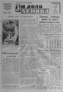 ОРГАН СЕВЕРНОГО РАЙКОМА КПСС И РАЙОННОГО СОВЕТА НАРОДНЫ Х ДЕПУТАТОВ НОВОСИБИРСКОЙ ОБЛАСТИ ~ Выходит по вторникам, четвергам и субботам П РОЛ ЕТА РИИ ВСЕХ С Т РА Н , СОЕДИНЯЙТЕСЬ! Год и з д а н и я 4 4 -й № 65 (4881) СУББОТА 2 ИЮНЯ 1 9 7 9 года Ц е н а 2 ко п . 3 И Ю Н Я - Д Е Н Ь П л а к а т х у д о ж н и к а К. П ю с с а . И з д а т е л ь с т в о « П л а к а т » . Ф о т о х р о н и к а Т А С С О б н о в л я ю щ и е з е м л ю Всего четырнадцать лет отделяют нас от мар товсжого ( 1 9 6 5 г.) Пленума Ц К К П СС . Многое сделано за этот короткий срок. Намеченная партией широкая программа дальнейшего подъе ма сельскохозяйственного производства успеш но претворяется в жизнь. Возросли темпы и масштабы мелиорации земель, которой отводит СЯ одно из гла вны х мест в комплексе меро приятии, предусмотренных этой программой. Мел иоративными работами охвачены сейчас пр акти чески все зоны страны. Особый размах эти работы получили в девятой пятилетке. На расширение площади мелиорированных земель и их сельскохозяйственное освоение было нал равлено 2 6 млд. рублей капиталовложений или почти в два раза больше, чем в восьмой. Е щ е больше предстоит сделать мелиораторам в т ек ущ е й пятилетке. Намечено ввести в экс п л уа т ац ию 5 млн. гектаров орошаемых и 4,8 млн. гектаров осушен ны х земель. В постановле нии Ц К К П С С и Совета Министр ов СС С Р «О плане мелиорации земель на 1 9 7 6 — 1 9 8 0 годы и мерах по у л учш е нию использования мелиори рован ны х земель» предусмотрено последователь ное расширение мелиоративного строительства, определены задания гю производству сельскохо зяйственной пр од укции на мелиорированных землях. В ы п о л н я я решения X X V съезда нашей пар тип, д в у х т ы с я ч н ы й отряд Новосибирского треста «Мелиоводстрой» вводит все новые и новые М Е Л И О Р А Т О Р А гектары орошаемых и осушен ны х земель, пара щивает строительство прудов, на больших пло щадях проводит культуртехнические работы. Обновленные луга и пастбища в Венгеров свои, Кыштовском, Татарском и дру гих районах дают урожай трав в 3 — 4 раза больше, чем раньше. Н аш а Северная механизированная колонна также вносит свой вклад в развитие мелиора j \ m и освоения новых земель в колхозах рано на. За двенадцать лет хозяйства дополнительно получили 4 5 3 7 гектаров осушенных, 8 0 6 7 гек " таров о к ульт ур ен ны х и 2 0 6 гектаров орошае мых земель. Больш ие площади осушен ны х зе мель сданы в колхозе «В осход» — 1 1 6 7 гек таров. На н овы х полях в прошлом году колхоз накосил 1 0 , 3 ты ся чи центнеров сена. Урожай пость многолетних трав составила 11 ,3 центне ра с гектара. В колхозе им. М. Горького осуше но Ново-Елизаровское болото площадью J 2 9 7 гектаров. В 1 9 7 8 году сдано 2 6 4 гектара осу ш е н н ы х земель в колхозе «Н овая жизнь». Вы работка па одного рабочего по сравнению с 1 9 6 7 годом возросла в 2 ,6 раза и достигла _ 9 2 9 3 рублей. Соответственно и объем работ вш>!»&Ы!_3 ,8 раза. В П М К построено 2 5 ж илых догов общей щадью 2 3 7 9 квадратных мет ров; План п я т и месяцев этого года коллектив П М К выполнил на 1 0 8 , 3 процента, или из алана 2 2 9 ты ся ч рублей произведено строи тельно-монтажных работ н а 2 4 8 , 1 т ы с я ч у руб лей. План п-о реализации выполнен на 1 7 2 , 7 процента. В социалистическом соревновании между подразделениями треста нашей П М К за четвер тый квартал 1 9 7 8 года было присуждено тре тье место, а за первый квартал этого года — первое место с вручением переходящего Красно 