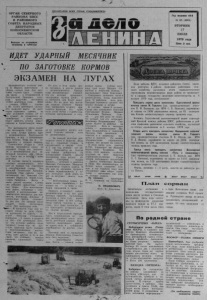 ОРГАН СЕВЕРНОГО РАЙКОМА КПСС И РАЙОННОГО СОВЕТА НАРОДНЫХ ДЕПУТАТОВ НОВОСИБИРСКОЙ ОБЛАСТИ Выходит по вторникам, четвергам и субботам ПРОЛЕТАРИИ В С Е Х СТРАН, СОЕДИНЯЙТЕСЬ! I I я с л и □ ш и j h h b т ш ш Год издания 44-й № 85 (4901) ВТОРНИК 1 7 июля 1 9 7 9 г ода Цена 2 коп. ИДЕТ УДАРНЫЙ м е с я ч н и к \ ПО ЗАГОТОВКЕ^КОРМ ЭКЗАМЕН НА Л У Г А Х М ех аниза торы к о л х о з а и м е ни К. М арк са приступили к у б о р к е с е я н ы х трав . Д ля з а г о товки к о рм о в з д е с ь созд аны два зв ена — в Ичкалинской и Б е р г у л ь с к о й бр игад ах, к о т о рым п р е д стои т з а г о то в и ть 1 4 3 0 0 ц ен тн еров сена, 6 9 2 0 — сенаж а , 1 0 8 0 0 — с о л о м ы и 6 0 ты с я ч ц ен тн еров с и лоса . Это п о з в о л и т иметь 2 5 цент- неров к о р м о в ы х единиц на одну у с л о в н у ю г о л о в у . От то- ^ о , с у м е ю т ли с п р ав и т ь ся м е х а н и з а то р ы с э т ой задач ей , б у д у т з а в и с е ть у с п е х и ж и в о т н о в о д о в в п р е д с т о я щ у ю зи м о в ку. На д венадцатое июля х о з я й с т в о з а г о то в и л о 1 2 1 8 ц ентне ров сена. Л учш е р а б о ты идут у м е х а н и з а т о р о в Б е р г у л ь с к о й бр игады , а в от у ичкалинцев дела п о х у ж е . Т у д а мы и о т правились в п е р в у ю оч е р е д ь . С е н о к о с н ы е у г о д ь я в этой бр игад е начинаются с р а з у за деревн ей . К огда мы п о д ъ е х а ли, у м е х а н и з а т о р о в бы л н е б о л ьш о й п ереры в: они - о б е д а ли. З д е с ь мы и начат® с ними р а з г о в о р . В с о с т а в е зв ена в о с н о в н о м о п ы т ны е м е х а н и з а т о ры , к о т о ры е не первый г о д у ч а с т в у ю т в с е н о у б о р о ч н о й с т р а д е . Э т о Василий Л еон ть ев ич А р х и п о в , имеющий стаж р а б о т ы о к о л о пятнадцати лет, Николай С т е панович Кириллов, Юрий А л е к се е в и ч Г ай д у к о в . . . В с е г о в зв ене д е с я т ь че л о в е к . Сейчас они у б и р а ю т о д н ол етни е с е я ные травы. Для выполнения в се х р а б о т , св я з а н ны х с с е н о у б о р к о й , в ра сп о ряж ен ии м е х а н и з а то р о в н а х о д я т с я два к о п нителя, в ол окуш и , б о к о в ы е и п оп е р е чны е гр абли, с т о г о м е т . За два дня, что прошли п осле д ож д ей , з в е н о з а с т о г о в а л о о к о л о 2 0 0 ц ен тн еров сена. ‘ - В •п рош л ом г о д у при х о рош ей п о г о д е за д ен ь у б и р а ли ц ен тн е ро в по т р и с т а ,— г о в орит Николай Степан ович Кириллов. — А нынче в ср е д н ем по 1 0 0 — 1 5 0 ц ен тн е р о в , п о т о му ч т о у с л о в и я р а б о т ы очень тр у дн ы е : почва ещ е не п р о с о х л а , т р а к т о р а ч а ст о у в я з а ю т в п ереувлажн енных местах. Один з а с т р я н е т , е м у на п о м ощ ь и де т д ру гой , а т о и два с р а з у , ч т о отни м а е т немал о времени , с д е рж и в а е т темпы ра б о т Но е с т ь в э т о м з вен е , к р о ме п о го дны х , и д р у ги е помехи — организационные. Правда, сами м ех ан и за торы счи тают , чт о э т о явление в рем енн ое , « н е у р я д и ц ы первых д н е й » , и с о в р ем ен ем они б у д у т р а з р е шены. Но на деле в с е вы гля дит г о р а з д о с л ож н е е . Например, заправля ть т е хн и к у при х о ди т с я в ру чн ую . На ' к раю поля с т о я т боч ки с г о р ю ч е - с м а зочными материалами, и о т т у да их п р и ходи тся н о с и т ь в е д рами. Г о р я ч е е питание пока не организ ован о . — За каждой м е л о ч ь ю при х о ди т ся ехать в Б е р г у л ь . В ед ь там и токарный ст ан о к , и сверлильный , и с в а р к а е с т ь . А у нас под руками нет ниче го. При ходи т ся за б о л т о м или гайкой д о б и р а т ь с я на цен тральную у с а д ь б у . Д е с я т ь кил ом е тр о в туда, д е с я т ь о б ратно. С м отриш ь — полдня п р о ш л о ,— в сту п а е т в р а з г о в о 