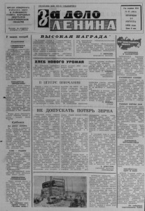 ПРОЛЕТАРИИ ВСЕХ СТГ АН, СОЕДИНЯЙТЕСЬ! ОРГАН СЕВЕРНОГО РАЙКОМА КПСС И РАЙОННОГО СОВЕТА Н А Р О Д Н Ы Х ДЕПУТАТОВ НОВОСИБИРСКОЙ ОБЛАСТИ Выходит по вторникам, четвергам и субботам i i v / i u т А Год издания 45-й № 9 7 ( 4 9 1 3 ) В Т О РН И К 1 4 А В Г У С ТА 1 9 7 9 года Цена 3 коп. У наших соседей Кыштовка СОРЕВНУЮТСЯ ХЛЕБОРОБЫ Договор о социалистичес ком соревновании на период ж а т вы заключили между собой передовые хлеборобы района — комбайнер колхо з а имени Ленина И. Полю бин и его коллега из ко л х о ' за «Победа» Д. Швецов. t В своих о б я з а т е л ь с т в а х И. Полюбин наметил такие рубежи: скоси ть и подоб р ать вал ки на площади 6 00 гектаров , намолотить не ме нее 4 5 0 0 центнеров зерна. Принимая вызов, Д. Шве цов д ал слово скосить 3 0 0 гектаров колосовых в вал ки и намолотить 5 0 0 0 цент неров хлеба. ПОБЕДИТЕЛИ ОПРЕДЕЛЕНЫ Подведены итоги социали стического соревнования хо зяйств района по заготовке кормов. Первенство присуж депо тр уж ен и к ам колхоза «Новый строй», заготовив шим 4,1 центнера кормовых ^ едини ц на условную голову крупного рогатого скота. В целом план заготовки сена выполнен здесь на 97 ,1 про цента, сен аж а — на 9 7 ,3 процента. Победителю " вру чено п ер еходящ ее Красное з н а м я райкома КПСС, рай исполкома и Р К профсою за. Второе место присуждено кол хо зу «К р а сн а я з в е з д а » и тр е т ь е — кол хо зу имени Ч к а л о в а . * Куйбышев Н А ДОСКУ ПОЧЕТА :3а успехи в соц иалис та ч еском соревновании на за готовке кормов на районную доску Почета занесены колхозы «Восход» и « З а р я ком м ун и зм а » , а т а к ж ё кол л ек тивы первой фермы совхо за «Октябрьский » и второй комплексной брига ды к о л хо за «Победа», Эти х о з я й с т в а и подр азд ел ен ия уж е вып олн или годовой план заготовки сена. ХЛЕБ — РОДИНЕ М ех ан изаторы колхоза « Р а с с в е т » начали уборку хлебов прямым комбайни рованием. С каждого гекта ра они намолачив ают по 15— 16 це нтнеров ржи. Высоких у р ож а е в доби ли с ь тружени ки совхозов «О тр адн енский» , «Октябрь сций» , «Михайловский»,1, « К уйбыш ев ский» . На хлебоприемный пункт поступили сотни центнеров з е р н а нового у р ож а я . ИНИЦИАТОРЫ СОРЕВНОВАНИЯ Убрать урож ай быстро и без потерь — к этому приз вали тружеников района ком б айн еры кол хо за « З а р я ком м ун и зм а » А. И. Кор нюш, А. В. Апарин, Н. Н. Королев, И. Н. Николаев, А. А. Меркулов. Они рас читывают в з я т ь с каждого г е к т а р а по 2 0 — 2 5 центне ров зерн а , довести выработ ку на комбайн до. 7 —8 ты с я ч центнеров. (По страницам газет «Правда Северу» и «Трудовая жизнь»). В Ы С О К А Я Н А Г Р А Д А З а большие успехи в социалистическом соревновании кол л ек тиву Северного «Меж- к о л хо зл есхо за» присужден о первое место по итогам работы за первое полугодие 1979 года. Победителю вручены пер еходящ ее Красное з намя «О блм еж к олхо зл есхо за » , Поч етная г р ам о та и д ен е ж н а я премия. На торжественном 'с обр ани и работников этой организации награды вручил замести тель п р е д с ед а т ел я «Облм еж к олхо зл есхо за» Д. В. Каминский. Пред сед атель Северного «Межколхозлесхо з а » М. В. Лукашов р а с с к а з а л собравшимся о д е л а х ко л л ек т и в а и за в е р и л , что и во вто ром полугодии тружени ки этой организации будут добиваться наивысших прои зводствен ных пока зателей. Г. КИРИЛИН, п р едс ед ател ь месткома. Х Л Е Б Н О В О Г О У Р О Ж А Я На Северный хлебоприем ный пункт поступает зерно урожая- нынешнего года. Поставк