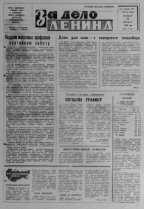 Год издания 44-й № 140 (4 9 5 6 ) В Е Р Г 2 2 Н О Я Б Р Я года 2 коп. ОРГАН СЕВЕРНОГО РАЙ КОМ А КПСС И РАЙОННОГО СОВЕТА НАРОДНЫХ Д Е П У Т А Т О В НОВОСИБИРСКОЙ ОБЛАСТИ В ы х о д и т по в т о р н и к а м ч е тв е р га м и субботам Кадрам массовых профессий— партийную заботу ^ На развитие сельскохозяйственного производства района оказывает большое влияние постоянная, целенаправленная работа партийных, советских и хозяйственных органов с кадрами. В хозяйствах из года в год растет число высококвалифицированных механизаторов, улучшается организация их труда. Так, за четыре года десятой пятилетки всеми формами обучения в районе подготовлено более восьмисот механизаторов, из них 270 человек прошли переподготовку и стали специалистами первого и второго класса. Из 1040 человек, занятых в животноводстве, повысили классность 571. Первый класс получили 280 человек, второй — 291. В текущем учебном году при Северном СПТУ организована учеба мастеров сельского строительства. Все более прочное место занимает прогрессивная организация труда механизаторов путем создания звеньев. Большое внимание уделяется партийными, хозяйственными органами условиям труда сельских механизаторов. Только за последние годы в колхозах построено 3 гаража для автомобилей на 64 места, гараж для тракторов К-700 на восемь мест. Строятся мастерские для ремонта техники. Улучшается работа по профессиональной ориентации молодежи, ее трудовому воспитанию и обучению механизаторским профессиям. Все больше выпускников остается работать после окончания школы на селе. З а годы десятой пятилегки в общеобразовательных школах района подготовлено около 300 механизаторов, из них— 180 трактористов и 101 шофер. Д о м а д л я с е л а — с з а в о д с к о г о к о н в е й е р а ЦК КПСС и Совет Министров СССР приняли постановление «О дальнейшем развитии з а в о д ского производства деревянных панельных д о мов и комплектов деревянных деталей для д о мов из местных материалов для сельского жилищного строительства». В постановлении отмечается , что з а последние годы в стране осуществлен р я д мероприятий по д а л ьн ей ш е м у р азв и тию с е ль ск охозяйств енного п роизводств а , соц и а л ьн ом у р азвитию и б л а г о у с т ройству сельских населенных пунктов. О дн ако имеюща яс я с т р о и т е л ь н а я б а з а не обеспечивает необходимые темпы с т р о и т е л ь с т в а ж и лых домов и о б ъ ек то в к у л ь т у р н о - бы т о в о го назн ач ен ия с е л ь ской местности, а т а к ж е потребности сельского населения в б лагоустроенных домах . П ри зн ан о , что одним из в аж н ей ш и х н а п р а в л е ний улучшения о р г ан и з ац ии ж и л ищ но го с т р о и те л ь с т в а на селе я в л я е т с я р а з в и т и е з а в о д с к о го п р о изв о д ств а д ер ев ян ных пан ел ьных домов, а' т а к ж е зн ач ите льн о е увеличение выпуска к о м п л е к т о в д ер ев ян ны х д е т а л е й д л я домов со с т е н а ми из местных м а тер и ал о в . Пе ред партийными и советскими орг ан ам и , ми нистерствами и в ед ом ств ам и поставлены к о н кретны е з а д а ч и по всем ерному разви тию п р о и з водственной базы и нд у стр и ал ьн о го жилищного с т р о и тел ь ств а в сельской местности. П остановлением п р е д у см а т р и в а е т с я , в ч а с т н о сти, с тр о и тел ь ств о одно- и д в у х э т а ж н ы х д о м о в с учетом приро д н о -кл им ати ч еских условий, у к ом п л ек то в анны х инж енерным об о р у до в ан и ем , с в а р и ан там и отопи