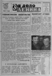 ОРГАН СЕВЕРНОГО РАЙНОМА НПСС И РАЙОННОГО СОВЕТА НАРОДНЫХ ДЕПУТАТОВ НОВОСИБИРСКОЙ ОБЛАСТИ Выходит по вторнинам четвергам и субботам Пролетарии всех стран, соединяйтесь! A I V / I U Год издания 45-й № 6 (4978) С У Б Б О Т А 12 Я Н В А Р Я 198 0 года Цена 2 коп. СОЦИАЛИСТИЧЕСКИЕ ОБЯЗАТЕЛЬСТВА! в ы д в и г а ю т Л У Ч Ш И Х тружеников Останинского сельского Совета но достойной встрече дня выборов в Верховный Совте РСФСР и местные Советы народных депутатов В обстановке огромного политичес кого и т р у - У в е л и ч и т ь надой на к ор ову не менее чем на \ хозяйственного и с о ц и а л ь н о -к ул ь т у р н о го строи - тракторов, отремонтировать 7 0 процентов к ом - * \ | е л ы м в а , т р уд ящ ие ся Останинского сельского байнов и сеноуборочной т е х н и к и . Во всех отрас- { J ^" nf' Ta Двоились определенных успехов. лях соблюдать в ы с о к ую к у л ь т у р у производства. \ f a Колхо з « 7 - й съезд Советов» досрочно вы п ол - '^аготови ть ^ ^ 0 к у б и ч е с к и х метров стр ои тель - + у нил план четырех лет п я т и л е т к и по производного леса. j[ с т в у и реализа ции всех виДов пр одуктов ж и - J вотноводства. По культурно-бытовому, медицинскому и тор- J говому обслуживанию. ^ Зна чите льно перевыполнены соцобязате льств а ^ г ел ьс ком Д ° ме к у л ь т у р ы , к лубах , библиопродажи государ теке, к р а с н ы х у г о л к а х жи во тно в од че ских ферм t ! в 1 9 7 9 году. В ы по л не н план { с т в у зерна на 1 0 3 процента, мяса — на 1 1 9 , и непосредственно на изб ир ател ьны х о к р у г а х * ^ молока — на 1 1 5 процентов. Средний сдаточ- по сто я нн ую работу силами ш т а т н ы х ра- . t ны й вес одной головы составил 3 8 0 кил о гр ам - Ботников и идеологического а к т и в а , на правлен - { мов. У с п еш н о велась за готовка и з л иш е к проI ную на успешное проведение выборов. * дуктов живо тноводства у населения. Обеспечить ч е т кую работу магазинов и пр и - \ бы товых у с л у г населению и в ы п о л н и т ь д в у х - Бо ря сь за неуклонное выполнение решений месячный объем у с л у г к дню выборов. \ но ябрьского ( 1 9 7 9 г . ) П ленума Ц К К П С С , р у - J ководетвуясь выводами и у стан ов ка м и , изло- J ж е н ны м и в в ы с т у п л е н и и Генерального секрета- J ря Ц К КП С С , Председателя Президиума В ерхо в - # него Совета С С С Р тов. Л. И. Брежнева, т р уж е - \ ни ки Останинского сельского Совета ак т и вн о t включ ил и сь в предвыборное со циалистическое } соревнование за повышение эффективности нро- { изводства и приняли следующие с о ц иа л и ст ич е - Т ские обязательства: { > . .. - „ с т в у п р о ду кци и животноводства ИЗ ЛИЧНЫХ ПОД' \ ув е л и ч и т ь валовое производство с е л ь с к о х о з я и с т - с о б н ш х о з я й с т в г р а ж д а н . венной п р о ду кци и против пл ана на 5 процентов; сн и зи т ь себестоимость пр оизводимой пр од у к ц и и на 3 процента. ' Обязательства приняты на сходе граждан Останинского сельсного Совета. В ИСПОЛКОМЕ РАЙСОВЕТА И сполком районного Совета народных депутато в р а ссм о т рел вопрос «Об ин и ц и а т и в е * т р у д я щ и х с я Останинского < сельского Совета Северного ' района Новосибирской облае- \ ти по достойной встрече дня \ выборов в В е р х о в н ы й Совет \ Р С Ф С Р п местные Советы на- J родных депутатов». И сп о л н и т е л ь н ы й коми тет районного Совета решил: — и н и ц и а т и в у т р у д я щ и х с я Останинского сельского Совета, в з я вш и х на себя п о в ы шенные с о циа л и стич е ск ие обяза тельства в честь дня выборов в В е р х о в ны й Совет Р С Ф С Р и местные Со ве ты н а родных де