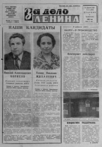 О Р ГАН СЕВЕРНО ГО Р А Й К О М А КПСС И РАЙОННО ГО СОВЕТА Н А Р О Д Н Ы Х Д Е П У Т А Т О В НОВОСИБИРСКОЙ О Б Л АС ТИ В ы х о д и т по в т о р н и к а м ч е т в е р г а м и с у б б о там Пролетарии всех стран, соединяйтесь! Д ^ / i y 7 и Год изд ания 45-й № 16 (4988) В Т О Р Н И К 5 Ф Е В Р А Л Я 1 9 8 0 года Цена 2 коп. НАШИ КАНДИДАТЫ Николай А лександрович — - Б О Р И С О В П е р в ы й с е к р е т а р ь Северного р а й к о м а КПСС К а н д и д а т в д е п у т а т ы Н о в о с и б и р с к о г о о б л а с т н о г о Совета н а р о д н ы х д е п у т а т о в . Николаи Александрович Борисов родился в 1945 году в селе Северном, Северного района, Новосибирской области в рабочей семье. Окончил семь классов, затем Куйбышевское строительное училище № 5 Новосибирской области. В 1962 году начал трудовую жизнь, -р а б о т а л штукатуром-маляром в комбинате коммунальных предприятии Северного района. В 1968 году Н. А. Борисов окончил Новосибирский инженерно-строительный институт имени В. В. Куйбышева. Получив диплом, молодой специалист работает старшим инженером ОКСа Северного производственного управления сельского хозяйства, затем главным инженером Северной межколхозной строительной организации: В 197! году Н. А. Борисов вступает в ряды КПСС. В 1976 году после окончания НВПШ Николай Александрович избирается вторым, а в 1978 году — первым секретарем Севернуго райкома партии. Н. А. Борисов зарекомендовал себя деловым, принципиальным руководителем, способным ор ганизатором. Он много сил и энергии прилагает к решению вопросов развития экономики и культуры района, совершенствования форм и методов партийной работы. Н. А. Борисов принимает деятельное- участие в общественно-политической жизни, избран членом ревизионной комиссии обкома КПСС. Он часто бывает в производственных коллективах, выступает перед партийным активом, тр удящимися с лекциями и докладами. Избиратели избирательного округа № 328 Северного района единодушно выдвинули Николая Александровича Борисова кандидатом в депут а т ы Новосибирского областного Совета народных депутатов. Товарищи избиратели! В день выборов — 24 февраля 1980 года — все, как один, отдадим голоса за достойного кандидата нерушимого блока коммунистов и беспартийных Николая Александровича Борисова! Галина Павловна М И Х А Л Е В И Ч Д о я р к а к о л х о з а имена XXI I съезда КПСС С е в е р н о г о р а й о н а К а н д и д а т в д е п у т а т ы Н о в о с и б и р с к о г о о б л а с т н о г о Совета н а р о д н ы х д е п у т а т о в . % Галина Павловна Михалевич родилась в 1946 году в селе Гражданцево, Северного района, Новосибирской области в крестьянской семье. После окончания восьми классов в 1962 ю д у стала работать дояркой в колхозе имени XXII съезда КПСС Северного района. Много сил и энергии вкладывает Галина Павловна в развитие животноводства колхоза. С каждым годом совершенствует она свое м а стерство, достигая высоких показателей. В 1977 году на каждую фуражную корову она надоила 2163 килограмма молокд, в 1978 году — 2418, а в минувшем 1979 — около 2800 килограммов молока. От каждой коровы Галина Павловна ежегодно получает приплод и добивается стопроцентной его сохранности. Беспартийная Г. Г1. Михалевич успешно совмещает производственную работу с общественной деятельностью депутата Гражданцевско го сельского Совета. Постоянно повышает свой профессиональный и общеобразовательный уровень, учится в зоотехническом кружке. Галина Павлов