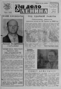 О РГАН С ЕВ Е РН О Г О РАЙКОМА КПСС И Р АЙ ОННОГО С О В Е Т А Н А Р О Д Н Ы Х Д Е П У Т А Т О В НОВОСИБИРСКОЙ О Б Л А С Т И Выходит по вторникам четвертям и субботам Год издания 45-й № 17 (4989) Ч Е Т В Е Р Г 7 Ф Е В Р А Л Я 1980 года Цена 2 ков. НАШИ КАНДИДАТЫ ГОД У Д А Р Н О Й Р А Б О Т Ы Николай Илларионович Т А Р А Н И Н Тракторист колхоза «Заветы Ильича» Кыштовского района Кан ди дат в д е п у т а ты Верховно го Совета РСФСР по Куйбышевскому избирательному о к р у г у № 559 Николай Илларионович Таранин родился в 1934 году в семье крестьянина села Верх-Майзасс Кыштовского района Новосибирской области. После окончания семилетней школы работал в колхозе. Отслужив в рядах Советской Армии, вернулся домой, окончил училище механизации, стал трактористом. Коммунист Н. И. Таранин — механизатор широкого профиля. Он первым в колхозе освоил трактор К -700. Возглавив пять лет назад звено механизаторов, Николай Илларионович добился вместе с товарищами высоких производетвен- .ных показателей. За последние четыре года средняя выработка его звена на эталонный трактор составила почти 15 00 гектаров — значительно больше, чем по колхозу. Николая Илларионовича Таранима отличают трудолюбие, инициатива, большая самоотдача в работе. Он является хорошим наставником для молодых механизаторов. За плодотворный труд передовой механизатор награжден орденом «Знак Почета», знаком «Ударник девятой пятилетки». Н. И. Таранин ведет активную общественную работу, является членом Кыштовского райкома^ КПС . Коммунисты избрали его партгрупоргом, членом бюро партийной организации. И Николай Илларионович оправдывает их доверие, с большой ответственностью относится к выполнению возложенных на него обязанностей. Избиратели Куйбышевского избирательного округа Л: 5 59 Единодушно выдвинули Николая Илларионовича Таранпна кандидатом в депутаты Верховного Совета РСФСР. Товарищи избиратели! В день выборов — 24 февраля 1980 года — все как один отдадим голоса за достойного кандидата нерушимого блока коммунистов и беспартийных Николая Илларионовича Таранина! Социалистические обязательства тружеников к о л х о з а им. М . Г о р ь к о г о на 1 9 8 0 год Претворяя в жизнь исторические решения XXV съезда КПСС,коллектив нашего хозяйства выполнил в 1 9 7 9 году общие объемы по продаже государству зерна, молока, мяса. Зимовка проходит успешно, к фермам вывезены все грубые корма, ведется ремонт техники, заготовка деловой древесины. Руководствуясь решениями июльского ( 1 9 7 8 г.) и ноябрьского ( 1 9 7 9 г.) Пленумов ЦК КПС , труженики колхоза определили на 1980 год более высокие рубежи и обязуются подготовить тракторы, почвообрабатывающие и посевные машины к 20 апреля, зерноуборочные комбайны '•— к I мая, кормозаготовительную технику — к 15 июня. Организовать механизированные звенья на пахоте, подработке почвы, на севе. Заправку и техобслуживание производить на поле. Все работы проводить в лучшие агротехнические сроки и с хорошим качеством. Добиться экономии запасных частей и Горюче-смазочных материалов на два процента к норме. Посеять 1 3 4 0 гектаров зерновых, 5 50 — силосных, 1 50 гектаров — кормовых трав. Получить с каждого гектара зерновых по 13 центнеров, силосных — но 1 5 0 , трав — по 70 центнеров. Собрать всего зерна 23 тысячи центнеров, продать государству — 5 тысяч, засыпать семян 4 5 0 0 центнеров. Посеять 5 5 0 0 гектаров озимой ржи. Заготов