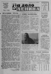 ОРГАН СЕВЕРНОГО РАЙКОМА КПСС И РАЙОННОГО СОВЕТА НАРОДНЫХ Д ЕП УТ А Т О В НОВОСИБИРСКОЙ ОБЛАСТИ Выходит по оторнинам четвергам и субботам Пролетарии всех стран, соединяйтесь! шя л Ф Л ч ш — И — ш — " Год издания 45-й № 35 (5007) Ч Е Т В Е Р г 2 0 М А Р Т А 1 9 8 0 года Цеиа 2 коп. ПРАЗДНИК Т Р У Д А Все трудящиеся нашей страны 1 9 апреля выйдут на коммуни стич еский субботник. Труд миллионов энтузиастов будет посвящен 1 1 0 - й годовщине со дня рождения В. И. Ленина . История комму ни сти че ски х субботников уходит в далений 1 9 1 9 год. Первые ш а ги в это движение, которое потом охватило всю страну, сделали рабочие депо «Москва-Сортировочная». Их было пятнадцать — коммунистов и «сочувствующ их» — членов деповской партийной я ч е й к и . . . 1 2 апреля 1 9 1 9 года, откли к н у в ш и с ь на призыв партии «Работать по-революционному» , они остались после трудового дня еще на 1 0 часов, чтобы отремонтировать три паровоза. Исправные локомотивы повели на фронт воинские эшелоны. Это был вклад московских железнодорожников в разгром Кол ч ака . В. И. Ленин внимательно следил за сообщениями в «Правде» о проявлении трудового героизма рабочих в тылу. В первых суббо тниках он увидел ростки нового, коммунистическо го отношения к тр уду. Опыт масс, начавших строительство социализма, был обобщен им в работе « В ел и ки й п о ч и н » . « Ко мму нис ти чески е суб- ботнини именно потому имеют громадное историческое значение, что они показывают нам сознательный и добровольный почин рабочих в развитии производительности труда, в переходе к новой ^.трудовой дисциплине, в творчестве социалистических условий хозяйства и ж и з н и » , — писал Владимир Ильич. 1 мая 1 9 2 0 года В. И. Ленин принял личное участие в первом Всероссийском празднике свободного труда. Не заработанными средствами исчислялись результаты субботн и к а , а коренным поворотом в сознании тр удящихся . Труд подневольный сменялся трудом на себя. Владимир Ильич увидел в велином почине торжество нового общественного строя. В условиях социализма в отношениях человека к труду все большее значение приобретает личная заинтересованность в его ре зультатах . В нашем обществе труд цдждого умножает общественное богатство и тем самым влияет на дальнейший рост уровня материального благосостояния всад, гр аж да н . Из года в год число уча стников ком м ун и ст ич ески х субботников растет, растет и объем выпускаемой продукции. На средства, заработанные на субботниках, ведется широное строительство н а у ч но-исследовательских центров, медицинских учреждений, трудовых оздоровительных лагерей для уча щ и х с я и других народнохозяйственных объектов. Ударным, самоотверженным трудом достойно ознаменовали советские люди 6 0 - ю годовщину великого почина . Они с эн т у з и а з мом работали в промышленности, в сельском хозяйстве, на транспорт е, на благоустройстве городов и населенных п унктов . Внесли весомый вклад в выполнение плана и обязательств 1 9 7 9 года. На коммунистическом субботнике 21 апреля 1 9 7 9 года у нас в районе работало 7 2 8 6 человек, в фонд п я т и л е т к и было перачи- * г '«4|лено свыше 1 0 тысяч рублей. В этот день участие в труде приняли 2 2 0 пенсионеров, на очиртку территорий школ и сбор вторичного сырья вышли ш к о л ь н и к и . В большинстве организа ций перед началом работ прошли м и т и н г и , на которых выступающие призывали этот день сделать днем 