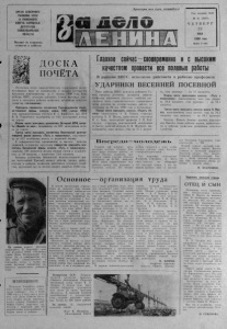 О Р Г АН С Е В Е Р НО ГО Р А Й Н О М А К П С С И Р А Й О Н Н О Г О СО В Е Т А Н А Р О Д Н Ы Х Д Е П У Т А Т О В Н О В О С И Б И Р С К О Й ОБ Л А С Т И Выходит по в т о р н и к а м , че тв е р га м и субботам Пролетарии всех стран , соединяйтесь ! 21 «7/1V Д О С К А П О Ч Ё Т А •смотрев итоги социалистического соревнования молоч- ' но -товарны \ ферм но производству и продаже государству продукции животноводства за 4 месяца 1 0 8 0 года, бюро райкома КПСС, исполком районного Совета народных депу- , татов и президиум райкома профсоюза работников сельского I хозяйства п о с та н о в л яю т : I П р и с у д и т ь первенс тво к о л л е к т и в у Г р а ж д а н ц е в с к о й молоч- || н о -т о в а р н о й фермы к ол х о за имени X X I I съезда К П С С (зав. производственным участк ом Ф. А. Пфафенрот, зав. МТФ '( В. М. Томашенко), надоившему по 8 4 6 килограммов молока '1 на корову. 1 Второе место п р и с у д и т ь к о л л е к т и в у О с т я ц к о й М Т Ф нол хо - 1 за «Борьба за м и р » , надоившему по 8 2 7 килограммов молока на коровуТ р е ть е место п р и с у д и т ь к о л л е к т и в у Веселовской молочнотовар ной ферме кол хо за « П у т ь н к о м м у н и з м у » , получивш е му по 8 2 2 килограмма молока от фуражной коровы. В социалистическом соревновании за высокое качество сдаваемой государству продукции первенство п р и с у д и т ь к о л л е к т и в у Б и а з и н с к о й фермы к ол х о за « П у т ь к к о м м у н и з м у » , сдавшему 1 0 0 процентов молока первым сортом и охлажден- : ного до 10 градусов, с жирностью 3 , 6 4 процента. i Оставить кол л ективу Би а зи н с к о й молочно-товарной фор- I мы переходящий К р а с н ы й вымпел райкома партии, райи сполкома и райкома профсоюза работников сельского хозяй- ства , врученный ему по итогам первого квартала 1 0 8 0 года. U Главное сейчас-своевременно и с высоким качеством провести все полевые работы В райкоме КПСС, исполкоме р ай с о в е т а и райкоме п р о ф с о ю з а УДАРНИКИ ВЕСЕННЕЙ ПОСЕВНОЙ Бюро райкома КП СС , исполком районного Совета народных депутатов, президиум райкома профсоюза работников сельского хозяйства ра ссмотрели итоги социалистического со ревн ован ия ' среди колхозов на весенне-полевых работах по состоянию на 20 мая 1980 года и постановили: Первое место п р и с у д и т ь к о л х о з у « П а м я т ь Л е п и н а » (председатель А. М. Чур ки н , секретарь парткома В. П. Жиров, председатель сельсовета И. А. Гриц, председатель профкома Г- И. Ка й- городов, секретарь комсомольской организации В. Б а к у н , гл ав ны й агроном В. М. Шрейдер), вы полнившему план ярового сева на 27 1 процента v сева зерновых — на 37 процентов. Второе место п р и с у ж д е н о к о л х о з у « П у т ь к к о м м у н и з м у » , вы п олн ивш ему план сева яр овых на 2 4 , 8 процента, сева зерновых — на 3 3 , 3 процента. Т р е т ь е место п р и с у д и т ь к о л х о з у и м ен и К , М а р к с а , вы п ол н и вш е м у план ярового сева на 2 4 . 5 процента, сева зерновых — на 20 ,1 процентаКолхозу «П ам я ть Ленина» вр учи ть переходящее Красное знамя райкома па рти и, р а йи спо л к о ма и райкома профсоюза работников сельского хозяйства. В п е р е д и — Условия, при которых м е х а низа то ры ко л х о з а « З а в е ты И л ь ича» ведут полевые работы , т я желые. П а х а т ь , например, приходится сырые участки. Поэтому вы р а бо тк а на К-700 невелика. И з - з а этого с д е р ж и в а е т с я п од р а б о т к а почвы, сев зерновых- и ко рмовых ку льту р. ; Но мехаиим о л о д е ж ь з аторы стремятс я к тому , чтобы к а ж д а я р аб о ч ая смена б ы л а вы