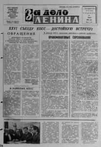 MH tll lH IH tM tl itl tM HM I lH H II Ifl llH tlH IH I li il lH IIl iei ll ll ll ll ll llU « З А Д Е Л О Л Е Н И Н А » « l i i i l H l i i l l i u l l i m m t l l l l H U i l » № 8 3 ( 5 0 5 5 ) 1 9 июля 1 9 8 0 года ПО-ЛЕНИНСКИ ВСТРЕТИМ XXVI СЪЕЗД КПСС Коммунисты, вес советские люди с удовлетворением, единодушным одобрением и воодушевлением восприняли ре- советских людей. Рост духовной культурД Т Р Е Т И Й , ТРУДОВОЙ СЕМЕСТР Шение июньского Пленума ЦК КПСС о созыве 23 февраля 1981 года XXVI с ъ е з д а партии, постановление «О международном положении и внешней политике Советского Союза». В партийных организациях, коллективах трудящихся с Мир — н е п р е х о д я щ а я ц е н ность д л я ч ел о в еч е ст в а . С С С Р — з н ам е н о с е ц м ир а. Л ен и н с к а я м иролю бивая внеглубоким интересом изучаются доклад товарища Л. Й. Бреж- шняя политика КПСС. И с т о р и ч е с к и е успехи с тр а н соц и а ли зм а . С о ц и ал и стич еск о е с од руж ест - нева, документы Пленума ЦК КПСС. Партийные комитеты, идеологический актив широко раз вертывают массово-политическую и пропагандистскую рабо ту, боевое социалистическое соревнование за успешное выпол- 80 г>— могучий бастион мира, нение плана завершающего года пятилетки, достойную встречу XXVI с ъ е з д а КПСС. В помощь организаторам единых политдней, общественно-политических чтений, докладчикам, лекторам, пропагандистам, политинформаторами и агитаторам публикуется примерная тематика выступлений. В а р ш а в с к и й Договор и Совет Эконом ической В заим опомощ и н а д еж н о с л у ж а т д е л у м и р а и прогресса. КПСС и мировой р ево лю ци онный прогресс. П р о л е т а р с к и й ин т е р п а ц и о н а - V От с ъ е з д а к с ъ е з д у — ле- Все пу ско вы е о б ъ е к т ы — в л и зм — бо ево е з н а м я комму- нинским ку р с о м . строй . нистов. Л. И. Б р е ж н е в об о сновны х Досрочно построим — дос- Н а ц и о н а л ьн о - освободите.>ьз а д а ч ь х шЭДготовки к XXV J рочно освоим. ное д в и ж е н и е на с о в р ем енном с ъ е з д у п ар тии . Р а б о т е тр а н с п о р т а — чет- этапе. К П С С — п у к о в о п я ш а я и кий р и т м - Р а з о р у ж е н и е — в е л е н и е вре- ,ч а п т в л я к 1шаяРУс и л а Д К т с ж о Увеличим прои зводство з е р - мени. Г Й Г ? П а о т и я в уело . на> обРа з Ч °во про в е д ем убор- Р а з р я д к а — з а к о н о м ер ны й ку у р о ж а я . р е з у л ь т а т с л о ж и вш е г о с я ссотв и я х р а з в и т г с j л Н* Ж и в о тн о в одс т в о — у д а р н ы й ношения сил на мировой а р е н е . J Н а ш а эп о х а э п ох а тор- ^ р о н т А в а н тю р и ст и ч е с ки й к; рс жества марксизма-ленинизма. У к р е п л е н и е дисциплины — СШ А — главный и сточник Л е н и н и з м з н а м й ревс<- в а ж н ы й ф а к т о р э ф ф е к т и в н о г о н а п р я ж е н н о с ти и у г р о зы миру , лю ц и он н ой б о р ь б ы , к е м м у н и - хо з я й с т в о в а н и я . М и л и т а р и с т с к а я а к ти в н о с т ь с т и ч е ск о г о с о з и д а н и я и м и р а . Э кономия и б е р еж л и в о с т ь НАТО. Т р у д ы Л. И. Б р е ж н е в а - - ^ м °щаь «е резервы...... п о д р ы в н ы е д е й ст ви я п е кин с ких р у к о в о ди т е л е й против сил м и р а и про гр е с са . '’к р у п н ы й в к л а д в те о р ию и Р а з в и т и е по л и тич еск ой сис- п р а к т и к у н а у ч н о г о коммунизм темы СС С Р . ма. ^ К о н с т и т у ц и я С С С Р основ- Идейное противоб ор ст во д вух , НепЬко1лебиМое е д и н с т в о «ой З а к о н нашей жи зни . ^ п а р т и и и н а р о д а . Т п п ж р г т п п п р н и н р к о й НЯ 1 ШП с о ц и а л ь ны х систем. н а л ьн ой политики КПСС. Ц hIC „ f Г т п а ^ ^ а п ™ 6 и ми Р а з в и т о й с о ц и а л и з м — з а - ъ , д р у ж ба и б р а т с т в о со ветских ЛЬ1 н