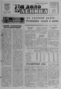 ОРГАН СЕВЕРНОГО РАЙКОМА КПСС И РАЙОННОГО СОВЕТА НАРОДНЫХ Д Е П У Т А Т О В НОВОСИБИРСКОЙ ОБЛАСТИ Выходит по вторникам, четвергам и субботам. .Ъ_ Пролетарии всех стран, соединяйтесь! x i * g / m Газета основана 20 июля 1935 года № 10 0 ( 5 0 7 2 ) Ч Е Т В Е Р Г 4 СЕНТЯБРЯ j 1 9 8 0 г о д а Ц е н а 2 к о п . Н А У Д А Р Н О Й В А Х Т Е — ТРУЖ ЕНИКИ ПОЛЕЙ И Ф Е РМ УСЛОВИЯ СОРЕВНОВАНИЯ АВ ТО ТРАНСПОРТНИКОВ Исполкомом Новосибирского областного Совета народных депутатов и президиумом областного совета профсоюзов разработаны условия социалистического соревнования коллективов автотране- »*11Иных предприятий, принимающих участие в уборке и вывозке зерна и другой сельскохозяйственной продукции урожая завершающего года десятой пятилетки. Утверждены четыре переходящих Красных знамени и четыре денежные премии по тысячи рублей каждая, которые присуждаются автотранспортным подразделениям, занявшим классные места в этом соревновании. Присуждение классных мест прово-* дится облисполкомом и обл- совпрофом по итогам работы за декаду. Победителями в социалистическом соревновании признаются коллективы автотранспортных предприя1- тий, добившиеся наивысшей выработки на- списочную автотонну грузоподъемности автомобилей и прицепов, выделенных для перевозки сельскохозяйственной продукции, наивысгаего коэффициента использования автопарка, наибольшей экономии горючего. ^Главнейшим условием для 'П р и су ж д ен и я классных мест является безусловное соблюдение автомобилистами высокой трудовой дисциплины, обеспечение безаварийной ра боты. Коллективы автотранспортных подразделений, получившие денежные премии, расходуют их для поощрения водителей, инженерно-технических работников и других производственников, добившихся наиболее высоких показателей. Материалы по выполнению условий соревнования автотранспортными предприятиями, автоколоннами и Ч^га^угими автотранспортными по дразделениями согласовывают ся с райисполкомами и пред-"" ставляются на рассмотрение вышестоящим транспортным организациям. Западно-Сибир ское территориальное транспортное управление обобщает их и представляет сведения в облисполком для определения победителей. Утверждены условия присвоения передовым водителям автотранспортных предприятий звания «Отличник автомобильных перевозок сельскохозяйственных продуктов уро жая 1 9 8 0 года». Это почетное звание присваивается с одновременным вручением По четной грамоты исполкома областного Совета народных депутатов водителям, добившимся наиболее высоких показателей при перевозке зер па и других сельскохозяйственных продуктов. Материалы о результатах работы передовых водителей направляются Iруководителями автотранспортных предприятий и местными комитетами профсоюзов в адрес своих вышестоящих организаций, руково дители которых представляют их для рассмотрения в облисполком. По условиям соревнования предусмотрено присвоение звания «Герой жатвы» и «Мастер уборки урожая». Звание «Герой жатвы» присваивается шоферам, выполнившим за период уборки урожая не, менее двух норм, а при ра-* боте двух водителей на одном автомобиле — не менее полутора норм, обеспечившим! сохранность автомобилей, без опасность движения, экономию горючего и смазочных материалов. Передовикам, удо стоенным такого звания, вру чаются дипломы и памятные знаки «Герой ж