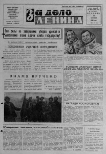 Газета основана 20 июля 1935 года № 112 (5 0 8 4 ) В Т О Р Н И К 3 0 С ЕНТЯБРЯ 1 9 8 0 года Цена 2 коп. ■ '-— " ОРГАН СЕВЕРНОГО РАЙКОМА КПСС И РАЙОННОГО СОВЕТА НАРОДНЫХ Д ЕГЩ А ТО В НОВОСИБИРСКОЙ ОБЛАСТИ Выходит по вторнинам. четвергам и субботам. Все силы на завершение уборки урожае и рыволнение плана сдачи хлеба государству! В райкоме КПСС, райисполком е, райкоме п р о ф с о ю з а ПЕРЕДОВИКИ УДАРНОЙ ПЯТИДНЕВКИ Бюро Северного райкома КПСС, исполком районного Совета народных депутатов и прези Диум райкома профсоюза работников сельского хозяйства рассмотрели итоги социалистического соревнования колхозов на уборке урожая г дни ■ударной пятидневки и постановили: Первое место присудить колхозу «Память Ленина» (председатель М. В. Лукашов, секре тарь партбюро В. П- Жоров. председатель Верх- Красноярского сельсовета И. А. Грнц, председа тель профкома Г- И. Кайгородов, секретарь ком Г'омольской организации В. Бакун, главный агро ном В. М. Шрейдер), обмолотившему в дни удар ной пятидневки 1 1 3 3 гектара зерновых при хо рошей организации трудаВручить колхозу «Память Ленина» переходя щее Красное знамя райкома КПСС, исполкома райсовета, президиума райкома профсоюза работ ников сельского хозяйства; поднять в честь колхоза флаг Трудовой Славы. Отметить положительную работу на уборке урожая в период ударной пятидневки колхозы имени М. Горького, «Путь к коммунизму» и * .«V.II съезд Советов». З Н А М Я В Р У Ч Е Н О Включившись в ударную пятидневку, объявленную по инициативе Новосибирского обкома КПСС,исполкома обла стного Совета народных депу татов, облсовпрофа и обкома ВЛКСМ, труженики колхоза «Память Ленина» добились высоких показателей на убор ке урожая- Но итогам социа диетического соревнования хозяйство заняло первое место. Ему и было вручено перехо дящее Красное знамя райкома партии, райисполкома и пре .зидиума райкома профсоюза работников сельского хозяйст ва. На снимке: Красное знамя кручено звену И. И- Ковязина. Фото А. Шишкина. М еж д у н а р о д н ы й э к и п а ж к о с м и ч е с к о г о к о р а б л я „ С о ю з - 3 8 '—к о мандир к о р а б л я , л е т ч и к - к о с м о н а в т С С С Р , Герой С о в е т с к о г о С о юза, п о лк о в н и к К). В. Р о м а н е н к о ( с п р а в а ) и к о с м о н а в т - и с с л е д о в а тель , г р аж да ни н Р е с п у б л и к и К у ба , п о д п о л к о в н и к А р н а л ь до Т а майо Мендес. Ф о т о А. П у ш к а р е в а . УСПЕШНО ЗАВЕРШЕН ПОЛЕТ МЕ ЖДУ НА Р ОДНОГ О ЭКИПАЖА 26 сентября 1980 года после успешного выполнения семцсу точной программы совместных исследований и экспериментов на борту орбитального комплек са «Салют-6» — «Союз-37» — «Союз-38» м еж д у н а р о д н ы й э ки паж в состав е Героя Совет ского Союза л етч ик а-к о см о н ав та СССР Юрия Ром ан ен ко и кос м о н а в т а - и с с л е д о в а т е л я г р а ж д а нина Республики Куба Арнальдо Там ай о Мендеса во звр а ти лс я на Землю. Р а б о т у на станции «Салют-6» п р о до лж а ю т космонав ты то варищи Попов и Рюмин. Спускаемый а п п а р а т космичес кого ко р а бл я «Союз-38» совер шил посадку в за д ан н ом районе территории Сов етского Союза в 175 километрах юго-восточнее города Д ж е з к а з г а н а . Самочувст вне товарищей Романенко и Та майо Мендеса после приземления хорошее. П о л ет м е ж д у н а р о д н о г о экипа ж а с участием кубинского кос м о н ав та — первого п р ед став и тел я социалистического г о с у д а р с т в а з а п а д н о г о полуш ари я — проде мон стри ров ал дальн
