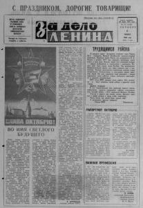 С ПРАЗДНИКОМ, ДОРОГИЕ ТОВАРИЩИ! ОРГАН СЕ В Е Р Н О ГО РАЙКОМА КПСС И РАЙОННОГО СО ВЕТА НАРОДНЫХ ДЕПУТАТОВ НОВОСИБИРСКОЙ ОБЛАСТИ Выходит по вторнинам- четвергам и субботам. Пролетарии всех стран , соединяйтесь! Газета о с н ов ан а 2 0 июля 1935 г ода № 131 (5103) Ч Е Т В Е Р Г 6 Н О Я Б Р Я 1 9 8 0 гопа Цена 2 коп. ВО ИМЯ СВЕТЛОГО БУДУЩЕГО ТРУДЯЩИМСЯ РАЙОНА В расцвете своего могущества встречает н аша Родина 63 -ю годовщину Великой Октябрьской социалистиче ской революции. Народные массы России под руководством В. И. Ленина в далеком 1 9 1 7 году свершили революцию, взяли власть в свои руки. Начался новый этап всемирной истории — поворот человечества от капитализма к социализму. В ы соко несет н аша страна знамя Октября. Под руководством Коммунистической партии наш народ уверенно идет к коммунизму. Успешно в ы по лн яю т ся намеченные партией планы материального благосостояния и к ул ь т у р н ого уровня советских людей. Все свои свершения люди св я зы в аю т с мощью нерушимого союза рабочего класса, колхозного к р е с т ь я н с т ва и народной интеллигенции. X X V I съезд К П С С подведет итоги работы 1 0 _й пя тиле тки и будут намечены новые рубежи в развитии пашей страны. Дорогие товарищи! В этот т оржественный день ра йонный комитет партии, райисполком сердечно поздравляют рабочих, нолхознинов, всех жителей района с 6 3 й годовщиной Белиного Октября. С ч аст ья и радости вам, вашим семьям. Крепкого здоровья и новых успехов в труде, учебе, творчестве. П у с т ь всегда над землей будет мирное небо! С праздником, дорогие товарищи! Райком К П С С Райисполком РАПОРТУЮТ ОКТЯБРЮ Зимовку 1979-80 годов наше хозяйство начало с низкой кормовой базой. Всего было заготовлено 11,1 центнера кормовых единиц на условную голову. Несмотря на это работники животноводства взяли повышенные социалистические обязательства — надоить по 22—23 центнера молока от каждой фуражной коровы, получить на 60 гр ам мов больше планового срод- несуточного привеса молодняка. На днях многие работники животноводства рапортовали партийному бюро и правлению колхоза, что взятые о б я зательства на завершающий год десятой пятилетки выполнены к 63-й годовщине Великого Октября. Доярки Елена Савельевна Бузюргнпа, Нина Васильевна Коржова надоили от закрепленной за ними группы коров по 2377—2380 килограммов молока. Скотники дойных гуртов В. И. Туро- вец, А. П. Лобков и В. И. Язиков при обязательстве получить по гурту 21 центнер молока, обеспечили надой по 22 с лишним центнера. Замечательных успехов в труде добилась телятница Прасковья Ивановна Куприянова — среднесуточный привес каждого теленка, до шестимесячного возраста , составил за десять месяцев более восьмисот граммов. Я должен сказать, что многие труженики нашего хозяй ства 63-ю .годовщину О к т я б ря встречают добрыми ■'•рудовыми и общественными делили. В. УЗКИХ, секретарь парторганизации колхоза «VII съезд Советов». ВАЖНАЯ ПРОФ ЕССИЯ Наша стран# пра зднует 63-ю годовщину Великой О к тябрьской социалиста ческой революции. За годы Советской власти народ, во згл авляемый ленинской партией коммунистов, построил р а зви тое социалистическое общество, утвердил новый, социалистический образ жизни. Переустройство нашего об щества обеспечило его невиданный, всесторонний прогресс. В исторически минимальные сроки огромная о т с т а лая страна превратилась в страну высокоразвито
