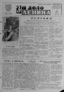 ОРГАН СЕВЕРНОГО РАЙКОМА КПСС И РАЙОННОГО СОВЕТА НАРОДНЫХ ДЕПУТАТОВ НОВОСИБИРСКОЙ ОБЛАСТИ Выходит по вторникам, четвергам и субботам. П р о л е та р и и всех стр а н, соединяйтесь! U Д « / | 1 | 1 а а Газета основана 2 0 июля 1935 года № 139—140 (5111— 5111) II Я т н и ц л 28 НОЯБРЯ 1 9 8 0 года Цена 2 коп. В честь доярки Когда в колхозе им. К. Марка подвели итоги социалистического соревнования работников животноводства за десять месяцев, то оказалось что лучших результатов добилась доярка Дарья Васильевна Подъява. Она надоила по 2440 килограммов молока от коровы, в том числе за октябрь по 157 килограммов. В честь Д. В. Подъявы была выпущена “Молния", извещающая о с е трудовой побе де , Д. В. Подъява работает на Ичкалинско’й ферме, у нее большой трудовой стаж и б о г а той опыт, пользуется в in ллективе за с л уж ен ным уважением. И. С|1Г,ПРЦЕВ. Плакат художника В. Кононова. Мздатеть- ство „Плакат”. Фотохроника ТАСС у с л о в и м районного социалистического с ор евн овани я к ол хо з ов и р а й с е л ь х о зт ёхни ки за св о е в р ем ен н ую и качественную подготовку машинно-тракторного парка к полевым работам 1981 года И целях дальнейшего повышения трудовой ак ти вн о сти и развития творческой и ни циа ти вы механизаторов, инженерно-технических работников колхозов районный комитет КПСС, исполком районного Совета народных депутатов и президиум районного сонета профсоюза работников сельского хозяйства объявляют социалистическое соревнование за своевременную и к а чественную подготовку сельскохозяйственной т е х н и к и к полевым работам 19 8 1 года. 1лавное внимание соревнующихся сосредоточивается на — выполнении уста новленных заданий колхозам и райсельхозтехнике по ремонту и готовности машинно- тракторного п ар ка к полевым работам 1981 года; — организации подготовки и пере- тодготовки механизаторских кадров 'а всех видах обучения; — повышении эффективности использования сельскохозяйственной те х ни ки и ее хран ении согласно требований ГОСТа; . — организации специализированного те хниче ского обслуживания машинно-тракторного п ар ка мастерами" наладчикамщ — широком внедрении в сельскохозяйственное * производство достижений н а у к и , передового опыта, прогрессивных форм организации труда; — создании нормальных нрбизвод- сгвенно-бытовых условий рабочим, занятым на ремонте, соблюдении тре- бонаний те х н и к и безопасности и производственной санитарии. При подведении итогов социалистического соревнования преимущества будут отдаваться тем хозяйствам, к о торые имели более напряженные платы по ремонту те х н и к и и обеспечили их успешное выполнение. Итоги социалистического соревнования будут подводиться па I января, I мая, 1 августа 1981 года. Победителями социалистического соревнования признаются хозяйства, обеспечившие на 1 января 1981 года: — по став ку на хранение всей сельскохозяйственной те х н и к и в соответствии с требованиями ГОСТа. — выполнение квартального плана ремонта машинно-тракторного парка ; — готовность почвообрабатывающих и посевных машин не менее 90 процентов, тракторов — 85 , грузовых автомобилей — 8 0 , зерноуборочных комбайнов — 65 , машин для заготовк и кормов не менее 50 процентов. На 1 мая: — выполнение плана ремонта машпнпо тракторного парка за 4 месяца s J 9 8 l года; готовность комбайнов — на 100 процентов, посевных и почвообрабатывающих машин — па 100 , г