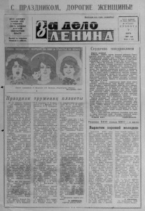 С П Р А З Д , Д О Р О Г И Е Ж Е Н Щ И Н Ы ! О Р ГАН С Е В Е Р Н О Г О Р А Й К О М А К П С С И Р А Й О НН О Г О С О В Е Т А Н А Р О Д Н Ы Х Д Е П У Т А Т О В Н О В О С И Б И Р С К О Й ОБЛ АСТИ Вы ходит по вторникам, четвергам и субботам. Пролетарии всех стран, соединяйтесь! h u s /i i u 7 1 Галета основ ана 20 июли 1935 гоДа № 2!) (5 1 5 7 ) С У Б Б О Т А 7 М А Р Т А 1 9 8 1 года Цена 2 кон. П л а к а т х у д о ж н и к о в Л . Бель ск ого и В. П о тапо в а . « И з д а т е л ь с т в о «П л ак ат» . Ф отохроника ТАСС I Пр а з дник тружениц планеты 69 лет женского д в и ж е н и я — это героические страницы истории, это д еся тки судеб женщин, св яз а вш и х свою ж и з н ь с пролетарской б о р ь бой за победу со ц и ал и сти ческой революции, з а св ободу и независимость молодой Рес публики Советов, з а п р е т в о рение в я в ь великих п р е д н а чертаний В. И. Л ен и на по и ндустриализации, ко л л е к т и в и з ации народного х о зяй с т в а . В числе ударников первых п я тилеток было немало ж е н щин, работающ их на ф а б р и ках, з а в о д а х , в к о л х о з а х и с о вхоз ах , на транспорте во всех о т р а с л я х нар о д но го х озяй ств а . Большим испытанием д л я всего советского н а р о д а с т а л а В ели кая О течеств енная война 1941 — 1945 годов с фаш истскими з а х в а т ч и к а м и . Женщины заменили м уж ей , б р ать ев , ушедших на фронт, они сами уходили на фронт: были зенитчицами, м е дс ест рами, снайперами, л етчицам и, р азв ед ч иц ам и . Свыше 150 тысяч из них отмечены о р ден ами и медалями Родины, 91 удостоены высокого з в а ния Героя С оветского Сою за . В Северной МТС на к у р сах комбайнеров и ш т у р в а л ь ных обуча лос ь свыше 30 ж е н щин и дев ушек . Многие из них проводили своих мужей и б р ать ев на фронты В ели кой Оте честв енной войны. Учеба д ли л ас ь по 12 часов в день — с 7 утра д о 7 вечера. А когда оканчивали курсы, девушки, женщины нач инали р а б о т а т ь , и р а б о т а т ь так , к а к того т р е б о в а л о военное время. Весной 1942 года п р о с л а в и л а с ь ж е н с к а я т р а к т о р н а я б р и г а д а комсомолки Н а т а льи Ведерниковой из к о л х о з а имени Тельмана . Этот коллек тив план се ль с к о х о зяй - $ ственпых р а б о т выполнил на $ 123 процента. Второй по выН р а б о т к е о к а з а л а с ь б р и г а д а g Б а р а н о в о й из ко л х о з а « Б о р ь б а з а пятилетку». Н а фронтах Великой О т е чественной войны были наши з ем лячки — М. Д . Кове ренко , П. И. Кова ленко , Е. Я. М а к а - ревека я, Е. Г. Ф р олов а , П. И. Бы к о в с к а я , Л. Н. К ай городо - ва. . С окончанием Великой Оте чественной войны перед сов етским народом встали за д ач и восстановления н а р о д ного х озяй ств а , д а л ьн ейш е го роста экономики, с о в ерш ен ст в о вани я социалистически х о б щественных отношений, р а з в и тия социалистической к у л ь т у ры. Советские женщины с неослабевающей энергией вклю чились в решение этих з а д ач , поставленных партией. Новые, невиданные ранее з а д а ч и , поставили перед т р у ж ени к ам и предприятий, к о л х озов и совхозо в, всех о т р а с лей народного х о зяй с т в а XXIV и XXV съ езды КПСС. И к а ж д ы й форум ком м у ни стов страны отмечал, что з а д а ния выполнялись с честью, что в успех всего народа немалый в к л а д внесли с о в е т ские женщины. Об этом г о в орят факты. В межколхозной ПМК с гордостью н а зы в а ю т имена И. А. Андреевой, К. Ф. Коло - тыгиной, Н. К. Ильиной. Они — ш т у к а т у р ы -м а л я р ы , д о б и лись в среднем за 1980 год выработки по 120 процентов. Все ста р аю т с я д е л а т ь х о р о шо, качественно. Хорошим