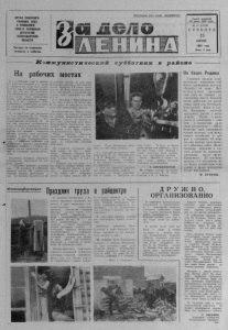 ОРГАН СЕВЕРНОГО РАЙКОМА КПСС И РАЙОННОГО СОВЕТА НАРОДНЫХ ДЕПУТАТОВ НОВОСИБИРСКОЙ ОБЛАСТИ Выходит по вторникам> четвергам и субботам. Газета основана 20 июля 1935 года_ № 51 (5179) С У Б Б О Т А 25 А П Р Е Л Я 1 9 8 1 года Цена 2 коп. = К о я ж ш у н н с т н ч е с ю ж ш с у б б о т н и к ж р а й о н е Н а р а б о ч и х м е с т а х Ь то субботнее утро к проход пои райсельхозтехники и к конто [ е предприятия люди шли также дружно, как и в обычные буднич r u e дни. Но все же чувствовалась необычность предстоящей ра бтчеч смены: были оживленные беседы повстречавшихся тов арищей, то и дел.) слышалось слово «субботник», прийетствия неизмен но кончались поздравлением с праздником труда. В который уже раз незадолго до дня рождения В. И. Ленина мы выходим на субботник — ком мунистический, ленинский, В та кие дни невольно вспоминаются слова создателя Советского госу папства и его Коммунистической партии, ч :о лучшим подарком юбилею должны стать трудовые подарки. Советские люди верны заветам Ленина. Доказательством тому — «красные субботы» сов ременности, прямые наследницы «великого почина», в которых а к тивное участие принимали и р абочие, и служащие райсельхозтех- никн. Валентина Летецкая, экономист предприятия, передавала по теле фону данные: — Штатных рабочих и служа щих — 93 человека. В субботнике приняло участие 108: пришли пен сионеры- некогда работавшие у нас. 44 человека трудят ся на сво их рабочих местах. За день отре монтируют трактор и два автодви гателя. Отгрузят 1,2 тонны метал лолома. В фонд пятилетки отчие лптся 320 рублей, а товарной про дукцнн будет выпущено на 1200 рублей. О .о т разговор с Новосибирском у нее был почти в Н часов дня. В эго время во всех цехах мастер спой шлА напряженная работа. Механический цех. Только откро ешь дверь, как наружу вырывает ся ровный, многоголосый рокот токарных станков. За первым из них стоит известный всем Иван Александрович Кайгородов, коммунист, член районного комитета партии и его бюро, ударник коммунистического труда. Рядом работает Анатолий Емельянович Скоробогатов — не менее известный токарь, у в а ж а емый в коллективе, опытный специалист. По соседству установлен еще одни станок. З а ним — Александр Андреев, молодой коммунист: два года назад его приняли в члены партии, С ним и беседую. — Сегодня мы все одно и то же делаем: шайбы. Впрок готовим, Маленькая деталь, а нужная, — рассказывает рабочий. — По норме мне, например, нужно за смену выдать 450 д е талей. Я же постараюсь выточить па 100 штук больше, А у слесарей по ремонту авто двигателей В. П. Томашевского и В. А. Фирсова — свои дел; : Владимир Петрович, например, в эти минуты готовил к обкат ке двигатель. —' Для сто обкатки, учитывая все вспомогательные работы — установку на стенде, подключение и прочее — требуется в о семь часов. То есть, до шести часов вечера мне работать с ним. Но пока будет идти обкатка, я успею расточить блок цилиндров для «уазовского» мотора. Таким образом, и здесь с с а мого утра работа началась слаженно, организованно. А. ШАРАПИНСКИЙ. На снимке: слесари по ремонту автодвигатслей В. П. Томашевский и В. А. Фирсов. На благо Родины Ударным трудом о зн а мсновали «красную с у б боту» труж еники колхо за «Б ор ь ба за мир». В с е встали в этот иразднич нып день на з а р а н е е ус ловленные места. Волыни нство р а б о т а л о на расой ловке дров для Остяцкой, Ургульской ферм и клуба. Вет