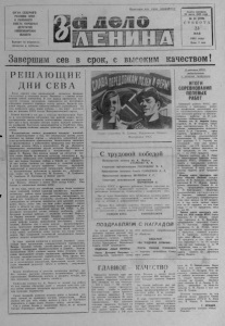 ОРГАН С Е В Е Р Н О ГО РАЙКОМА КПСС И РАЙОННОГО С 0 8 Е Т А НАРОДНЫХ Д ЕП УТА ТО В НОВОСИБИРСКОЙ ОБЛАСТИ Выходит по вторникам, четвергам и субботам. Г азета основ ана 20 июля 1_935 года № 62 (5190) С У Б Б О Т Л 23 МАЯ 1981 г о д а Цена 2 коп. Завершим сев в срок, с высоким к а ч е с т в о м ! Р Е Ш А Ю Щ И Е Д Н И С Е В А Весна первого г о д а од ин н ад ца то й пятилетки п р и зв а л а з ем ледельцев к ожившим полям. Посевная — г л а в н а я се г о д н яшняя з а б о т а хлеборобов. В этот период п роверяется м а с т ерс тво сельских тр уж е ни к о в , п р о я в л я е т с я их настойчивое стремление з а л о ж и т ь хорошую осн ову у р о ж а я . Вы с о к и й т р у довой подъем , р азви тие социалистического соре внов ания на селе, решимость в зя т ь ровые р у б еж и — это отв ет колхоз ам ков на решения XXVI с ъ е з д а Коммунистической партии. Боевой настр ой в эти дни у сельск их ме ханиза торов. Г о р я чо и заи н тер ес о ванн о о б с у ж д аю т они рабочие планы, п р е д у см атривающие максимальное использование к а ж д о г о весеннего дня и ч а с а , к а ж д о г о г е к т а р а пашни, к а ж д о г о ки л о г р ам ма удобрений. Тщательно про дум ыв аю тс я в х о зяй с т в а х меры, чтобы техника/, особенно мощные тр а к т о р ы , р а б о т а л а в две смены. Патриотические почины, родившиеся н ак ану н е посевной, яр к о свиде тель ствую т о том. что зе м ле де льцы района делом отв еч аю т на призыв партии — обеспечить дальнейший рост се льскохозяйственного п р о изв о д ств а . З а ч и н а т е л ям и движ ени я з а орган и зованн ое и качественное проведение с е в а выступили полеводы колхоза « П у т ь к коммунизм у». На их обращение откликн улись земледельцы д ругих колхозов . Включились в социалистическо е соре внов ание и м е х ан из а то ры колхоза имени К. М арк са . Они решили первый год пятилетки с д ел а т ь годом борьбы з а высокую к у л ь т у р у з ем леделия и к а чественное проведение всех сель ск охозяйств енных р аб о т . И вот он а п ерв ая т р у д о в а я п о бе да в борьбе з а у р ож ай -81 . 19 м а я колхоз з акончил сев зе рновых и силосных куль тур , В этом большая з а с л у г а правления к о л х о з а , партийной, профсоюзной и комсомольской организаций , сельского Совета, идеологических р аб отн ик ов и, конечно ж е , м е х а н и з а т о ров, таких, к а к И. С ав асг е ев , М. Ти хонов, Л. Трофимов, М. Дпиброев, В. Прохоров и многие другие. С подъемом готовились к н ачалу с е в а земледельцы кол хоза «П ам я ть Лен и на » и имени XXII с ъ е з д а КПСС. Они близки к за вершению полевых работ. В э ту пору, к о г д а все х о з я й с т в а з а с е я л и более половины своих п лощ адей , особый х а р а к т е р п р ио б р ета ет м а ссово -п о литическая р а б о т а среди сельск их тр уж ени к о в . Идеологические работники д о лж ны сейчас всемерно п о д д е р ж и в а т ь ц а рящий дух тв орческого эн т у з и а з м а , х о зяй ск о го беспокойства зем ле де льцев за успешное за в ерш ен ие всех весенних полевых р абот Пусть знают они, что наш рай он з ан и м а е т первое м е с т о ’ в области по се ву. Труженики полей конкретными д е лами ответили на первомай ск ий призыв ЦК КПСС « . . .Э ф фективнее исп ользуйте землю, технику , удобрения, корма! Весенним полевым р а б о т ам — отличное качество! П о р а д у ем Родину высоким у р о ж а ем !» Большое зн ач ение имело конкретное оп ределение з а д а ч , заб л а г о в р ем е н н о е с о с т а в ление рабочих п лан ов, п р о д у м ан н а я р а с с т ан о в к а к а д р о в , техники . Д о ба ви м еще к э