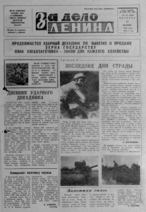 ОРГАН СЕВЕРНОГО РАЙКОМА КПСС И РАЙОННОГО СОВЕТА НАРОДНЫХ ДЕПУТАТОВ НОВОСИБИРСКОЙ ОБЛАСТИ Выходит по вторникам, четвергам и субботам. П р о ле т ар и и в с ех с т р а н , с о е д и н я й т е с ь ! Г а з е т а осно ван а 20 июля 1935 го д а № 112 (5240) Ч Е Т В Е Р Г 17 С Е Н Т Я Б Р Я I 1981 года Ц е н а 2 к о п . ПРОДОЛЖАЕТСЯ УДАРНЫЙ ДЕКАДНИК ПО ВЫВОЗКЕ И ПРОДАЖЕ З Е Р Н А Г О С У Д А Р С Т В У ПЛАН ХЛЕБОЗАГОТОВОК — ЗАКОН ДЛЯ КАЖДОГО ХОЗЯЙСТВА! 8 ЗВЕЗДА ТРУДОВОЙ С Л А ВЫ ЗАЖЖ ЕНА В ЧЕСТЬ У Б О РОЧНО-ТРАНСПОРТНОГО З В Е НА И. И. КОВЯЗИНА ИЗ КОЛХОЗА «П АМ ЯТ Ь Л Е Н И НА», НАМОЛОТИВШЕГО С НАЧАЛА УБОРКИ УРОЖАЯ 18 40 0 Ц Е Н Т Н Е Р О В ЗЕРНА. СЛАВА П ЕРЕДОВИКАМ Ж А Т В Ы -8 1 ! i НЕВНИК УДАРНОГО ДЕКАДНИКА Прошло п я т ь дней ударного де кадника по вывозке хлеба го с у д а р с тв у . К а к известно, за де сять дней — с I I по 21 сентября — колхозы района должны отправить на Северное хлебоприемное предприятие 2 4 т ы с я ч и центнеров зерна. На этот период для всех х о з я й с тв доведено задание. Оно признано обязательным. К а к же выполн я е т с я оно? В э т у п я ти д н е в к у колхо зы зДэша^ Р од ин а » , « В о с х о д » , име Маркса в хлебосдаче не уч ас тв ов али . Наиболее активно вывозил зерно с колхозного тока на приемный п у н к т колхоз «П ам я ть Л е н и н а » ; Отсюда поступ ило около 3 3 0 0 центнеров зерна. 11 и 12 сентября для водителей этого х о з я й с тв а оказа лись днями наибольшей вы работки : они доставили по т ы сяче центнеров зерна. Ежедневно учас твов ал в х л е босдаче колхоз « П у т ь к комм у н и зм у » . 2 2 6 0 центнеров прин я л и от этого х озя йс тв а за первую половину де кадника . Неплохо была организована вывозка зерна в колхо за х имени X X I I съезда КПСС и « З а веты И л ь и ч а » . Из последнего, например, за три дня ( 1 3 15 сен тябр я) на хлебоприемное предприятие было доставлено около 1 4 0 0 центнеров зерна . Продолжал сдачу зерна и колхоз имени М. Горького. В дополнение к сданным восьми ты сяч ам он отправил еще около т ы с я ч и центнеров. Первые 4 0 0 центнеров зерна поступили из колхоза «Борь ба за мир». Т а к и м образом, на хлебоприемное предприятие за первую п я т и д н е в к у декадника п о с т у п и ло почти 1 0 т ы с я ч центнеров зерна нового урожая . Задание, полученное колхоза ми района, напряженное . Оно потребует от сп ециалистов сельского х о з я й с тв а , от бригадиров и заведующих производственными у ч а с т к ам и , от работников с уш и л ок и механизированных токов четкой организации т р у да, быстрейшей обработки зерна н отправки его в г о с у д а р с т венные закрома. За ве рш аю т за го то в ку кормов В Веселовской бригаде колхоза « П у т ь к коммунизму» под силосными к у л ь т у р ам и было занято 2 6 5 ге к таров . На и х уборк у выехали опытные м е ханиза торы , много лет работающие на пол я х . 3 . М. В я т к и н и И. 3. Харитонов скоси ли всю э т у площадь. Сейчас в Веселой заложено 4 2 9 0 тонн зеленой массы . Заготов ка силоса идет и в Биазинской бригаде. Здесь предстояло убра ть 6 4 0 г е к т а ров подсолнечника. Тр а к т о р и с т ы В . Г . Сидоров, А . В . Соболев , I I . И . Новиков т р у д и л и с ь добросовестно, перевыполняв дневные задания . Это позволило им в короткий срок скоси ть силосные с 5 9 3 гектаров . 3. М. В я т к и н и И. 3. Харитонов т а к же продолжают заготавливать ценный корм. Они вместе с остальными кормозаготовителя- ми намерены в ближайшие два дня завершить за к л а д к у силоса. В Би ази нско й бригаде уж е приготовлено на предстоящую з и мовку 7 8 5 2 