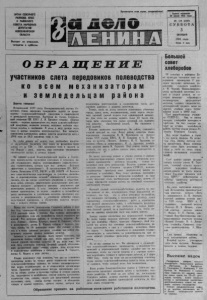 ОРГАН СЕВЕРНОГО РА Й КОМ А КПСС И РАЙОННОГО СОВЕТА НА РО ДНЫ Х Д Е П У Т А Т О В НОВОСИБИРСКОЙ ОБЛАСТИ Выходит по вто рникам, четвергам и субботам. Пролетарии всех стран , со единяй тесь! О Б Р А Щ Е Н И Е участников слета передовиков полеводства к о в с е м м е х а н и з а т о р а м и з е м л е д е л ь ц а м р а й о н а Дорогие товарищи! Исторический X X V I съезд Коммунистической пар тии Совет ского Союза определил грандиозные задачи по производству сельскохозяйственной продукции в одиннадцатой и двенадцатой п я т и л е т к а х . В ы с т у п а я на съезде, Генеральный секретарь Ц К КПСС Л . И. Брежнев говорил: «Первая задача — поднять производство т е х видов с е л ь ско хозя йств ен ной продукции, -нехватк а ко торы х вы зы в а е т особенно ощутимые перебои в снабжении. Я имею в ви ду прежде всего мясо и другие п род укты ж и во тно во дств а» . К а к минимум, определены контрольные цифры: довести производство мяса к 1 9 8 5 году до 1 8 , 2 миллиона тонн в год. 0 Но чтобы решить э т у задачу , нам , хлеборобам, предстои т значительно у в е л и ч и т ь сбор зерна на фуражные цели, доведя его до 2 3 8 — 2 4 3 миллионов тонн в среднем за год. Наряду с э ти м , конечно, надо постоянно уве ли ч ив ат ь производство гр у бы х и сочны х кормов. Па призыв родной Коммунистической пар тии и Советского п р ави тельства тр уж е н и к и ко л хо зны х и со вхозны х полей о т к л и к н у л и с ь широко развернувшимся со циалистическим соревнованием, которое идет под девизом: « Р аб о т а ть эффективно и к а ч е с т в е н н о ! » . В постановлении Ц К К П С С , Совета Министров С С С Р , ВЦ СП С и Ц К ВЛКСМ «О Всесоюзном социалистическом соревновании за успешное выполнение и перевыполнение заданий * одиннадцатой п я т и л е т к и ) сказано , что на основе хозяйс ко го отношения к общественному добру, умелого, эффективного использования всех имеющихся ресурсов добиваться вы со ки х р езуль тато в при наименьших з а т р а т а х . А если говорить о с е л ь с ко х о з я й с т венном производстве, то задача сводится к дальнейшему росту производства и улучшению к а ч е с тв а продукции земледелия и живо тноводства, к ^успешному решению продовольственной программы, к увеличению в ы п у с к а продукции с каждого г е к т а р а п аш н и . Решая эти задачи, земледельцы Северного района в первом году одиннадцатой п я т и л е т к и в ы р ас ти л и в среднем по 1 3 , 3 центнера зерна с г е к т а р а . При условии за сушливого л е т а нынешнего года эта урож айность может с ч и т а т ь с я неплохой . Р я д колхозов района, в ч а с тн о с ти , колхо зы « П а м я т ь Л е н и н а » , « З а в е т ы И л ь и ч а » , имени М. Горького, « П у т ь к комм у н и зм у » , имени К . Маркса собрали с каждого г е к тара пашни по 1 6 центнеров зерна. Это говорит о том, что и в т а к и х с л ож н ы х погодных у с л о в и я х мы можем вы ращивать хорошие урожаи зерновых к у л ь т у р . Заботясь о сы тной зимовке ско т а н аш и х колхозов, мы приложили немало уси л и й для того , чтобы в ы р ас ти т ь н е плохой урожай с и л осны х к у л ь т у р . И мы рады том у , что наш тр у д у ве нч а л ся у с п е х ом . Б о г а т ы й ур ож ай , обеспечивший достаточный запас сочны х кормов, дали к у к у р у з н ы е и подсолнечные п л ан т а ции в ко л хо за х имени М. Горького, имени К . Маркса и ряде д р у г и х . Уборка нынешнего года п о к а з ал а , что для ее успешного проведения важно не только иметь т е х н и ч е с к и исправные се л ь ско хозя йств ен ные машины , не только