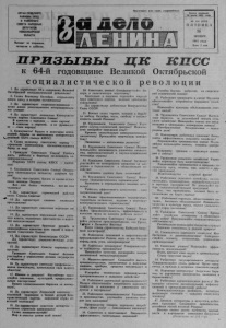 ОРГАН СЕВЕРНОГО РАЙКОМА КПСС И РАЙОННОГО СОВЕТА НАРОДНЫХ Д Е П УТ А ТО В НОВОСИБИРСКОЙ ОБЛАСТИ Выходит по вторникам, четвергам и субботам. П р о л е т а р и и в с е х с т р а н , с о е д и н я й т е с ь ^ Г а з е т а о с н о в а н а 20 июля 193S года № 124 |S2S2| П Я Т Н И Ц А 16 ОКТЯБРЯ 1981 года Ц е н а 2 к о п . Ц К к 64 -й годовщине Великой 4 с о ц и а л и с т и ч е с к о й р е 1. Д а здрав ст вует 64-я годовщина Великой | Октябрьской социалистической революции! 2. Слава Великому Ок т яб рю, открывшему новую э поху в истории человечества! 3- Д а з драв с т вуе т марксизм-ленинизм — вечно жив о е революционное интернациональное учение! 4- Д а з драв с т вуе т ленинская Коммунистическая партия Советс ког о Союза! В единстве с народом — сила партии! В единстве с партией, в ее р у к о в о д с т ве — сила народа! 5. Коммунисты! Будьте в авангарде всенародной б о рь бы за выполнение исторических « ^ реше ни й XXVI с ъезда КПСС! 6. Слава великому с о в е т с к о му народу — с т роит елю коммунизма, последовательному б о рцу за мир! 7. Граждане Со в е т с к о г о Союз а ! Учитесь жить, р аб о т а т ь и б орот ьс я по-ленински, по- коммунистически! Решения XXVI съезда КПСС - выполним! 8. Трудящиеся Со в е т с к о г о Союза! Оз наме нуем одиннадцатую пятилетку ударным т р у дом! ~ Пусть еще сильнее, богаче и краше станет наша великая Родина! Все для блага человека, все во имя человека! 9- Д а з драв с т вуе т героический рабочий класс Страны Советов! 10- Да здр ав с т в уе т славное колхозное крестьянство! 11. Д а з драв с т вует советская народная интеллигенция! 12. Д а з драв с т вуе т нерушимый с оюз р а б о чего класса, колхоз ного крестьянства и народной интеллигенции! 13. Д а з др ав с т в уе т брат с кая д р у ж б а и непоколебимое единство всех наций и наро д ностей Со ве т с ко г о Союз а ! 14. Д а з драв с т вует Конституция СС СР ! Д а здр ав с т в уе т социалистическая д е м о кратия! 15- Д а з др а в с т в ую т Советы народных д е путатов! Граждане Со в е т с к о г о Союз а ! Активно участвуйте в управлении делами го с ударс т ва и о б ще с т в а ! 16- Д а з д р а в с т в уют советс кие профс оюзы — школа коммунизма, влиятельная сила нашего о бще с т в а ! 17. Юноши и девушки! Настойчиво о в л а девайте знаниями, культурой, профе с с иона льным мас т е рс т в ом! Будьте сознательными бо рцами за комму низм !* 18. Д а з драв с т вуе т Ленинский комсомол - - надежный помощник и б оевой резерв Ко м мунистической партии, передовой от ряд с о ветской моло дежи! 19. Д а з др а в с т в уют советские женщины — активные строители коммунизма! Слава женщине- матери! Мир и счастье детям всей земли! 20- Советские воины! Совершенствуйте б о евую и политическую подготовку! Бдительно и надежно охраняйте мирный труд с о в е т с к о г о народа, великие завоевания социализма! Да з др ав с т в уют добле с тные Вооруженные Силы СССР! 2Г Вечная слава героям, павшим в б о рь б е з а победу Октября, честь, с в о б о д у и независимо с т ь нашей Родины! 22. 1Трудящиеся Со ве т с ко г о Союз а ! У с к о ряйте научно-технический прогрес с! Повсеме стно внедряйте передовой опыт! Крепите сознательную коммунистическую дисциплину! Проявляйте т в о рче с кую инициативу! Экономике — интенсивное развитие! 23. Трудящиеся Со ве т с ко г о Союз а ! Полнее используйте во зможно с т и раз витого социализма, производственный и научно-технический потенциал страны! 24- Граждане Со ве т с ко г о Союз а ! Активнее участвуйте во всенародном движении за эк