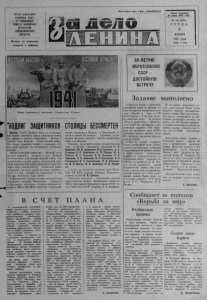 ОРГАН С Е В Е Р Н О Г О РАЙНОМА КПСС И РАЙОННОГО С О В Е Т А Н АРОДНЫХ Д Е П У Т А Т О В НОВОСИБИРСКОЙ ОБЛАСТИ В ы х о д и т по вторникам, четвергам и субботам. П р о л е т а р и и в с е х соединяйтесь! Газета основана 20 июля 1935 года № 146 (5274) С Р Е Д А 9 Д Е К А Б Р Я 1 9 8 1 г о д а Цена 2 коп. П л а к а т х у д о ж н и к а В. А р с е н к о в а . И з д а т е л ь с т в о « П л а к а т » . ПОДВИГ ЗАИЩНТ ИОКВ СТОЛИЦЫ БЕССМЕРТЕН Москва. (Т А С С ) - Пройдут века , но в благодарной пам яти советского народа никогда не померк н у т героизм и доблесть за щи тников Москвы в суровые годы Великой Отечественной войны. В с я страна оказывала помощь и поддержку тем. кто стоял насмерть на легендарных мо сковских рубежах . Победа Советской Армии под Москвой ст ала началом коренного поворота в ходе Великой Отечественной, всей второй мировой войны. Она ознаменовала полный провал гитлеровской стр а тегии молниеносной войны, развенчало перед всем миром миф о непобедимости германской армии, вдохновила с о ветских людей на новые подвиги в труде и в бою, укрепила их уверенность в том, что враг неминуемо будет разбитВ Кремлевском Дворце съездов состоялось тор жественное заседание Московского городского и Московского областного Советов народных деп у т а т о в . МГК и МК К П С С совместно с представителями т р у д я щ и х с я Москвы и Московской обл ас ти и воинов Московского гарнизона , посвя щенное 40 -л етию разгрома немецко-ф ашистских войск под Москвой. Б ур н ым и , продолжительными аплодисментами, стоя , в с тр е ти л и собравшиеся товарищей Л . И. Брежнева, Ю. В . Андропова, В- В- Г риш и н а , А- А. Громыко, А . П . Кириленко, А . Я . Пельше, М. А . Су слова , Н- А- Ти хонов а . Д. Ф . У с т и н о в а , К- У . Черненко, П. Н- Демичева, В . В . Кузнецова- Б- Н- Пономарева, М. С. Соломенцева, И. В . Капитонова, В . И- Дол гих. М. В . Зимянина , К- В- Р у с а к о ваС речью на заседании в ы с т у п и л член Политбюро Ц К К П С С , первый секретарь Московского горкома партии В В . ГришинУ ч а с т н и к и за седания единодушно приняли приветственное письмо Центральному Ком и те т у КП СС , Президиуму Верховного Совета СС СР , Сове т у Министров С С С Р , тов арищу Л- И. Брежнев у . В С Ч Е Т П Л А Н А 6 0 - Л Е Т И Ю 0 Б Р А 3 0 С С С Р Д О С Ю В С Т Р Е Ч Задание В прошлом месяце о досрочном выполнейии плана по продаже мо лока го с у да р с тв у рапортовали ко лхозы «Борьба за мир» и « V I I съезд Советов». А на д н я х пришла радостная вес ть из колхо за « П у т ь к комм унизму» . Животноводы х озя йс тв а справились с нап ряженным заданием. Они отправили на маслозавод более 2 0 0 0 0 центнеров молока, причем около 9 8 процентов продукции продано первым сортом. Сейчас на с к л а д а х хозя йс тв а создан достаточный запас г р у б ы х кормов, что позволяет с о с т ав л я т ь сбалансированный рацион, зн ачи т , и надои остаю тся стабильными- Лидирует в социалистическом соревновании между доярками х о зя йс тв а по-прежнему П . М. Кпв- ган , мастер машинного доения Кордоновской фермы. Она п о л у чила с начала года от каждой ф у ражной коровы по 2 Г»60 ки ло граммов молока. Почти такого же р езул ь т ат а добились 3. Е- А н т и пенок, Л. Е . Мокроусова, М. И. Буевичвыполнено Но не только передовики создают с л а в у колхоза . Рядом с ними т р у д я т с я опытные квалифицированные доярки. При этом подведении итогов соревнования за прошедшие одиннадцать месяцев, ока залось , что 3 3 мастера машинного доения получили от каждой фу раж