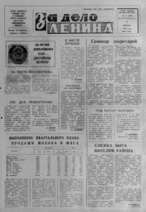 ОРГАН СЕВЕРНОГО РАЙКОМ А КПСС И РАЙОННОГО СОРЕТА НАРОДНЫХ ДЕПУТА ТО В НОВОСИБИРСКОЙ ОБЛАСТИ В ы х о д и т по в т о р н и к а м , четвергам и субботам. П ро л е та р и и всех ст ран, со ед и н я й те с ь ! Газета основана 20 и ю л я 1935 г од а № 15 (5299) П Я Т И И Ц А 5 ФЕВРАЛЯ 198 2 г о д а Цена 2 к о п . 6 0 - Л Е Т И Ю О Б Р А З О В А Н И Я СССР - Д О С Т О Й Н У Ю В С Т Р Е Ч У З А ЧЕСТЬ КОЛЛЕКТИВА г На днях лучшие п р о изв о д ст венники Северного кирпичного з а в о д а вы е зж аю т на областной слет передовиков тр еста «Пром- ст ройматериалов» , который проводится ежегод но. Высокой чести п р ед ставл ять свой коллектив на областном слет е удостоены старший м а стер з а в о д а Н а д е ж д а Петровна Р ы л ь с к а я , обжи г алып и ца Полила Ив ановна Виноградова, садчица Лю дм ил а Терентьевна Артемь ева. Эти женщины по всем я в л я ются примером д ля рабочих кирпичного з а в о д а . У них высок а я дисциплина труда , д о б р о с о вестное отношение к порученному делу. Н едаром обжи г альщ иц а и са дчица выполняют сменные з а д а н и я на 12(К-140 процентов. Г. К У З Ь М И Н А . ДЛЯ НОВОСТРОЕК ЛЕС В этом году в колхозе «Память Ленина» будет вестись большое строительство как производственных помещений, так и жилья. И то, и другое необходимо для дальнейшего ^ развития хозяйства, для укрепления материально - технической базы. Для этих нужд понадобится не менее 1 50 0 кубометров деловой древесины. Колхоз послал в район Перши бригаду лесозаготовителей, которую возглавил М. М. Журавлев. Вместе г ним работают М. С. Парфенов, В. П. Ничков, Володя Тучков, Петр Внуков, Михаил Котелкин. Задание выполняется. Лес поступает на центральную усадьбу колхоза. Вывозкой его занимается тракторист Сергей Михайлович Плотников. А. БЕННЕР, бригадир. В ЧИСЛЕ Л У Ч Ш И Х В колхозе «Восход» десять мастеров машинного доения получили в январе от каждой фуражной коровы более чем но 100 килограммов молока. Особенно высокие показатели в группах доярок Н. Ф. Барковой и Г. С. Блиновой, которые надоили соответственно по 186 и 188 килограммов молока от коровы. Постоянно в числе передовиков значится имя Е. И. Блиновой, которая и в этом году трудится с полной отдачей сил. Н. АНТИПИН, зоотехник. * Равняйтесь на п е р е д о в ы х Ж и в о т н о в о д ы к о л х о з а « Н а ш а Р о д и н а » п р и с т у п и л и к в ы п о л н е н и ю п л а н о в 1982 г о д а . В б р и г а д а х н а ч а л с я р а с т е л к о р о в , п р а в д а , п о к а н е м а с с о в ы й , п о э т о м у и н а д о й з а я н в а р ь с о с т а в л я е т 49 к и л о г р а м м о в м о л о к а о т ф у р а ж н о й к о р о н ы . В Н о в ' о - Н и к о л ь с к о й б р и г а д е р е з у л ь т а т н е с к о л ь к о в ы ш е — 60 к и л о г р а м м о в . А в о т в Б о л ь ш е - К у л и к о в с к о й — в с е г о 14 к и л о г р а м м о в . Н е с м о т р я н а н и з к о е п р о и з в о д с т в о м о л о к а в ц е л о м п о х о з я й с т в у , о т д е л ь н ы е д о я р к и д о б и л и с ь н е п л о х и х у с п е х о в Н а п р и м е р , О . В. П а х т у н о в а п о л у ч и л а о т к а ж д о й ф у р а ж н о й к о р о в ы п о 173 к и л о г р а м м а м о л о к а , В. К . С т а р н и к о в а н а д о и л а п о 134 к и л о г р а м м а . Н е п л о х о п о р а б о т а л и М В. Г у м м е л ь и Н Ф К о л м а к о в а О . СЕМЕНОВА. ВЫПОЛНЕНИЕ КВАРТАЛЬНОГО ПЛАНА П Р О Д А ЖИ МОЛ ОК А И МЯСА Колхозы м о л о к о м я с о план ф а к т . % В Ы П О Л И . n j w w i ф а к т . % В Ы п Н аш а Р о ди н а 1 9 1 0 1 9 3 10,1 3 8 7 140 3 0 , 2 П а м я т ь Ленина 2 0 0 0 4 1 0 2 0 , 5 7 0 0 3 0 2 43,1 им. X X I I съ е зд а КПСС 3 0 5 0 6 1 4 2 0 , 1 7 0 7 2 5 0 3 5 , 4 Восход 1 9 8 0 3 1 6 1 6 , 0 5 1 0 5 0 2 9 8 , 4 Н о в а я жизнь 1 1 5 0 176 1 5 , 3 3 