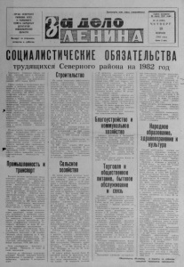 ОРГАН СЕВЕРНОГО РАЙНОМА НПСС И РАЙОННОГО C O R t T A НАРОДНЫХ Д Е П У Т А Т О В НОВОСИБИРСКОЙ ОБЛАСТИ Выходит по вторникам, четвергам и субботам. П р о л е та ри и всех стран, с о е д и н я й т е с ь ! (И i l V / I U Газета о с но в ан а 20 и ю л я 193$ го д а NP 21 ( 5 3 0 5 ) Ч Е Т В Е Р Г 18 ФЕВРАЛЯ 19К2 го да Це на 2 к о п . СОЦИАЛИСТИЧЕСКИЕ ОБЯЗАТЕЛЬСТВА трудящ их ся Северного района на 1982 год Т руд ящ и ес я С еверного рай о н а , как и весь советский народ, в о б стан о вк е высокого политического и т р у д о во го подъ ема р аб о таю т над выполнением решений XXVI с ъ е з д а КПСС. Го'рячо о д о б р я я и п о д д е р ж и в а я внутреннюю и внешнюю политику партии, активную и цел еу ст ремленную д е я т е л ь ность ленинского Ц ентра льного Комитета, Политбюро ЦК КПСС, т р у д о вы е коллективы добились новых усп ехов в хозяйственном и культурном с т р о и тел ьстве в первом году о диннадцатой ■пятилетки, ознаменов али 1981 год дальнейшим развитием общественного производства, повышением его э ф ф е к тивности. Д осрочно выполнен план по произв одству и реа ли з аци и п ромыш ленной продукции. Ж и в о т н о в о ды успешно справились с планом п р о д а ж и мяса. Бо льшой объем р а б о т выполнен строительными орг ан и з ац иям и района. Выполнили социалистические о б я з а тель ств а коллективы предприятий и орг анизаций торговли, тран сп орта , связи н других отр аслей нар одного хозяйств а . Р у к о в о д с т ву я с ь полож ениями и з а дачами , выдвинутыми XXVI съ ездом КПСС, тр у д ящ и ес я района полны решимости озн ам енов ать второй год один н адца той п я ти л етки ударным т р у дом. Все ко ллек тивы сч итают своим патриотическим долгом сохранить н укрепить высокий ритм соревнования . Всесторонне взвесив свои резервы , г о т о в я с ь достойно в стретить 60-л етие о б р а з о в ан и я СССР , тр у д ящ и е с я Северного района принимают сл ед ующие социалистически е о б я з а т е л ь с т в а на 1982 год. Промышленность и транспорт Внедряя научную о р ганизацию т р у д а , исп ользу я резервы производств а на к а ж д о м рабочем месте, эфф екти вн о исп ользу я оборудов ание, повышая к а чество выпускаемой продукции, э к о номно р а с х о д у я сырье и м а тер и алы , государ ств енный план 1982 года по о бъему р еа лизации продукции вып ол нить к 25 Декабря. Д о б и т ь с я роста производительности т р у д а к уровню 1981 года на 2,5 процента. Р е а л и з о в ать св ерх плана продукции местной промышленности на 20(Г тысяч рублей. Снизить себестоимость выпуск аемой продукции на 1 процент, потери р а ■ бочего времени — на 8 процентов. Повысить эффективность использования тран сп о р т а , полнее у д о в л е т в о р я т ь потребность в пер ево зка х н а р о д нохозяйственных грузов и п асс аж и р о в . Д о минимума сок р а т и т ь порожние пробеги и простои автомобилей. Д о биться коэффициента технической г о товности а в т о п а р к а не н иж е 80 п р о центов, коэффициент и сп о л ьзо в ан и я — д о 60, перевезт и автомобильным т р а н с портом 310 тысяч тонн грузо в. П л ан г р у зо о б о р о т а выполнить к -28 д е к а б р я . Увеличить объем перевозок на 6 п р о центов к уровню прошлого года. . З а счет правильной и р ациональной э к с п луа тации ав томобильного п ар к а д о биться экономии ГСМ 200 тонн. План а в т о п е р е в о зо к выполнить к 25 д е к а б р я . Перевезти не менее 12 тысяч п асс ажи ров . Б о р о т ь с я з а о б р а зц о во е с о д е р ж а н и е а в тодорог. П о д н я т ь земельное полотно п р о т яж н о с т ью 4