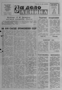 Га з ета основана июля 1935 г ода С Р Е Д А 24 М А Р Т А 1982 года Це на 2 коп, ОР ГА Н С Е В Е Р Н О Г О Р А Й К О М А КПСС И РАЙОННОГО С О В Е Т А Н А Р О Д Н Ы Х Д Е П У Т А Т О В НОВОСИБИРСКО Й ОБЛАСТИ Вы ходи т по вторникам, четвергам и субботам. Пролетарии всех стран, соединяйтесь! В р у ч е н и е Л. И. Бреж неву в ы с ш е й н а г р а д ы Л а о с а Л . И. Б р е ж н е в у в ы с ш у ю н а г р а д у Л Н Д Р — « З о л о т у ю м е д а л ь нации»- Э т о й н а г р а д ы т о в а р и щ Л И- Б р е ж н е в у д о с т о е н в с в я з и с 7 5 - л е т и е м ' со д н я р о ж д е н и я , ( Т А С С ) Г е н е р а л ь н ы й с е к р е т а р ь Ц К Н а р о д н о - р е в о л ю ц и о н н о й п а р т и и Л а о с а , П р е м ь е р - М и н и с т р Л а о с с к о й Н а р о д н о - Д е м о к р а т и ч е с к о й Р е с п у б л и к и К е й с о н Ф о м в и х а н 18 м а р т а в р у ч и л в К р е м л е Г е н е р а л ь н о м у с е к р е т а р ю Ц К К П С С , П р е д с е д а т е л ю П р е з и д и у м а В е р х о в н о г о С о в е т а С С С Р НА X V I I СЪЕЗДЕ ПРОФСОЮЗОВ СССР М о с к в а . ( Т А С С ) . Профс оюзные ор г ан и з ац ии страны полны р е шимости приум ножить свой в к л а д в осуществление планов партии. Об этом з а я в л я ю т д е легаты XVII с ъ е з д а профсоюзов СССР , который 18 м а р та прод о л ж и л раб оту . ^ ^ ^ п ы с т у п л е н и я х п о дч ер к ив ае т ся , что советские люди с о д о б рением восприняли изл оженные в речи то в а р и щ а Л. И. Б р е ж нева на с ъ е з д е новые мирные инициативы, направленны е на о б у здани е гонки вооружений, на со хранение и упрочение в с е общего мира. Речь Лео н и да Ильича р а с см а т р и в а е т с я к а к р а з в е р н у т а я п рограмма сов ерш енст вования социалистической д е м о кратии , у ч асти я профсоюзо в в решении в аж н ей ш и х з а д а ч с о циального и экономического р азв и тия страны . В центре внимания делегатов , о б суж д ающ их отчетные доклады ВЦСПС и Ц ентральной ревизи онной комиссии, — п р а к т и ч е с кое участие профсоюзных орга- пи ■щий в выполнении решений с ъ е з д а КПСС. Орато ры ^ ^ р у к о в о д и т е л и отрас левых и местных профсоюзных органов, раб очие, п р едставители к о л х о з ного кре сть янств а , . общественных о р ганизаций , деяте л и науки и куль туры вносят конкретные. п р ед лож ен ия по улучшению этой работы. В выступлениях д ел ег ато в ста вились вопросы , дальнейшего сов ерш енствования систёмы к о л лекти вных договоров , проблемы распр о с тр ан ен ия передовых м е т о д о в д приемов т р у д а , более полного и спользования вну тр ен них резервов, совершенствования се ль ск охозяйств енной техники , профессиональной подгото вки и идейной з а к а л к и мо лодого п о к о ления рабочего клас са и к о л х о з ного кре сть янств а . На с ъ е з д е о тм е чала сь п осто янно р а с т у щ а я роль проф сою з ных комите то в к олхозов и с о в хозо в. Н а селе профсоюзные а к тивисты ум ело о р г ан и зую т с о ревнования , з а б о т я т с я об у л у ч шении условий т р у д а , развитии жилищ ного строительств а. Высту павшие вносили немало предлож ений , ка сающ ихс я у л у ч шения воспитательной и к у л ь турно -ма ссовой работы профсоюзо в. Воспитательную р а б о т у н е обходимо со средоточить непосредств енно в тр у д о вы х к о л л е к т и в а х , д о б и в а я с ь ак тивн о го учас тия рабочих, колхозников, с л у ж ащ и х в борьбе з а укрепление т р у д о в о й и произв одственной дисциплины. Этим целям п о сл у ж и т а к т и в и з ац и я работы со в етов в етеранов т р у д а , т о в а р и щ е с ких су дов, общес твенных о т д е л о в к а д р о в , еще более широкое дви ж е