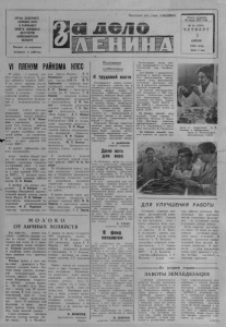 Г а з е т а о сн о в ан а 2 0 июля 1935 года № 4 0 ( 5 3 2 4 ) Ч Е Т В Е Р Г 1 АПРЕЛЯ 1982 г о д а Цена 2 коп. ОРГАН СЕВЕРНОГО РАЙКОМА НПСС И РАЙОННОГО СОВЕТА НАРОДНЫХ ДЕПУТАТОВ НОВОСИБИРСКОЙ ОБЛАСТИ Выходит по вторникам, четвергам и субботам. П р о л е та рии всех с тра н , соед и н я й т е ь ! VI ПЛЕНУМ РАЙКОМА КПСС 30 марта в актовом зале Дома Советов состоялся VI пленум районного комитета КПСС. В его работе приняли участие секретари партийных организаций, председатели сельских Советов и колхозов, техники- строители хозяйств, руководители и специалисты предприятий и механизированных ко- -лонн. Сначала пленум заслушал информацию заведующего организационным отделом районного комитета партии П. Н. Колмакова о выполнении постановления Х-го пленума райкома КПСС or 26 августа 1 98 0 года «О задачах партийных организаций? района по улучшению работы с руководящими кад- ^рамн в свете решений XXV съезда КПСС». По данной информации принято постановление. Далее пленум обсудил вопрос «О состоянии н мерах дальнейшего улучшения строительно-монтажных работ и благоустройства в колхозах района в свете решений XXVI съезда КПСС». С докладом выступил второй секретарь райкома партии Е. А. Багров. В прениях по докладу выст у п и л и : 3. И. Балкина — заведующая Ичкалинской молочнотоварной фермой колхоза имени Карла Маркса, Н. И. Завидов — председатель межколхозной передвижной механизированной колонны, Ф. Л. Нудряшов — секретарь парторганизации колКак известно, личные подсобные хозяйства граждан служат не только хорошим подспорьем для семьи, но и приносят ощутимую пользу государству. Излишки продуктов сельского хозяйства можно реализовать через широкую сеть приемных пунктов. Большая работа в этом направлении ч проводится в Чува- шинском сельском Совете. Особенно нужно отметить Алешинс- кий молокоприемный пункт, которым заведует Галина Алексеевна Владимирова. Старательно работает молодая женщина. Не случайно здесь Закуплено с начала года 39 центнеров молок*. И если учесть, что квартальный план по всему сельскому Совету предусматривает закуп 35 центнеров этой продукции, то видно, какую работу провела Галина Алексеевна среди жителей деревни. Самым активным сдатчиком является учетчик колхоза «Новая жизнь» П. А. Михайлов. хоза «Заветы Ильича», С. С. Кондрашкин — прораб Северного участка ПМК-64, М. П. Трибуналов — секретарь парторганизации колхоза «Восход», А. Н. Савчиц — председатель колхоза им. М. Горького, Г. В. Абрамов — начальник комбината коммунальных предприятий и благоустройства, А. М. Чуркин — начальник управления сельского хозяйства, Г. Н. Хрущев — председатель колхоза «Паша Родина», А. Г. Шадрин — прораб Северного участка Куйбышевского ПМК по механизации трудоемких процессов в животноводстве, В. П. Жоров — главный инженер автотранспортного предприятия «Транссель- хозтехннка», В. М. Груенно — заместитель председателя райисполкома, Ю. П. Колязов — председатель Граясданцевского сельского Совета народных депутатов. В заключение с большой речью выступил первый секпе- гарь райкома КПСС Н. А. Борисов. По обсуждаемому вопросу примято развернутое постановление и утверждены мероприятия, где намечены конкретные меры по дальнейшему улучшению строительно - монтажных работ п благоустройства в колхозах района. В работе пленума также приняли участие инструктор областного комитета КП