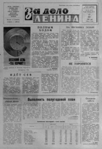 ОРГАН СЕВЕРНОГО РАЙКОМА КПСС И РАЙОННОГО СОВЕТА НАРОДНЫХ Д ЕП УТ А Т О В НОВОСИБИРСКОЙ ОБЛАСТИ Выходит по вторникам, четвергам и субботам. Пролетарии всех стран, соединяйтесь! Г азета основ ана 20 июля 1935 года № 58 (5 3 4 2 ) Ч Е Т В Е Р Г 13 МАЯ 1 9 8 2 года Ц ена 2 коп. П лакат х у д о ж н и к а В, Л и т в и н о в а . И з д а т е л ь с т в о «Плакат». Ф о т о х р о н и к а Т АСС П О Л Н Ы М х о д о м П о с е в н а я к а м п а н и я на п о л я х к о л х о з а и м е н и X X I I с ъ е з д а К П С С и д е т п о л н ы м х о д о м . Из 1100 г е к т а р о в п о с е в н о й п л о щ а д и п о д п ш е н и ц е й у ж е з а н я т о б о л е е 600 П о с е в о в с а п р а к т и ч е с к и з а к а н ч и в а е т с я : о с т а л о с ь ч у т ь б о л ь ш е 200 г е к т а р о в з а с е я т ь э т о й к у л ь т у р о й . У с к о р е н н ы й с е в з е р н о в ы х о б е с п е ч и л и т р а к т о р и с т ы , в е д у щ и е п о д р а б о т к у п о ч в ы . П о - у д а р н о м у т р у д я т с я ч л е н КП С С П. А . А л е к с е е в , М Я. С л о б о д ч и к о в , М . Ф . Б а р а н о в . Т о л ь к о п о х в а л ы з а с л у ж и в а ю т к о м с о м о л ь ц ы м е х а н и з а т о р ы А . В. Д р у з е л е в и ч и В. Н. Я к о в л е в Э т о — в Г р а ж д а н ц е в с к о й б р и г а д е . А в У д а р н и ц к о й — М В. Н еш а т а е в , А А Я к о в л е в , И. Г. С л о б о д ч и к о в , С. И . С м ы к , А . Н. Ф е д о р о в , В. И , Ж е л д а к о в В г о р я ч и е д н и с е в а на п о м о щ ь к о л х о з н ы м м е х а н и з а т о р а м п р и ш л и г а з о в щ и к И. Н. Н а з а р о в , в о д о п р о в о д ч и к И А К о р о т к о в , ш о ф е р ы В. А . Кейль и И. И. В о р о б ь е в . О р г а н и з а т о р ы с о ц и а л и с т и ч е с к о г о с о р е в н о в а ния на в е с е н н е - п о л е в у ю к а м п а н и ю р а з р а б о т а л и у с л о в и я т р у д о в о г о с о п е р н и ч е с т в а , в к о т о р ы х п р е д у с м о т р е л и м е р ы м о р а л ь н о г о и м а т е р и а л ь н о г о п о о щ р е н и я . П о д в е д я и т о г и п е р в о й п я т и д н е в к и , о н и о п р е д е л и л и п е р е д о в и к о в на п о д р а б о т к е п о ч в ы , на с е в е з е р н о в ы х . П е р е х о д я щ и й к р а с н ы й ф л а ж о к на .этот р а з б ы л в р у ч е н т р а к т о р и с т у М . Я. С л о б о д ч и к о в у , в ы п о л н я ю щ е м у е ж е д н е в н ы е н о р м ы в ы р а б о т к и на 150 п р о ц е н т о в А . ВОРОБЬЕВ, с е к р е т а р ь п а р т к о м а . И Д Ё Т П о л н ы м х о д о м и д у т в е с е н н и е р а б о т ы на п о л я х к о л х о з а «П а м я т ь Л е н и н а » . В З а б о е в с - к о й и В е р х - К р а с н о я р с к о й б р и г а д а х - п о с е я н о 650 г е к т а р о в о в с а , ч т о с о с т а в л я е т 30 п р о ц е н т о в о т о б щ е й п о с е в н о й п л о щ а д и . С л а ж е н н о т р у д я т с я м е х а н и з а т о р ы В е р х - К р а с н о я р с к о й б р и г а д ы . О н и у ж е з а в е р ш и л и п о с е в э т о й к у л ь т у р ы на с в о и х п о л я х и т е п е р ь п р и ш л и на п о м о щ ь п о л е в о д а м из З а б о - С Е В е в к и . В о з г л а в л я е т з в е н о а г р о н о м А В. К л е щ е н к о У д а р н ы й т е м п р а б о т во м н о г о м за в и с и т о т т е х н и ч е с к о г о и б ы т о в о г о о б с л у ж и в а н и я т р а к т о р и с т о в , з а н я т ы х на с е в е . На п о л я х р е г у л я р н о п о я в л я е т с я а в т о з а п р а в щ и к . Д в а р а з а в д е н ь п о л е в о д а м д о с т а в л я е т с я г о р я ч е е п и т а н и е . И т о г и с о ц и а л и с т и ч е с к о г о с о р е в н о в а н и я п р и д а ю т с я гл а с н о с т и . Так, п е р в е н с т в о п р и с у ж д е н о з в е н у А В. К л е щ е н к о М е х а н и з а т о р а м в р у ч е н п е р е х о д я щ и й к р а с н ы й в ы м п е л . На ц е н т р а л ь н о й у с а д ь б е к о л х о з а в ч е с т ь н и х п о д н я т ф л а г Т р у д о в о й сл а вы В т о р о е м е с т о з а н я л т р е т и й о т р я д , р а б о т а ю щ и й в А л е к с е е в с к о й б р и г а д е . З д 