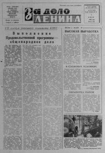 2 • l l l l i l l l l l l l i i i l l l l l l l l l l l l l l i l l l l l l l l l l l H I I I I I I l l l l l l l l i l l l l l l l l l l l l l l U l ’l « ЗА Д Е Л О ЛЕНИНА» i i l l l l l l l l i l l l i i l f l l i i l i l i i i i i i n i i i i H i * f / o 7g ( 5 3 6 3 ) ♦ 1 июля 19б2 года = - - - - V I I п л е н у м р ай о н н о го к о м и т е т а К П С С — — ВЫПОЛНЕНИЕ ПРОДОВОЛЬСТВЕННОЙ (Окончание. Нач. на 1-й с т р ) . п о л о ж и т е л ьн а я р а б о т а колхозо в имени М. Горького, имени ХХП с ъ е з д а КПСС», «Н ов ая ж изнь» , В то ж е время ук а з ан о на несвоевременную вспашку паров к о л х о з ам и «З а в е ты И л ь и ча», «П уть к коммунизму», «V II с ъ е з д Советов», «Борьба з а мир». Сейчас необходимо вести у х о д за посевами, п а р о в ы ми полями. » Оп р ед ел ен н ая р а б о т а * провод итс я в районе по дальнейшему увеличению п р о изв о д ств а кормов. П о вы си лс я уровень орг анизации и спец и ал и з ац ии к о рм опро и з в о д с т в а , ук р епи л ась ма тери а л ь н о - техниче ска я б а з а . во многих х о з я й с т в а х выросла у р о ж а й н о с т ь ко рмовых культур, б о льш е с т а л о вноситься у д о б рений. В р е з у л ь т а т е ср еднегодовы е з аго то в ки грубых и сочных кормов в десятой п я т и л е т к е были на 18 процентов выше, чем в д евято й . Однако д остигнутый уровень к о р м о п р о и з в о д с т в а йо - прежнему о с т а е т с я недостаточным, что с д е р ж и в а е т ра зв и т и е ж и в о т н о во д с т в а . В р яд е к о л хозов , к а к «Восход», «З а в е ты Ильича», « Н о в а я жизнь», медленно реш аются вопросы выделения к о р м о п р о и зво д ств а в с а м о сто я тел ь ную о т р а с л ь и с о з д ан и я г а р а н тир о ванн о й корм овой базы ж и в о тно в о д ств а . Под кормовые ку л ь т у р ы нер ед ко от в о дя т с я х у дш и е земли, мало вносится у добрений , д опус каю тс я серьезные н арушения агроте хники при их возделывании. Планы за г о т о в ки грубых и сочных кормов в отдельных хо зяй с т в а х из года в год не выполняются. Н е получили широкого р а с п р остранения прогрессивные технологии за г о т о в ки и хранения кормов, не у д е л я е т с я д о л ж ного внимания строительству к о рм охранилшц , планы ввода их в д ействие не выполняются . С л а б о решаются вопросы технического перевооружения к о рм о пр о и зв о дс тв а , механиза ции т р у д о ем к их процессов, строи те л ь с т в а п подготовки ко рм о цехов. Сер ьезную озабоченность в ы зы в а е т у к о р е н и вш а я с я во многих х о з яй с т в а х п ракти ка р а с х о д о в ан и я на ф у р а ж н ы е цели значительного количества з ер н а . Отдельны е колхозы сис-. тем ати че ски нс выполняют п ланы н а к о п л ен и я грубых кормов, с т р е м я т с я восполнить их недост а т о к к о н ц ен тр атам и , которые с к а р м л и в а ю т с я с к оту в плохо подготовленном виде, что привод и т к их перерасходу. Пя тилетним планом рай она п редусмотрено к 1985 году дове сти з а г о т о в к у грубых к о р мов д о 400 тыс. центнеров, в том числе сена — до 180 тыс. центне ров, что с о с т а в и т не м е нее 25 центнеров кормовых еди ни ц на условную голову. Местные партийные, советские и сельскохозяйственные органы, колхозы должны осуществить необходимые мероприятия по дальн ейшей интенсификации полевого и лугопастбищного кормопроизв одства , йЬвышению продуктивности всех кормовых угодий с тем, чтобы к а ж д о е хозяйство полностью обеспечив а л о потребности ж и в о т н о водства в высококачественных грубых, сочных и пастбищных кормах . ' Особое внимание необходимо уделить обеспечению сбалансированности ко рмов по белку и Другим компонентам, улучшению к