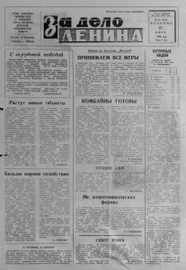 ОРГАН С Е В Е Р Н О Г О РАЙКОМА КПСС И РАЙОННОГО С О В Е Т А НАРОДНЫХ Д Е П У Т А Т О В НОВОСИБИРСКОЙ ОБЛАСТИ Вы ходи т по вторникам, четвергам и субботам. Пролетарии всех стран, сое диняйтесь ! С т р удо вой победой Райком КПСС, райисп олком сердечно п о з д р а в л я ю т р а б о т ников п оле водс тва , сп ециалистов, всех т р уж е н и к о в кол х о з а «З а в е ты Ильича» с тр у д о во й победой — выполнением плана за г о т о в ки грубых ко рмов. На 23 июля в скирды уложено 20 тысяч центнеров сена. З а ло гом у спеха явились о тв етств енность к а ж д о г о з а общее дело, добросовестный, бескорыстный труд, профессиональное маст ерство м е х ан из а т о р о в . Не считаяс ь со врем енем, трудились механизированны е зв ен ья , в о з гл а в ля ем ы е Геннадием Ефимовичем Новиковым и Иваном Петровичем Кочерешко. От всей души же ла ем всему ко л л ек тиву ко л х о з а крепкого зд о р о вь я , личного счастья и дальнейших тр удовых успехов на бла го Родины. Труженики сельского х о зяй ств а ! Приложим все усилия для выполнения п лан а заготовки грубых кормов. РАЙКОМ КПСС Р А Й И С П О Л К О М Р а с т у т н о вы е о б ъ е к т ы Выполняя постановление бюро обкома КПСС «О постановлении Ц К КПСС о д о полнительных мерах по обеспечению в вода в д ействие в 1981 году строящихся мощностей», партийные, с о в е т с кие, профсоюзные и к ом с о мольские органы, трудовы е коллективы предприятий и строительных о рганизаций рай она в прошлом году наме тили и осуществили ряд мер по усилению организаторск ой и ма ссово - политической р а б о ты, концентрации м а т е р и а л ь но - технических и людских ресурсов на вводных о б ъ е к тах. В первом иолугодии 1982 года обеспечен ввод в строй дей ствующих: 12 д в у х к в а р т и р ных жилых домов общей по- . ^ ^ ш о й п лощ адью 1238 к в а д ратных метра, ск л а д минеральных удобрений на 940 ■тонн в кол х о з е «Путь к к о м мунизму», д ве силосных т р а н шеи емкостью 4000 тонн. П лан полугодия по вводу о бъек тов выполнен. За в е з ен о к месту строек необходимое количество песка, щебня и лесом а те р и а л а . Все объекты уком плек тованы бригадами д л я подготовки ж и в о т н о в о д ческих помещений к п р ед сто ящему зимнесто йловому с о д е р ж а н и ю скота . Неплохо р а б о та е т во в т о ром году о д иннадцатой п я ти летки МПМК. План с т р о и тельно - монтажных работ за полугодие выполнен на 117 процентов и по х о зяй ств енн о му способу в кол х о з а х — на 172 процента. Р у к о в о ди т е л я м и сп ец и ал ис там строительных о р г ан и заций, колхозо в, партийным о р г ан и з ац и я м необходимо д е р ж а т ь под неослабным контролем объекты с тр о и тел ь ства, чтобы все п роизвод ст венные з д а н и я и культурно - бытовые помещения ввести в действие в еррк. А. А Н Д Р Е Е В . Б о л ьш е к о р м о в х о з я й с т в а м В исполкоме рай онного С о вета народных д еп у тато в состо ял о с ь совещание р у ковод и телей предприятий, о р г а н и з а ций и учреждений райцентра, на ко тором были подведены некото рые итоги выполнения за д ан и й по з а г о т о в к е кормов. В св я зи со слабым т р ав о - 'стоем -на лугах- и низким у р о ж а ем сеяных тр ав в к о л хо з ах исполком в конце июня .дов ел до к а ж д о г о к о л л ек ти ва за д ан и е : заготови ть определ ен ный объем сена и в еточного корма д ля о бщ ес т венного животноводств а . Большинство руководите лей и партийных организаций, п о нимая в аж н о с т ь данного з а д ан ия , с первого ж е д н я п ри няли самые серьезн