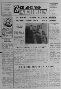 ОРГАН СЕВЕРНОГО РАЙНОМА КПСС И РАЙОННОГО СОВЕТА НАРОДНЫХ ДЕПУТАТОВ НОВОСИБИРСКОЙ ОБЛАСТИ В ы х о д и т по в т о р н и к а м , ч етвергам и субботам. Пролетарии всех стран , соединяйтесь! Г а з е т а о сн о в ан а 20 июля 1935 г о д а № 97 (5 3 8 1 ) Ч Е Т В Е Р Г 12 А В Г У С Т А 1 9 8 2 года Цена 2 коп. I З В Е З Д А Т Р У Д О В О Й С Л А В Ь З А Ж Ж Е Н А В ЧЕСТЬ В. Д К А Р П О В И Ч , Д О Я Р КИ К О Л Х О З А И М Е Н И М . ГО Р Ь К О Г О , Н А Д О И В Ш Е Й С Н А Ч А Л А Г О Д А О Т Ф У Р А Ж Н О Й К О Р О ВЫ П О 2263 К И Л О Г Р А М М А М О Л О К А . Ж И В О Т Н О В О Д Ы ! РАВ Н Я Й ТЕСЬ Н А ПЕРЕ Д О В ИК О В П Р О И З В О Д С Т В А ! ZCCCCCCCCCCCOCCCGCCCCCCOCCCCOU , ПРЕМИЯ ВРУЧЕНА Одно из звен ьев, з а н я т ы х з а готовкой грубых кормов в к о л хозе имени XXII с ъ е з д а КПСС, в о з г л а в л я е т В ладимир Петрович Андреев. Сейчас м е ханизаторы ведут с к и р д о в ан и е сена в 40 ки лометра х ’ от цен тр ал ьно й усадьбы х о зяй ств а . Н е ск о л ь к о дней н а з а д п оле во д ам э того звена была т о р ж е с т венно вручена д е н е ж н а я премия — 100 рублей. П о леводы вы. полнили у сл о в и я социалистического с о р е вн о в ан ия , р а з р а б о т а н ные на п ериод за г о т о в ки кормов. Они см етали более п я ти тысяч центнеров ка че ств енного сена. Н а к а ж д ы й условный т р а к то р уложено в стога по 550 центнеров корм а. Эти п о к а з а т е л и со о т ветс тв уют тр еть ем у месту в т р у довом соперничестве. В успехе звена — з а с л у г а всех м е х ан из а т о р о в . Д о бр о с о ве стн о работали на кос овице Ф. И. Михалевич и А. М. Ш абалди н . Сейчас они т р у д я т с я на п о д р а ботке почвы. На к о п н о о бр а зо в а - т еля х з а н я т ы С. С. Дрючин, А. Н. Сид о р о в и А. В. Л е о н т ь ев. Б о л ь ш о е внимание и с т а р а тельность требуются при сгребании ' в а л к о в . С этцм отлично сп р а в л яю т с я В. П. Д ем ч ихи н и А. В. Б езгин . З а в е р ш а е т процесс с к и р д о в ан и я вершилыцик П. Ю. Суглобов. От него т р е б у е т с я настоящ ее искусство, чтобы стог получился кр асивый, чтобы не пролили его осенние д о ж д и . С л а ж е н н о идет дело в звене. Поэтому д а ж е при нынешнем скудном тра в о с т о е , ме х ан из а то ры сумели д о б и т ь с я высокой вы р аботки на з а г о т о в к е сена . С. М И З Е В , п р е д с е д а т е л ь п р оф к ом а . З а д а н и е выполнено 382 г е к т а р а озимых н у ж н о было п ос е я т ь хлеб о р о бам к о л х о з а «VII съ е з д Советов» . Мы мож ем р ап о р т о в а т ь , что 9 ав густа з а д а н и е выполнили. На севе р а б о т а л о звено передового м е х а н и з а т о р а х о з я й с т в а В. А. К о р ж о в а - Сейчас звено готовит ся к к о с о ви ц е силосных ку льтур. П о л ев о ды з а к ан ч и в аю т сев м н о г о л е т н и х ' тр ав. В. УЗКИХ, се крета рь п артбю ро . НЕ С Н И Ж А Я ТЕМПОВ ЗАГОТОВКИ К О Р М О В , ПОЛНЫМ ХО ДОМ ВЕСТИ У Б О Р К У О З И М Ы Х & В ПЕРВЫХ РЯ Д А Х Иван Григорьевич Арманчев — один из передовых м е х ан из а то р о в ко л х о з а имени К. М аркса. Зимой он сам подготовил к уборочной с т р а д е комбайн и первым к а ча л ко совицу ржи. С каш ив ал он и тимофее вку. Где бы ни т р у д ил с я И. Г. Арманчев , р а б о т а е т он доброс ове стно , вы п о лн я я дело качественно. На снимке: И. Г. А рман чев. Фото А. Ш м аенк о ва П О Р А Б О Т А Л И Н А Д л я ведения уборочных р абот в колхозе « П а м я т ь Лепина» с о з д а н о три у борочно - т р а н с портных комплекса, р у к о в о д я т ко то ры м и опытные механизаторы — это Д . П. Ничков, к о м м у нист А. Н. Сметани н и В. М. П а с ь к о . Д в а из этих комплексов м о ж но н а з в а т ь семейными. Н а п р и , мер, в комплексе, которым р у к о в о 