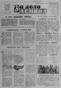 ,'<s=£> ОРГАН С Е В Е Р Н О Г О РАЙКОМА КПСС И РАЙОННОГО С О В Е Т А Н А РОДНЫ Х Д Е П У Т А Т О В НОВОСИБИРСКОЙ ОБЛАСТИ Вы ходи т по вторникам, четвергам и субботам. Г а з е т а основана 20 июля 1935 г о д а _ № 102 (5 3 8 6 ) В Т О Р и и к 24 • А В Г У С Т А 1 9 8 2 года Ц ена 2 коп. НА ВОРТУ КОСМИЧЕСКОГО КОМПЛЕКСА Экипаж из пяти космонавтов, в составе которого впервые работает женщина-космонавт, выполняет запланированные исследования на борту орбитального комплекса «Салют 7» — «Союз Т-5» — «Сою з Т-7». Он начал функционировать в околоземном космическом простр анств е после то го, как в конце дня 20 августа была осуществ лена стыковка космического корабля «Союз Т-7» с орбитальным комплексом « С а т о т - 7 » — «Союз Т-5», пилотируемым Анатолием Березовым и Валентином Лебедевым, и в помещение станции перешли Леонид Попов, Александр С е ре б ро в и Светлана Савицкая. Научная программа полета, рассчитанная на семь дней, предусматривает выполнение а с т р о физических и технических экспериментов, наблюдение и фотографирование земной поверхности в интересах различных отраслей народного хозяйства, проведение большого объема медикобиологических исследований и экспериментов. ( ТА С С ) СОВЕЩАНИЕ УЧИТЕЛЕЙ В ч е р а в 10 ч а с о в у т р а н а ч а л о с ь а в г у с т о в с к о е с о в е щ а н и е у ч и т е л е й С е в е р н о г о р а й о н а . В Д о м е п и о н е р о в с о б р а л и с ь на п р а к т и к у м у ч и т е л я н а ч а л ь н ы х к л а с с о в с р е д н и х , в о с ь м и - ^ т н и х и м а л о к о м п л е к т н ы х ч№ол, р у к о в о д и т к о т о р ы м У . П . Г р и д и н а . С е г о д н я с о в е щ а н и е п р о д о л ж а е т с в о ю р а б о т у . Н а с е к ц и о н н ы е з а н я т и я с о б р а л и с ь п р е п о д а в а т е л и р у с с к о г о я з ы к а и л и т е р а т у р ы , и с т о р и и и о б щ е с т в о в е д е н и я , и н о с т р а н н о г о я з ы к а , м а т е м а т и к и , ф и з и к и , г е о г р а ф и и , ф и з в о с п и т а н и я . На с е к ц и и у ч и т е л е й н а ч а л ь н ы х к л а с с о в с о с т о я л а с ь п л е н а р н а я ч а с т ь . 2 5 а в г у с т а р а й о н н ы й п е д с о в е т н а ч н е т с я с к о м с о м о л ь с к о г о у ч и т е л ь с к о г о с о б р а н и я , а з а т е м в н о в ь н а ч н у т с я з а н я т и я п о с е к Ц и я м . В п я т ь ч а с о в д н я в с т р е т я т с я м о л о д ы е п р е п о д а в а т е л и . П л е н а р н а я ч а с т ь а в г у с т о в с к о г о с о в е щ а н и я у ч и т е л е й с о с т о и т с я 26 ч и с л а . С Д о к л а д о м « О р а б о т е у ч р е ж д е н и й п р о с в е щ е н и я по п о д г о т о в к е к 60 -й г о д о в щ и н е о б р а з о в а н и я С о ю з а С о в е т с к и х С о ц и а л и с т и ч е с к и х Р е с п у б л и к » в ы с т у п и т з а м е с т и т е л ь п р е д с е д а т е л я р а й и с п о л к о м а В . М . Г р у е н к о . З а в е д у ю щ а я р а й о н о Л . П . Ю р е в и ч в ы с т у п и т с д о к л а д о м « О х о д е в ы п о л н е н и я п о с т а н о в л е н и я Ц К К П С С и С о в е т а М и н и с т р о в С С С Р « О м е р а х по д а л ь н е й ш е м у у л у ч ш е н и ю у с л о в и й р а б о т ы с е л ь с к о й о б щ е о б р а з о в а т е л ь н о й ш к о л ы » и з а д а ч а х п о р е а л и з а ц и и р е ш е н и й м а й с к о г о ( 1 9 8 2 г . ) П л е н у м а Ц К К П С С « О П р о д о в о л ь с т в е н н о й п р о г р а м м е С С С Р на п е р и о д | д о 1990 г о д а и м е р а х по е е р е а л и з а ц и и » . М а т е р и а л ы у ч и т е л ь с к о г о с о в е щ а н и я б у д у т о п у б л и к о в а н ы в г а з е т е . З В Е Н Ь Я Н А П О Л Я Х В ко л х о з е «Б о р ь б а з а мир» з а к а н ч и в а е т с я подбор в а л к о в ржи. Хлебная нива нынешнего года н е б о г атая : ■ к а з а л и с ь погодные услови я в летний период. П о э том у и у р о ж а й 