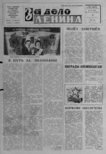 О Р Г А Н С Е В Е Р Н О Г О Р А Й Н О М А К П С С И Р А Й О Н Н О Г О С О В Е Т А Н А Р О Д Н Ы Х Д Е П У Т А Т О В Н О В О С И Б И Р С К О Й О Б Л А С Т И Выходит по вторникам, ч етв ер г ам и субботам. Пролетарии всех стран, соединяйтесь! i № v l u Газе та осн ован а 20 июля 1935 года № 105 ( 5 3 8 9 ) В Т О Р н и к 3 1 А В Г У С Т А 1982 года Цена 2 коп. am im m ,й « м c w w « t П л а ка т х у д о ж н и к а М . Гетмана . И з д а т е л ь с т в о « П л а к а т» В П У Т Ь З А З Н А Н И Я М И З а в т р а начнется новый учебный год. Он будет о знаменов ан в ажны м событием в жизн и всего сов етского народа — 60 -летием со дня о б р а з о в а н и я Союза Сове тских Социалистически х Республик. П о д г о т о в к а к юбилею у ж е н а чата во всех шк олах района. Р у к о в о д с т в у я с ь постановлением Ц К КПСС «О 60-й годовщине о б р а з о в а н и я Союза Советски х Социалистически х Республик», пед агоги призваны в процессе изучения п рограммного м а т е р и а ла. широко п о к а зы в а т ь роль героического рабочего класса КПСС в интернациональном сплочении всех тр у д ящ и х с я , всестороннем прогрессе и с б л и ж е нии наций и народностей, в строительств е к оммунизма ; ярко, Аргументированно п р о п а г ан д и р о вать исторические преимуществ а н д о стиж ен и я со ц и ал и зм а в р е шении сложнейших социально- политических и национал ьных проблем, курс а XXVI съ е зд а на д а л ьн ей ш е е упорядочение д р у ж б ы н ар о д о в СССР , на обеспечение неуклонного роста м а т е р и а л ь н о го и к у ль турного у р о в н я ж и зн и советски х людей; глубок о р а с к р ы в а т ь х а р а к т е р и особенности ф о рм и р о в ан ия и р а з в и т и я новой исторической- общности людей — советского народа, пути д а л ь н е й шего укрепления союза рабочих, к р е с т ь ян , интеллигенции, с б л и ж е ни я наций и народностей ст раны, стано вл ен и я б еск ла ссо вого о бщества ; всес торонне р а з ъ я с н я т ь знач ение Конституции СССР , союзных и ав тономных республик в упрочении п о сл ед о вательного социалистичес кого д ем о к р а т и з м а в о б ла сти н ац и о нальных отношений, во всех с ф е рах ж и зн и общ ес тва ; усилить патриотическое и и н т е р н а ц и о нальное воспитание, п р о п а г а н д и р о в а т ь революционные, боевые и тр у д о вы е трад и ци и К о м м у н и с т и ческой партии, советского н а р о д а , героические свершения В о о р у женных Сил СССР , ф о р м и р о в а т ь у. к а ж д о г о сов етского ш к о ль н и ка у б еж д ен н о сть в п р а в о т е и неколебимости с о ц и ал и зм а , п о л и тиче скую бдительность , г о т о в ность к з ащ и т е Родины, з а в о е в а ний соц и али зм а . К а к видно, з ад ач и , стоящие пер ед % учительством в новом учебном Году, зн ачительны, они т ребую т от учителей глубоких зн ан ий , умения преп однес ти м а т е р и а л доходчиво, ж и в о , умения у в л е ч ь школьника и зучаемой т е мой с тем, чтобы и л- него в о з ник ла и укрепилась т а ж е у б е ж деннос ть , та ж е сознате льность , то ж е понимание советской д е й ствительности, к о торую имеет и сам учитель. Гото вясь к п р азд но в ан ию 60-й годовщины о б р а з о в а н и я СССР, учителя нашего района находят новые формы работы с учащ и мися, совершенствуют старые. Большую и интересную раб о ту с классом проводит учительница Верх - К расноярской средней- школы 3. Н. Овсянко. Особое место в ней занимаю т пионер ские сборы. К а ж д о м у нз них предшествует п р о д у м ан н а я си стема в севозможных мероприятий, цель к о то ры х— включить всех пионеров в ак тивную подготовку . З 
