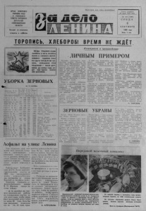 \ ОРГАН СЕВЕРНОГО РАЙНОМА КПСС И РАЙОННОГО СОВЕТА НАРОДНЫХ ДЕПУТАТОВ НОВОСИБИРСКОЙ ОБЛАСТИ Вы х о д и т по в то рн и кам , четве рга м и субботам. Пролетарии всех стран, со единяйтесь: i i t r / i u Г аз е та основ ана 2 0 июля 1935 года № 108 (5 3 9 2 ) С Р Е Д А 8 С Е Н Т Я Б Р Я 1 9 8 2 года Цена 2 коп. ТОРОПИСЬ, ХЛЕБОРОБ! ВРЕМЯ НЕ ЖД Ё Т \'T p a zzcao a oa zzzco osco cco cccccccccczxz33 ccczzzzx^ ^ З В Е З Д А Т Р У Д О В О Й С Л А В Ы З А Ж Ж Е Н А В ЧЕСТЬ К О Л Х О З А ! И М Е Н И М . ГОР ЬКО ГО , В Ы П О Л - ! Н И В Ш Е Г О г о д о в о й п л а н! П О С Д А Ч Е Г О С У Д А Р С Т В У M O - I Л О К А . О Т П Р А З Л Е Н О ЭТОЙ; П Р О Д У К Ц И И 7 ТЫСЯЧ Ц ЕН Т -j НЕРОВ . Д О К О Н Ц А Г О Д А БУ- ! ДЕТ Е Щ Е С Д А Н О О К О Л О ! 1800 ЦЕНТНЕРОВ. ' Z’ Z Z Z Z Z Z Z Z Z & Z Q 2 3 3 2 Z Z Z i t S У Б О Р К А З Е Р Н О В Ы Х на 6 сентября Фамилия, И. О. з в е н ь е в о г о С к о ш е но га П одбор га П р я мое ком б. га g i fО 1 • Колхозы Смертей В. К. 179 216 546 10881 им. К. Маркса Кулнпин В. П. —- 360 610 9658 Путь к коммунизму Харитонов Г. 11. 343 405 437 9611 Аниброев М. Е. 210 173 540 ■9014 им. К. Маркса С ан д зю к В. В. 32 400 530 9409 им. XXII съ е зд а КПСС Санчило Я. Я. 668 668 373 8458 Н аша Р одина Сметанин А. Н. 457 457 302 7410 П а м я т ь Ленина Карп пеонов А. Г. 620 379 7289 VII с ъ е з д Советов Пасько В. М. 639 . 639 244 6992 П а м я т ь Ленина Ничков Д. 11. 485 485 237 6840 -- __ ГрипТрьев В. М. — -- ' 704 6678 За ве ты Ильича Д о р до н о в М. С. 255 300 379 6588 нм. XXII съ езда КПСС Кочергин О. И. 50 50 657 5834 Борьба з а мир ( ^ ’еда К. Д. — — 622 5056 З а в е ты Ильича eiLMOB Г. В. ' -- - 151 292 4987 Восход чгат'ип В. Д. 20 200 376 4960 им. XXII съ е зд а КПСС Ушаков С. Р. 447 447 167 4950 Наша Р одина Курнев , Г. Г. 180 180 190 4943 Н о в а я жизнь Коростелев М. В. 50 50 519 4588 Б о р ьба з а мир Краснов С. Е. 40 108 205 3477 Восход Васильев В. В. 180 180 140 3245 Н о в ая жизнь И ванченко М. Н. 468 46 — 456 ’Путь к коммунизму Ермошкин Н. П. 730 “ * VII с ъ е з д Совето в Асфальт на улице Ленина Уже несколько дней внимание всех жителей Север ного п приезжающих в районный центр из других сел и деревень приковано к улице Ленина: на ней у к л а дывается асфальт. Первые сотни метров а сф ал ьта в районе! Работы ведет Куйбышевский ДСУ-2. Этому дорожно строительному участку па 1982 год запланировано залить асфальто-битумом два километра: от улицы Красной до автобазы райпо. Директор Северного ас фальто-битумного з а в о д а В. И. Шишкин с к а з а л по этому поводу: — К Н сентября мы сможем закончить все работы на планируемом участке, но для этого надо, чтобы з а в од имел постоянный з ап ас сырья не менее 30 тонн. Если бы нам ежедневно подвозили его по 14— 15 тонн, предприятие работало бы без простоев. Не на всем участке имеется щебень. Хотелось бы, чтобы последние 350 метров дороги были засыпаны нм в ближайшие дни. Строительные материалы мы получаем из Куйбышева. Есть у руководителя нового предприятия п претензии к местным органам и организациям: — Несмотря на р а зв еш а н ные и расставленные дорож ные знаки, запрещающие проезд по улице Ленина, здесь не прекращается езда на легковых автомашинах, мотоциклах. З а п р е т введен для того, чтобы не р а з б и в а ли щебенку, чтобы крепче д е рж а л с я асфальт. Слишком доброе отношение сотрудников ГАИ к нарушителям правил дорожного движения вредят делу. А. АРКАДЬЕВ. Коммунист и производство л и ч н ы м ПРИМЕРОМ Т р у д о в а я ' де я т е л ьн о с т ь м е х а н изатора к о л х о з а «П а м я т ь Л е пина» А/^ама Филипповича М а у л я н ачалась в напряженный п р е д военный год, к огда ему еще не было и д в ена дц ати . Тогда з а к р е пили з а ним п ару лошадей , на которых он п а х а л поле, о б р а б а ты ва л землю, 