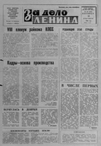 ОРГАН СЕВЕРНОГО 8 РА Й КОМ А НПСС И РАЙОННОГО СОВЕТА НАРОДНЫХ Д Е П УТ А Т О В НОВОСИБИРСКОЙ ОБЛАСТИ Выходит по вторником, четвергам и субботам. Пролетарии всех стран, соединяйтесь! Газета основана 20 июля 1935 год а № 109 (5 3 9 3 ) П Я Т Н И Ц А 1 0 С Е Н Т Я Б Р Я 1 9 8 2 года Ц ена 2 кон. VIII пленум райкома КПСС Со сто ял с я очередной пленум районного к ом и тета КПСС. Пленум рас смотре л д в а вопрос а. С информацией о ходе выполнения п о с т ан о в ления IV пленума районного ком итета партии от 25 с е н т я б р я 1981 г о д а по вопросу «О состоянии органи з ац ио н н о -п ар ти йн о й работы и з а д а ч а х партийных о рганизаций , вытекающих пз решений XXVI с ъ е з д а КПСС», выступил заведующий организационным отделом райкома КПСС П. Н. Колмаков. С д о к л а д о м « З а д а ч и партийных организаций района в дальн ейшем сов ерш енствовании в з а и модействия семьи, школы и тр у д о во го к о л л е к ти ва по воспитанию п о др а стающ его поколения в духе морального к о д е к с а строителей к ом м у низма» выступила второй с е к р е т а р ь районного комитета КПСС В. Т. Боров ска я . В обсуждении д о к л а д а приняли участие И. Ф. Останин — се к р е т а р ь пар тком а колхоза «Путь к коммунизму» , В. М. Смык — п р еп о д а в атель машиноведения Вер х -К рлсноярской с р е д ней школы , Л . П. Юревич — з а в е д у ю щ а я рай онным отделом н ародного о б р а з о в ан и я , Г. Д. Маляревич - п р е д с е д а т е л ь Б ё р гу л ь с к о го с е л ь ского С овета народных д еп у т а т о в , Г. Д. Б а г р о в а — орган и затор внеклассной раб оты Северной средней школы, В. В. Л е те цк ий — директор ССГ1ТУ-21, В. Я. Косс — э кон омис т колхоза « V I t съ е з д Советов», В. И. Л у к ь я н ч у к — первый с е к р ета р ь райкома ВЛКСМ . На пленуме выступил зам е с т и т е л ь з а в е д у ю щего отделом науки и учебных зав ед ен и й о б ластного ком ите та партии В. В. Кислицим. В р аб о те пленума принял у частие с е к р ета р ь о блс овпрофа Н. В. Лобов. С з аключительной речью на п пенуме выступил первый с е к р е т а р ь рай к ом а КПСС Н. Л. Борисов. Пленум р айком а по о б с у ж д а е м о м у вопросу принял постан овление, н котором намечены меры по дальнейшему совершенствованию в з а и модействия семьи, школы, тр у д о во го ко ллектива в вопросах во сп итани я подрастающ его п о к о ления. ' . Кадры-основа производства Планом экономического и социального р азв и тия на 1981— 1985 годы в нашем колхозе пред усм а тр и в а е тс я зн ач ите льный рост п р о и зв о д ств а основных видов с е л ь с к о хозяйственной продукции. Так, к 1985 году производство молока увеличится на 11 п р о центов, мяса крупного р о г а того ск ота на 10,6 процента. З а д а ч а д о стиж ен и я наме чен ных рубеж ей получае т особую значимость в свете П р о д о в о л ь ственной программы, о д о б ренной майским Плен умом Ц К КПСС. Д л я решения ее уж мы квалифицированны е ка дры, и п р еж д е всего ка дры массовых профессий. Н е и с с я каемым источником их я в л я ется наше п о драстающ ее поколение. Поэтому школа, семья, тр у д о вы е ко ллек тивы с т а в я т в центр в о сп ита те л ь ных усилий з а д а ч у — воспит а т ь по др а стающ ее поколение, чтобы они умом и сердцем понимали те пели, которы е ста вит парти я . В н асто ящ ее время большую воспитательную р а б о т у с детьми п роводи т школа. Ш к о л а д е р ж и т постоянную с в я з ь с кол х о зом , В ко л х о з е в о п р о сы профориентации, т р у д о устрой ств а н а х о д я т с я под постоянным вниманием и контролем парти