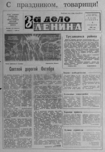 С праздником, товарищи! ОРГАН СЕВЕРНОГО РАЙКОМА КПСС И РАЙОННОГО СОВЕТА НАРОДНЫХ ДЕПУТАТОВ НОВОСИБИРСКОЙ ОБЛАСТИ Выходит по вторникам, четвергам и субботам. П р о л е т а р и и в с е х с т р а н , с о е д и н я й т е с ь ! .1 1 « 7/ 1V г А Г а з е т а основана 20 июля 1935 года № 134 (5 4 1 8 ) С У Б Б О Т А Н О Я Б Р Я 1 9 8 2 года Цена 2 коп. Плакат художника 3. Смехова . Издательство «Плакат». Светлой дорогойОктября С х о р о ш и м н а с т р о е н и е м , в о б с т а н о в к е т р у д о в о г о и п о л и т и ч е с к о г о п о д ъ е м а , в ы з в а н н о г о р е ш е н и я м и X X V I с ъ е з д а К П С С и п о д г о т о в к о й к 6 0 - л е т и ю о б р а з о в а н и я С С С Р , о т м е ч а ю т с о в е т с к и е л ю д и д е н ь р о ж д е н и я п е р в о й в м и р е с т р а н ы с о ц и а л и з м а . Ш е с т ь д е с я т п я т ь л е т п р о ш л о с т е х п о р , к а к т р у д я щ и е с я Р о с с и и , р у к о в о д и м ы е п а р т и е й б о л ь ш е в и к о в во г л а в е с В. И. Л е н и н ы м , с о в е р ш и л и п о б е д о н о с н у ю с о ц и а л и с т и ч е с к у ю р е в о л ю ц и ю . В е л и к и м О к т я б р е м п р о л о ж е н м а г и с т р а л ь н ы й к у р с с о з д а н и я н о в о г о о б щ е с т в а . Е г о п р а в и л ь н о с т ь у б е д и т е л ь н о п о д т в е р ж д е н а с а м о й ж и з н ь ю . С в о е в о с х о ж д е н и е к с е г о д н я ш н и м в ы с о т а м н а ш а с т р а н а , к а к и з в е с т н о , н а ч и н а л а с п р е о д о л е н и я г о л о д а , р а з р у х и и в е к о в о й о т с т а л о с т и . Н е с т р а ш а с ь ни н о в и з н ы з а д а ч , ни т р у д н о с т е й , м о л о д а я С о в е т с к а я р е с п у б л и к а с м е л о в с т а л а н а н е и з в е д а н н ы й е щ е н и к е м п у т ь с о ц и а л и с т и ч е с к и х п р е о б р а з о в а н и й . Т р у д я щ и е с я м а с с ы , в з я в в л а с т ь в с в о и р у к и , п о к о н ч и л и с г о с п о д с т в о м ч а с т н о й с о б с т в е н н о с т и , э к с п л у а т а ц и е й и у г н е т е н и е м , р е ш и л и с а м у ю г л а в н у ю з а д а ч у р е в о л ю ц и и — с о з и д а т е л ь н у ю . Н а р о д , п о з н а в ш и й с в о б о д у и с т о р и ч е с к о г о т в о р ч е с т в а , о с у щ е с т в и л с о ц и а л и с т и ч е с к у ю и н д у с т р и а л и з а ц и ю , к о л л е к т и в и з а ц и ю с е л ь с к о г о х о з я й с т в а , к у л ь т у р н у ю р е в о л ю ц и ю . З а в о е в а н и я О к т я б р я , с о ц и а л и с т и ч е с к о г о с т р о я с о в е т с к и й н а р о д о т с т о я л в с м е р т е л ь н о й б и т в е с ф а ш и з м о м , с п а с м и р о в у ю ц и в и л и з а ц и ю . М у ж е с т в о на ф р о н т а х В е л и к о й О т е ч е с т в е н н о й в о й н ы , с а м о о т в е р ж е н н ы й т р у д в т ы л у б у д у т в е ч н о ж и т ь в н а р о д н о й п а м я т и , в д о х н о в л я я в с е н о в ы е п о к о л е н и я на с л а в н ы е д е л а вс» и м я Р о д и н ы . П р а з д н и к О к т я б р я с т р а н а в с т р е ч а е т в р а с ц в е т е т в о р ч е с к и х с и л . З а 60 л е т , п р о ш е д ш и х с о д н я о б р а з о в а н и я С о в е т с к о г о С о ю з а , п р о м ы ш л е н н а я п р о д у к ц и я у в е л и ч и л а с ь б о л е е ч е м в п я т ь с о т р а з . С о з д а н ы м о г у ч и е и н д у с т р и а л ь н ы е к о м п л е к с ы : т о п л и в н о - э н е р г е т и ч е с к и й , м е т а л л у р г и ч е с к и й , м а ш и н о с т р о и т е л ь н ы й , х и м и ч е с к и й , а г р о п р о м ы ш л е н н ы й . О ч е н ь п р и м е ч а т е л ь н о , ч т о в н ы н е ш н и й ю б и л е й Р о д и н ы н о в о с и б и р ц ы о т м е т и л и 4 5 - л е т и е с о д н я о б р а з о в а н и я с в о е й д в а ж д ы о р д е н о н о с н о й о б л а с т и . С е г о д н я н а ш а о б л а с т ь по у р о в н ю т е х н и ч е с к о й к у л ь т у р ы , по м а с ш т а б а м п р о и з в о д с т в а , по о б ъ е м у и р а з н о о б р а з и ю в ы п у с к а е м о й ' п р о д у к ц и и с т о и т в о д н о м р я д у с в е д у щ и м и п р о м ы ш л е 