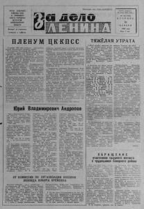 ОРГАН СЕВЕРНОГО РАЙКОМА КПСС И РАЙОННОГО СОВЕТА НАРОДНЫХ ДЕПУТАТОВ НОВОСИБИРСКОЙ ОБЛАСТИ В ы х о д и т по в т о р н и к а м , четверга м и субботам. Пролетарии всех с тра н , с о ед иняйтесь ! й ч ? Л ц * А Газета основана _ 20 июля 1935 го да___ № 138 ( 5 4 2 2 ) В ТОР н и к 16 Н О Я Б Р Я 1 9 8 2 года Цена 2 коп. П Л Е Н У М Ц К К П С С 12 н о я б р я 1982 г о д а состоялся вн е о ч е р е дн о й П л е н у м Центрального Комитета КПСС . П о п о р у ч е н и ю Политбюро Ц К П л е н у м открыл и выступил с речью член Политбюро Ц К КПСС, секретарь Ц К К П С С тов. А н д р о п о в Ю. В. В с в я з и с кончиной Г е н е р а л ь н о г о секретаря Ц К К П С С , П р ед с ед ат ел я П р е з и д и у м а В е р х о в н о г о Совета С С С Р Л . И. Б р еж н ев а члены П л е н ум а Ц К почтили память Л е о н и д а И л ь и ч а Брежнера минутой с к о р б н о г о мол чания. П л е н у м Ц К отметил, что Коммунистическая партия, советский н а р о д , в с е п р о г р е с с и в н о е ч ел о вечество понесли тяжелую утрату. И з жизни у ш е л вы д аю щ и й с я деятель Коммунистической партии Советского го с у д а р ст в а , м еж д у н а р о д н о го коммунистического, р а б о ч е г о и н а ц и о н а л ь н о - о с в о бодит ел ьн о го движения, п л ам енный б о р е ц за мир. Л е о н и д Ильич Брежнев , н а х о д я с ь в р я д а х л е нинской Коммунистической партии б о л е е 50-ти лет, и з них 18 лет на посту е е руков одит еля , вне с о гр о м н ы й в к л а д в у к р е п л е н и е монолитности ее р я д о в , политического, с о ц и а л ь н о - э к о н о м и ч е с к о г о и о б о р о н н о г о мог ущества Советского С ою з а . Иск лючительно в е л и к а е г о р о л ь в у к р е п л е н и и мира межд у н а р о д н о й безопасности. Имя Л е о н и д а И ль и ча Брежнева, с которым непосредственно св язаны в е л и к и е с верш ен и я в жизни нашей страны, — - инду ст ри али заци я и к о л л е кт и в и з а ц и я се льского хозяйства, историческая п о б е д а советского н а р о д а в В е л и к о й Отечественной войне, после во ен н о е во сстановление н а р о д н о г о хозяйства нашей Р о дины, и с с л е д о в а н и е космоса, в с е ■ у с п е х и в р а з в и тии экономики , н а у к и и культуры Советского г о с ударства, н а в с е г д а в о ш л о в историю К о м м у н и с тической партии Советского С о ю з а , нашей в е л и к о й Р о ди н ы . Участники П л е н у м а Ц К в ы р а з и л и г л у б о к о е с о б о л е з н о в а н и е р о д н ы м и б л и з к и м покойн о го . П л е н у м Ц К рассмотрел в о п р о с о б и зб р а н и и Г е н е р а л ь н о г о секретаря Ц К К П СС . П о п о р у ч е н и ю Политбюро Ц К выступил с речью член Политбюро Ц К К П С С , секретарь Ц К К П С С тов. Черненко К. У. Он в н е с п редл ож ение избрать Г е н е р а л ь н ы м секретарем Ц К К П С С тов. А н д р о п о в а Ю. В. Г е н е р а л ь н ы м секретарем Ц ентрального К о м и тета К П С С П л е н у м е д и н о г л а с н о и з б р а л тов. А н д р о п о в а Ю р и я В л а д и м и р о в и ч а , Затем на П л е н у м е выступил Г е н ер а л ь н ы й с е к ретарь Ц К К П С С тов. А н д р о п о в Ю. В. Он в ы р а з и л с е р д е ч н у ю бл а г о д а р н о ст ь П л е н у м у Ц К за о к а з а н н о е в ы с о к о е д о в е р и е — и з б р а н и е е г о на пост Г е н е р а л ь н о г о секретаря Ц К КПСС . Т ов . А н д р о п о в Ю. В. з а в е р и л Центральный Комитет К П С С , Комм унистическую партию, что приложит в с е силы, зн а н и я и жизненный опыт д л я у с п е ш н о г о в ы п о л н е н и я начертанной в р еш ен и я х X X V I с ъ е з д а К П С С п р о г р а м м ы к о м м у н и с тического строительства, обе сп ечен и я преемственности в решении з а д а ч д а л ь н е й ш е г о у к р е п л е ни