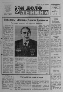 О Р Г А Н С Е В Е Р Н О Г О Р А Й К О М А К П С С И РАЙОННОГ О С О В Е Т А Н А Р О Д Н Ы Х Д Е П У Т А Т О В Н О В О С И Б И Р С К О Й ОБЛАСТИ Выходит по вторникам, четвергам и субботам. Пролетарии всех стран, соединяйтесь! I V Г а з е т а основана 20 июля 1935 года_ № 139 (5423] Ч Е Т В Е Р Г 18 Н О Я Б Р Я 1 9 8 2 года Цена 2 коп. Похороны Леонида ИльичаБрежнева Траурный митинг на К р а сн о й площади С ч у в с т в о м г л у б о к о й с к о о - б и с о в е т с к и й н а р о д 1 5 н о я б р я п р о в о д и л в п о с л е д н и й п у т ь Л е о н и д а И л ь и ч а Б р е ж н е ва — в ы д а ю щ е г о с я д е я т е л я К о м м у н и с т и ч е с к о й п а р т и и и С о в е т с к о г о г о с у д а р с т в а , м е ж д у н а р о д н о г о к о м м у н и с т и ч е с к о г о и р а б о ч е г о д в и ж е н и я , Г е н е р а л ь н о г о с е к р е т а р я Ц К К П С С , П р е д с е д а т е л я П р е з и д и у м а В е р х о в н о г о С о в е т а С С С Р . . . . К о л о н н ы й з а л Д о м а с о ю з о в . В п о с л е д н и й п о ч е т н ы й к а р а у л у г р о б а п о к о й н о г о в с т а ю т р у к о в о д и т е л и К о м м у н и с т и ч е с к о й п а р т и и и С о в е т с к о г о г о с у д а р с т в а . Т р а у р н у ю в а х т у н е с л и ч л е н ы к о м и с с и и п о о р г а н и з а ц и и п о х о р о н . 11 ч а с о в . В з а л е о с т а ю т с я р о д н ы е и б л и з к и е Л. И. Б р е ж н е в а . П о с л е д н и е м и н у т ы п р о щ а н и я . П о д з в у к и т р а у р н ы х м е л о д и й г р о б с т е л о м Л. И. Б р е ж н е в а в ы н о с я т и з К о л о н н о г о з а л а и у с т а н а в л и в а ю т н а а р т и л л е р и й с к и й л а ф е т . К о р т е ж м е д л е н н о н а п р а в л я е т с я н а К р а с н у ю п л о щ а д ь . В т р а у р н о й п р о ц е с с и и з а г р о б о м Л. И . Б р е ж н е в а в с к о р б н о м м о л ч а н и и и д у т р у к о в о д и т е л и К о м м у н и с т и ч е с к о й п а р т и и и С о в е т с к о г о г о с у д а р с тва , ч л е н ы к о м и с с и и п о о р г а н и з а ц и и п о х о р о н , р о д н ы е и б л и з к и е п о к о й н о г о , м и н и с т р ы , о т в е т с т в е н н ы е р а б о т н и к и Ц К К П С С , М Г К К П С С и и с п о л к о м а М о с с о в е т а , п р е д с т а в и т е л и о б щ е с т в е н н о с т и . В п е р е д и п р о ц е с с и и — с о т ни в е н к о в , в о з л о ж е н н ы х в Д о м е с о ю з о в о т Ц К К П С С , П р е з и д и у м а В е р х о в н о г о С о в е т а С С С Р , С о в е т а М и н и с т р о в С С С Р , с о ю з н ы х р е с п у б л и к , к р а е в и о б л а с т е й , п а р т и й н ы х , с о в е т с к и х и о б щ е с т в е н н ы х о р г а н и з а ц и й , . о т т р у д о в ы х к о л л е к т и в о в с т р а н ы . З д е с ь ж е в е н к и о т з а р у б е ж н ы х д е л е г а т ц ий . Н а а л ы х а т л а с н ы х п о д у ш е ч к а х н е с у т с о в е т с к и е н а г р а д ы и н а г р а д ы з а р у б е ж н ы х г о с у д а р с т в , к о т о р ы х у д о с т о е н Л. И. Б р е ж н е в з а с в о ю м н о г о г р а н н у ю д е я т е л ь н о с т ь н а п о с т у р у к о в о д и т е л я К о м м у н и с т и ч е с к о й п а р т и и и С о в е т с к о г о г о с у д а р с т в а . К р а с н а я п л о щ а д ь з а п о л н е н а н а р о д о м . В ч е т к о м с т р о ю — ч а с т и в о й с к М о с к о в с к о г о г а р н и з о н а . Н а д их к о л о н н а м и с к л о н е н ы б о е в ы е з н а м е н а . Т р а у р н а я п р о ц е с с и я о с т а н а в л и в а е т с я у М а в з о л е я . Г р о б с л а ф е т а п е р е н о с и т с я н а п о с т а м е н т . Н а Ц е н т р а л ь н у ю т р и б у н у М а в з о л е я п о д н и м а ю т с я т о в а р и щ и Ю . В. А н д р о п о в , М . С . Г о р б а ч е в , В. В. Г р и ш и н , А . А . Г р о м ы к о , Д . А . К у н а е в , Г. В. Р о м а н о в , Н. А . Т и х о н о в , Д . Ф . У с т и н о в , К. У . Ч е р н е н к о , В. В. Щ е р б и ц к и й , Г. А . А л и е в , П . Н. Д е м и ч е в , В. И. Д о л г и х , Т. Я. К и с е л е в , В. В. К у з н е ц о в , Б. Н. П о н о м а р е в , Ш . Р. Р а ш и д о в , М . С