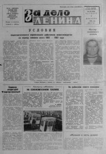 ОРГАН СЕВЕРНОГО РАЙНОМА НПСС И РАЙОННОГО СОВЕТА НАРОДНЫХ ДЕПУТАТОВ НОВОСИБИРСКОЙ ОБЛАСТИ Выходит по в то р н и к а м , четвергам и субботам. У С Л О В И Я социалистического соревнования работников животноводства на период зимовки скота 1982 — 1983 года В ы п о л н я я р е ш е н и я м а й с к о г о ( 1 9 8 2 г ) П л е н у м а Ц К К П С С , р а б о т н и к и ж и в о т н о в о д с т в а р а й о н а на з и м о в к у о б щ е с т в е н н о г о ж и в о т н о в о д с т в а 1 9 8 2 — 8 3 г о д а п р и н я л и п о в ы ш е н н ы е о б я з а т е л ь с т в а : П р и д а в а я в а ж н о е з н а ч е н и е о р г а н и з о в а н н о м у п р о в е д е н и ю з и м о в к и с к о т а , у ч и т ы в а я н а л и ч и е к о р м о в , б ю р о р а й к о м а К П С С , и с п о л к о м р а й о н н о г о С о в е т а н а р о д н ы х д е п у т а т о в и п р е з и д и у м р а й к о м а п р о ф с о ю з а р а б о т н и к о в с е л ь с к о г о х о з я й с т ва о б ъ я в л я ю т с л е д у ю щ и е У с л о в и я с о ц и а л и с т и ч е с к о г о с о р е в н о в а н и я . В с о р е в н о в а н и й у ч а с т в у ю т к о л х о з ы , м о л о ч н о т о в а р н ы е ф е р м ы , д о я р к и , т е л я т н и ц ы , с к о т н и к и д о й н ы х и о т к о р м о ч н ы х г у р т о в . П о б е д и т е л я м и б у д у т п р и з н а н ы : К о л х о з , в ы п о л н и в ш и й п л а н ы п о п р о и з в о д с т в у и п р о д а ж е г о с у д а р с т в у п р о д у к т о в ж и в о т н о в о д с т в а , д о б и в ш и й с я в з и м - " н и й п е р и о д у в е л и ч е н и я н а д о е в м о л о к а , п о л у ч и в ш и й н е м е н е е 1 5 00 к и л о г р а м м о в м о л о к а о т к о р о в ы , в ы п о л н и в ш и й п л а н в о с п р о и з в о д с т в а с т а д а к р у п н о г о р о г а т о г о с к о т а , в т о м ч и с л е и к о р о в , о б е с п е ч и в ш и й с о х р а н н о с т ь ж и в о т н ы х н е м е н е е 98 п р о ц е н т о в , д о б и в ш и й с я с р е д н е с д а т о ч н о г о в е с а о д н о й г о л о в ы н е м е н е е 36 0 к и л о г р а м м о в , п р и ч е м 92 п р о ц е н т а с д а в а е м о г о с к о т а д о л ж н о б ы т ь в ы с ш е й и с р е д н е й у п и т а н н о с т и . П р и п о д в е д е н и и и т о г о в т а к ж е б у д у у ч и т ы в а т ь с я у ч е б а р а б о т н и к о в ж и в о т н о в о д с т в а , с а н и т а р н о е с о с т о я н и е п о м е щ е н и й , с о б л ю д е н и е п р а в и л т е х н и к и б е з о п а с н о е ти . Ф е р м а , д о б и в ш а я с я у в е л и ч е н и я п р о и з в о д с т в а и п р о д а ж и г о с у д а р с т в у ж и в о т н о в о д ч е с к о й п р о д у к ц и и н е м е н е е ч е м на 5 п р о ц е н т о в п о с р а в н е н и ю с у р о в н е м п р о ш л о й з и м о в к и , п о л у ч и в ш а я н е м е н е е 1700 к и л о г р а м м о в м о л о к а о т к о р о в ы , п р и ч е м 100 п р о ц е н т о в м о л о к а д о л ж н о б ы т ь с д а н о п е р в ы м с о р т о м , д о б и в ш а я с я с р е д н е с у т о ч н о г о п р и в е с а о д н о й г о л о в ы к р у п н о г о р о г а т о г о с к о т а н е м е н е е 4 5 0 г р а м м о в , а на о т к о р м е — 6 0 0 г р а м м о в , п р и с о х р а н н о с т и ж и в о т н ы х 98 п р о ц е н т о в . К о л л е к т и в ы * к о л х о з о в , ф е р м , • д о п у с т и в ш и е с л у ч а и п р о и з в о д с т в е н н о г о т р а в м а т и з м а , н е б у д у т у ч и т ы в а т ь с я п р и п о д в е д е н и и и т о г о в . В и н д и в и д у а л ь н о м с о р е в н о в а н и и п о б е д и т е л я м и п р и з н а ю т с я : Д о я р к и , п о л у ч и в ш и е з а з и м н и й п е р и о д н е м е н е е 2 0 00 к и л о г р а м м о в м о л о к а о т к о р о в ы , н е д о п у с т и в ш и е я л о в о с т и ж и в о т н ы х и п а д е ж а н о в о р о ж д е н н ы х т е л я т . У ч и т ы в а е т с я с о с т о я н и е т р у д о в о й д и с ц и п л и н ы и п р о ф е с с и о н а л ь н а я п о д г о т о в к а . С к о т н и к и д о й н ы х г у р т о в , о б е с п е ч и в ш и е н а д о и м о л о к а з а з и м н и й п е р и о д н е м е н е е 175Cf к и л о 