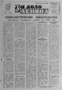 ОРГАН СЕВЕРНОГО РАЙНОМА НПСС И РАЙОННОГО ПОВЕТА НАРОДНЫХ ДЕПУТАТОВ НОВОСИБИРСКОЙ ОБЛАСТИ Выходит по вторникам, четвергам и субботам. Пролетарии всех стран, соединяйтесь! д е л и Г дзета 20 июл я основана 1935 года № 19 (54591 С У Б Б О Т А 1 2 Ф Е В Р А Л Я 198 3 г о д а Цена 2 коп . СОЦИАЛИСТИЧЕСКИЕ О Б Я ЗА Т Е Л Ь С Т В А тружеников Северного района на 1983 год X X V I съезд К П С С пр и н я л последовател ьную программу развития сельского хо з яй с т ва, повышения благосостояния советского человека на одиннадцатую пятилетку Р ешения майского и ноябрьско го (1982 г . ) П л е н ум о в Ц К КПСС , проникнутые г л у бокой заботой о советском человеке, вы зва ли подъем , развитие социалистического соревнования за успешное претворение в ж и з н ь П р о довольственной программы СССР. Т р у д о в ы е кол лективы предприятий и организаций сельского хозяйства, транспорта и за готовок полны решимости увеличить п р о и з водство и закупки п р о д у к тов з е м л е д е л и я и ж и в о т н о водства ор ганизованно пр овести уборку урожая, сократить потери пр одукции при ее транспортировке, хранении и переработке, тем самым обеспечить рост продовольственных ресурсов страны. Тр у ж е н и к и сельского хозяйства района в 1982 году добились определенных успехов в развитии ж и в о т н о водства и полеводства. Доср очно в ыполнены планы по продаже государству молока и мяса.. На иб ол ьш и й вклад в решение П р о д о в о л ьс т в е н ной прогр аммы внесли к о л х озы им М Г о р ь к о г о , «П у т ь к к ом м у н и з м у » , им К. Ма рк са, «Но ва я ж и з н ь » , «Борьба за мир » , « П а м я т ь Ленина » и другие. Вступая в третий, сердцевинный, год одиннадцатой пятилетки, тружени ки района, развернув действенное социалистическое соревнование, берут на себя п овыше нные обязательства. П О П Р О М Ы Ш Л Е Н Н О С Т И , И Т Р А Н С П О Р Т У На основе максимального и сп о ль зован и я ре зе рвов , в н ед рения научной организации труда и у пра в ления обеспечить дальнейший рост эффективности производства. Добиться роста п р о и з в о д и тельности труда на пр ом ы ш ле н ном предприятии к у р о в ню 1982 года на 3,0 пр оцента, за счет чего увеличить объем валовой п р омыш л ен ной продукции на 3,0 пр оцента. У лучш и ть ее качество За вершить план по реализации пр омыш л енной пр оду кции к 25 декабря 1983 года Сверх плана будет п р о и з ведено на 95 тыс. рублей пр омыш л енной продукции За счет роста п р о и з в о д и т е л ь ности труда прирост о б ъ е мов производства составит 85 процентов. О б ъ ем выпуска товаров народного потр ебл ения составит 2100 тыс. рублей. О б ъем выпуска товаров соцкультбыта и х о з я й ственно го обихода — 10 тыс. рублей Повысить эффективность и с по ль зован и я транспортных средств, пол нее у д о в л е т в о рять потребности в п е р е в о з ках на роднохозя йственных гр у з о в и пассажиров Д о биться коэффициента технической готовности автопарка не ниже 80 процентов , к о эффициента и с по ль зован и я — до 50 процентов, перевезти а втом обил ьным транспортом 300 тысяч тонн г р у з о в План п ер ево зок выполнит ь к 25 де кабря, увеличить объем пер е в о зо к на 4 процента к уровню п р ош ло го года За счет правильной и рациональной эксплуатации автом оби л ь ного парка добиться эконо мии г о р ю ч е - смазочных материалов 200 тонн. Бороться за обра зцовое содержание автодорог. П о д нять зем е л ь н о е полотно п р о тяженностью 6 километров , произвести щебеночное по крыти