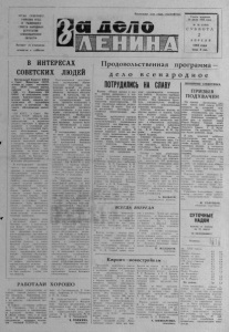 П Р Г А Н С Е В Е Р Н О Г О Р А И Н О М А К П С С И Р А Й О Н Н О Г О С О В Е Т А Н А Р О Д Н Ы Х Д Е П У Т А Т О В Н О В О С И Б И Р С К О Й О Б Л А С Т И Выходит по вторникам, четвергам и субботам П р о л е т а р и и в с е х с т а а н . с о е д и н я й т е с ь ! т в ь и ш в а н н а в ш а г Газе та основана _20 июля 1935 го д а № 40 (3480 ) С У Г) Б О Т А а п р е л я 1983 г о д а Ц ена Я коп. В ИНТЕРЕСАХ СОВЕТСКИХ ЛЮДЕЙ Центр альный Комитет КПСС и Совет Министров СССР, исходя из з а д а ч , п оставлен ных XXVI съ ездом партии, майским и ноябрьским (1982 г.) Пленумами ЦК КПСС по неуклонному повышению благосостояния советских людей, приняли постановление «О дальнейшем развитии и улучшении бытового обслуживания населения». . Ц К КПСС и Совет Министров СССР о б я з а л и п а р тийные и советские органы, министерства и ведомства усилить внимание к вопросам р а зв и т и я и ул учшения д е я тельности предприятий быто вого о б с л уж и в а ни я , п р о я в л я т ь постоянную з а б о т у об укреплении . м а тери альн о -те х нической базы этой в ажной отрас ли народного х озяй ств а , о созд ании современных пред приятий службы быта. Осуществить мероприятия, н а п равленные на более полное у довле творени е спроса сов ет ских людей на бытовые услуги, повышение ка че ств а п куль туры обслуживания . В постановлении подчеркиваетс я , что главными н а п р а в лениями в р азвитии бытового о б с л уж и в а н и я д олж ны быть: расширение услуг по восстановлению потребительских свойств н ах о д ящ и х ся v н а селения изделий (ремонт р а диоте левизионной а п п а р а т у ры, бытовых машин и при- .боров, мебели. обуви и о д еж ды , стирка белья , хими-' в е с к а я чистка в ещей) ; удов- л етворе.ще потребностей н а селения в условиях п а р и к махерских, бань, фото ат ел ье , а т е л ь е проката предметов длительного п оль зов ан и я : и з гото вление по з а к а з а м населения изделий, отличающихся высоким качеством. П р е д л о ж е н о принять меры к внедрению новых видов быто вых услуг и прогрессивных форм обслужи вани я , к расширению сети комплек сных приемных пунктов и вы с о ко р азр ядны х предприятий бытового обслужи вани я ; обеспечить в комплексных приемных пунктах и д ом а х бытовых услуг, р аспо л ож ен ных в сельской местности, прием з а к а з о в на все виды услуг, ока зыв аемы х предпри ятиями бытового о б с л у ж и в а ния, расположенными на территории соотв етс твующ его района; п родолжи ть со вершенствование р еж им а р а боты предприятий бытового о б с л уж и в а н и я с тем, чтобы он был наиболее удобен д л я т р у д ящ и х ся . РАБОТАЛИ С хорошими п о к аз а тел ям и з а кончил первый к в а р т а л к о л л е к тив общепита. Выполнены п л а ны по общему т о в а р о о б о р о т у и по выпуску собственной п р о дукции. В буфете гостиницы р а б о т а е т Е. Т. Смета нина. Она с у в а ж е нием относится к п окуп ателям , не н а р у ш а е т правил торговли. В общем успехе есть и ее д о л я труда . В числе пер едовик ов на предприятии н а зы в а ю т к о л л е к тив столовой ССПТУ-21, поПостановленнем предусмотрены мероприяти я, обеспечивающие безу словное вы полнение з а д ан и й по ст рои те льству и вводу в действие объек тов бытового о б с л у ж и в ания . В частности, при пересмотре проектов п лан ир о в ки административных рай онов, проектов планировки и з ас тр о йк и населенных пунктов в сельской местности п р е д у см а тр ив ать в них с оору ж ени е предприятий бытового о б с л уж и в а ни я . Н еобходимо за в е рш
